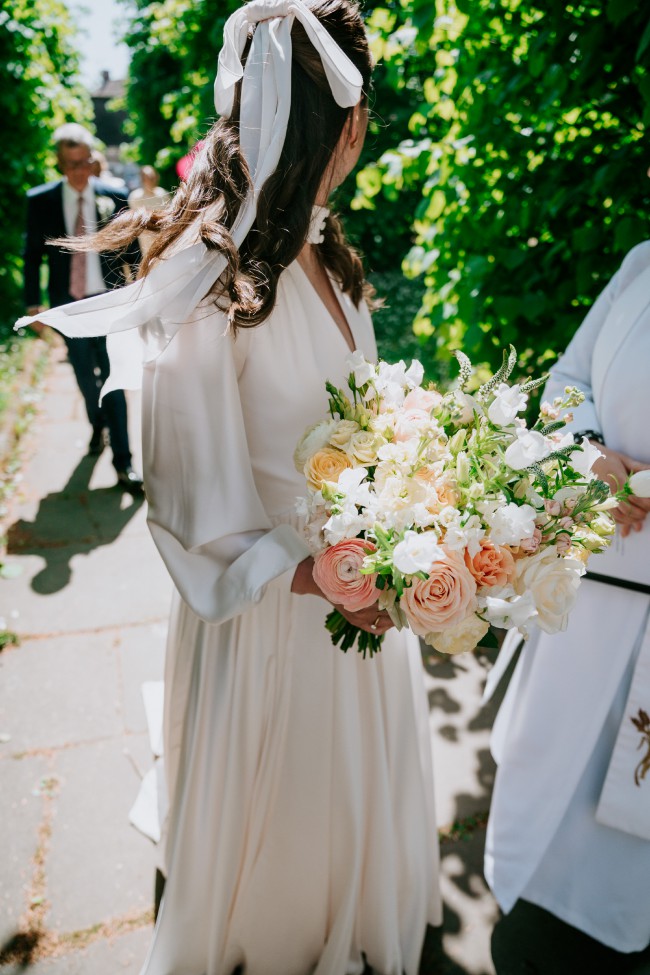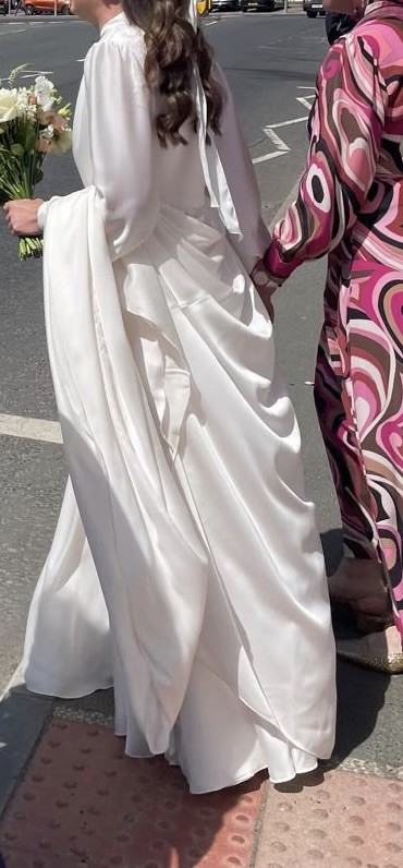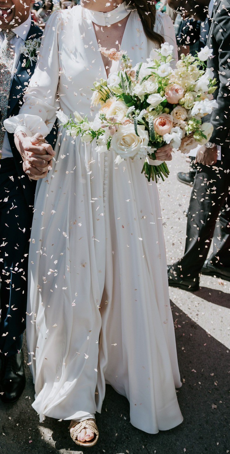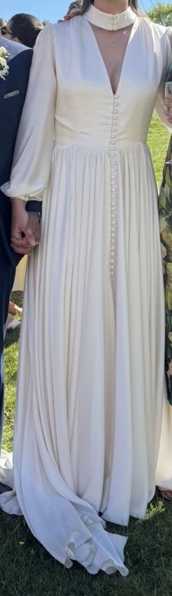 This stunning custom-made Nortier Shallow wedding dress captures the magic of my special day in a way that words can hardly express. With its perfectly tailored A-line silhouette, it gracefully flatters every figure, making you feel radiant and effortlessly beautiful. The enchanting V-neckline with a unique collar adds a touch of authenticity, while the high back provides just the right amount of elegance and sophistication. There are soft loop buttons at the front of the collar and all the way down the front of the corset and skirt.