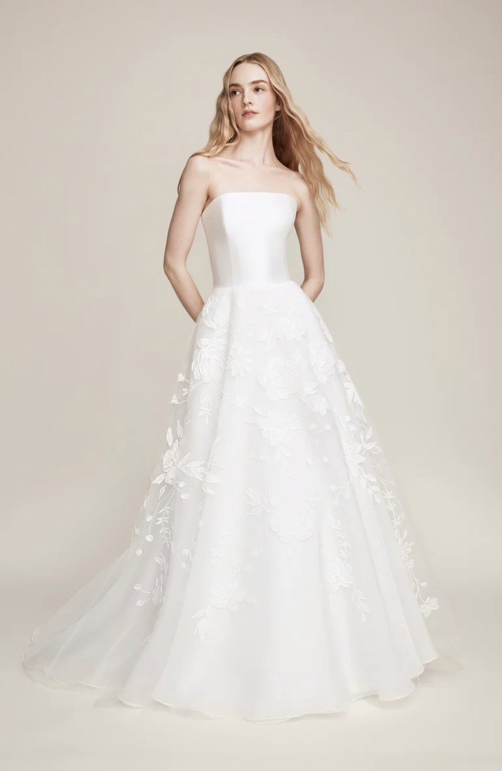 The Lela Rose Holland gown is from the Spring 2025 bridal collection. It is a strapless, A-line dress featuring hand-painted tulle and a magnolia-detailed bodice. Known for its romantic yet modern design, this gown showcases floral appliqué, a soft white color, and a voluminous, lightweight silhouette that epitomizes, elegant, artistic bridal style.