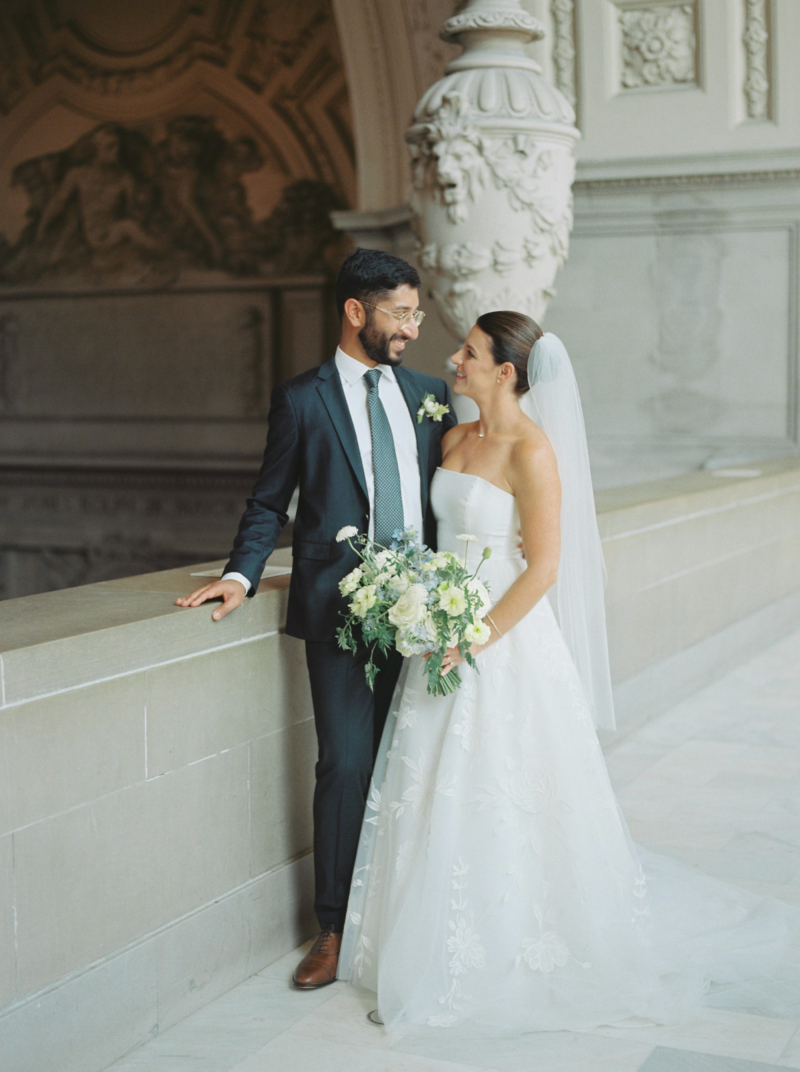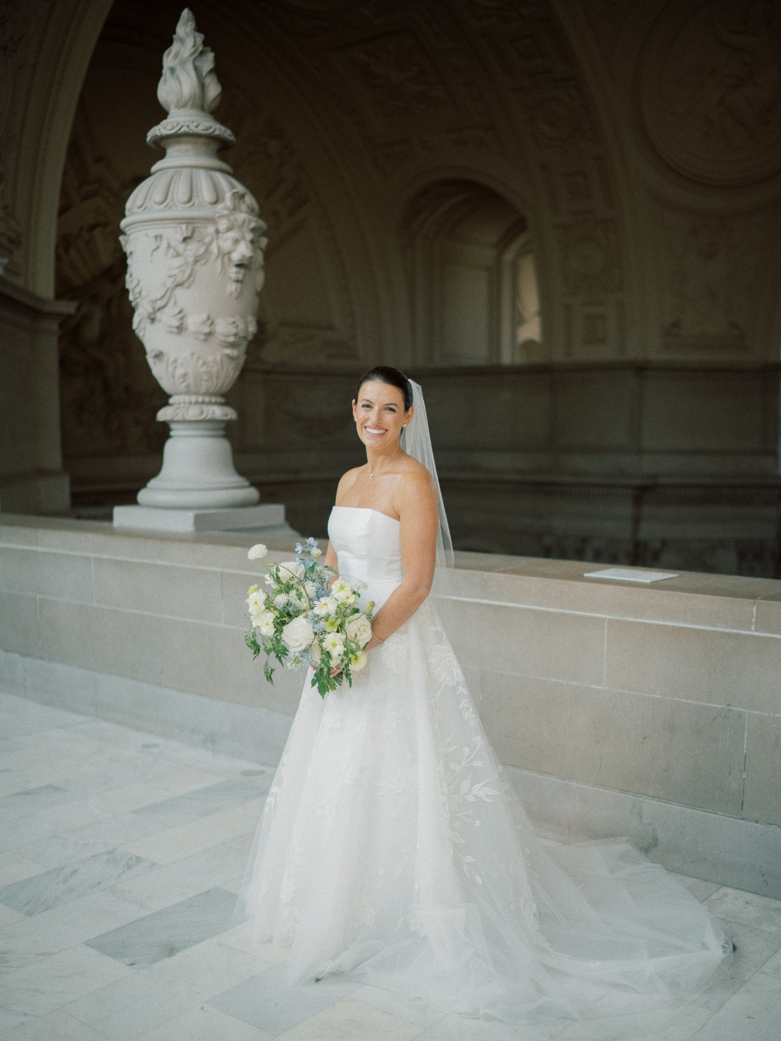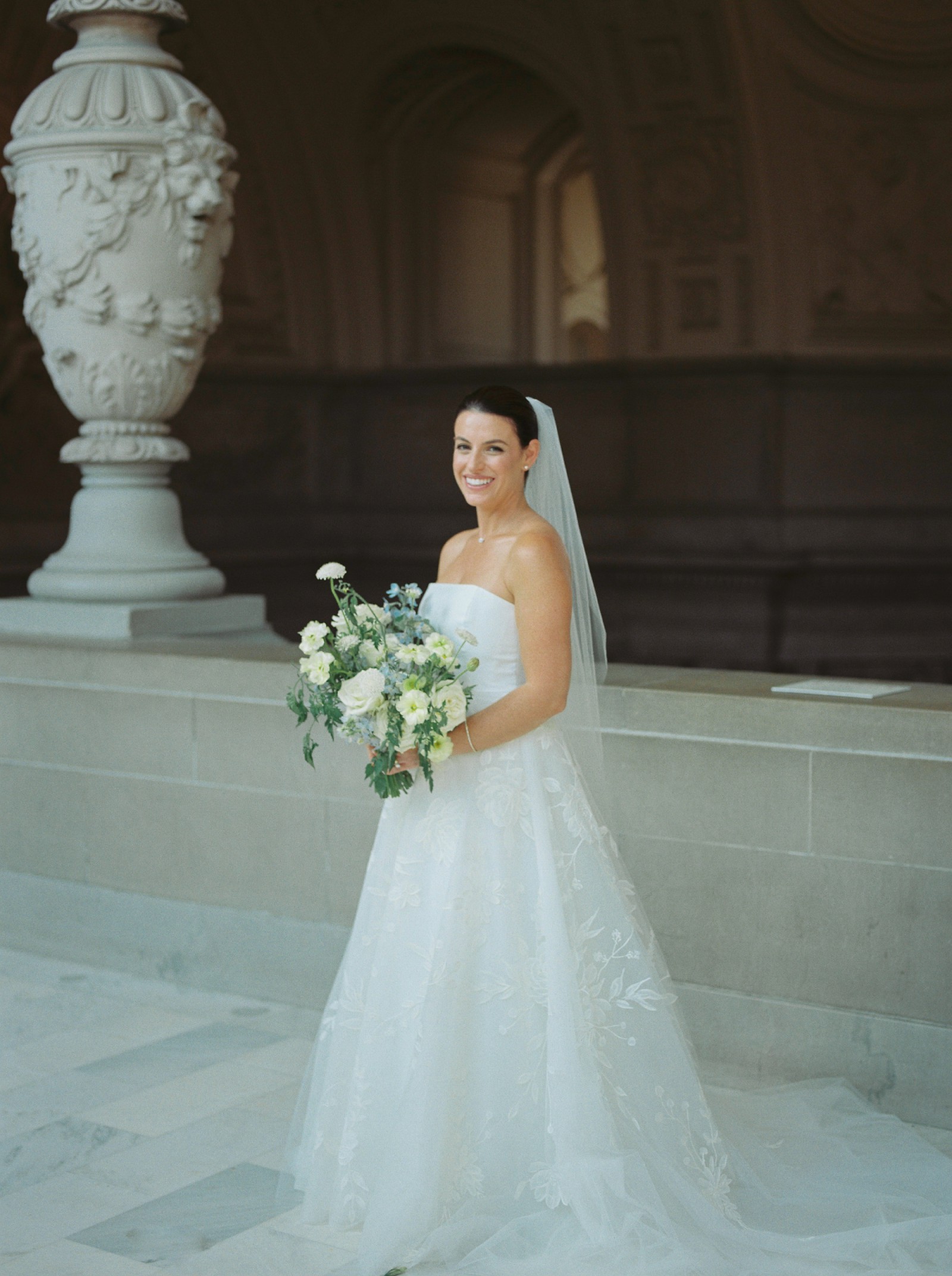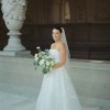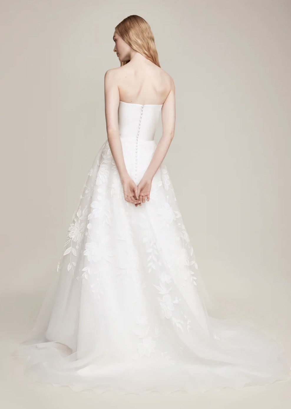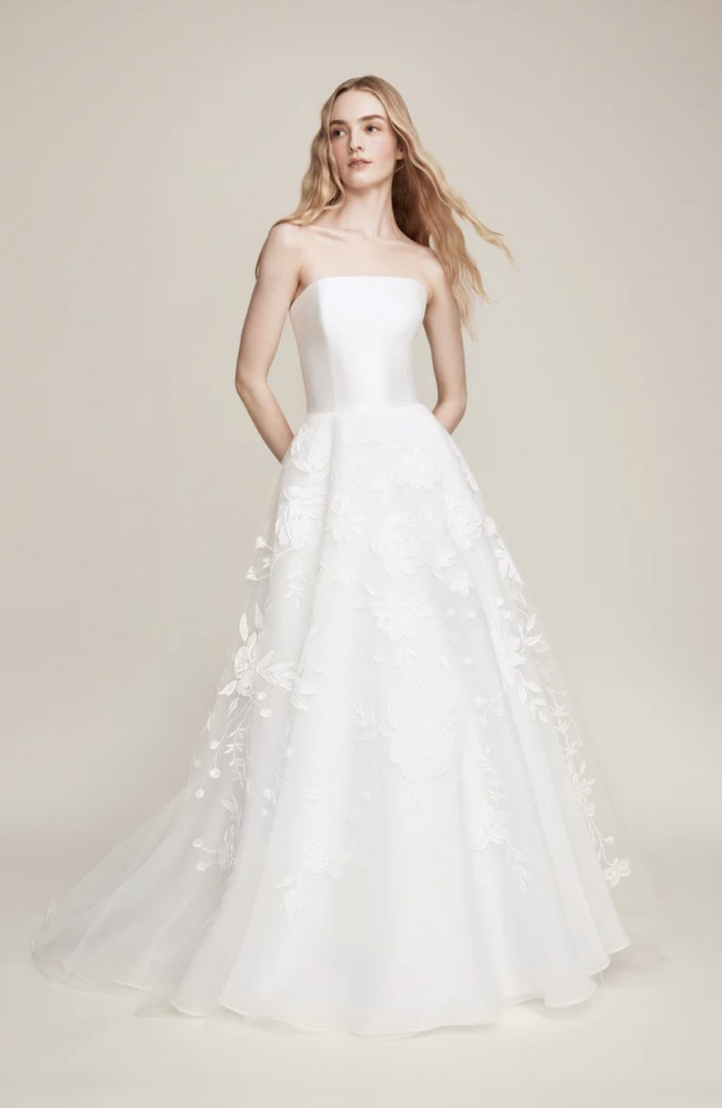 -Design: A strapless A-line silhouette with a distinct magnolia-inspired bodice.