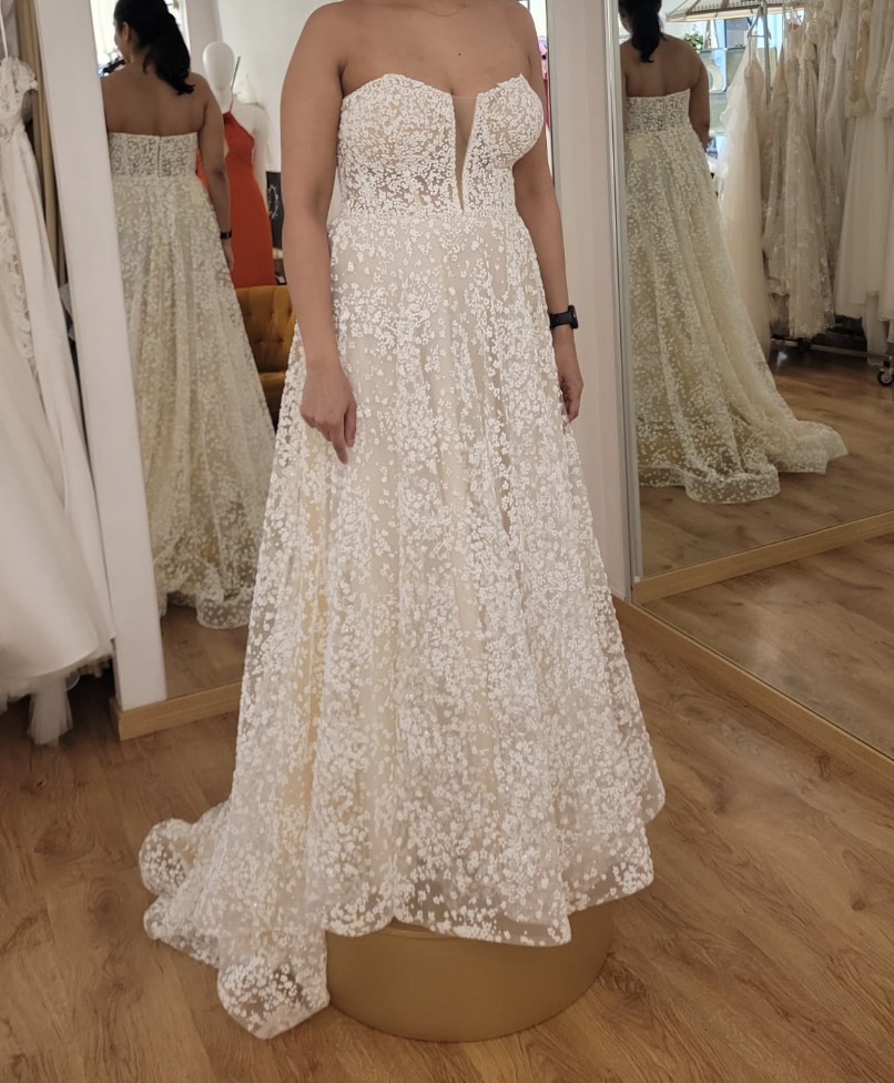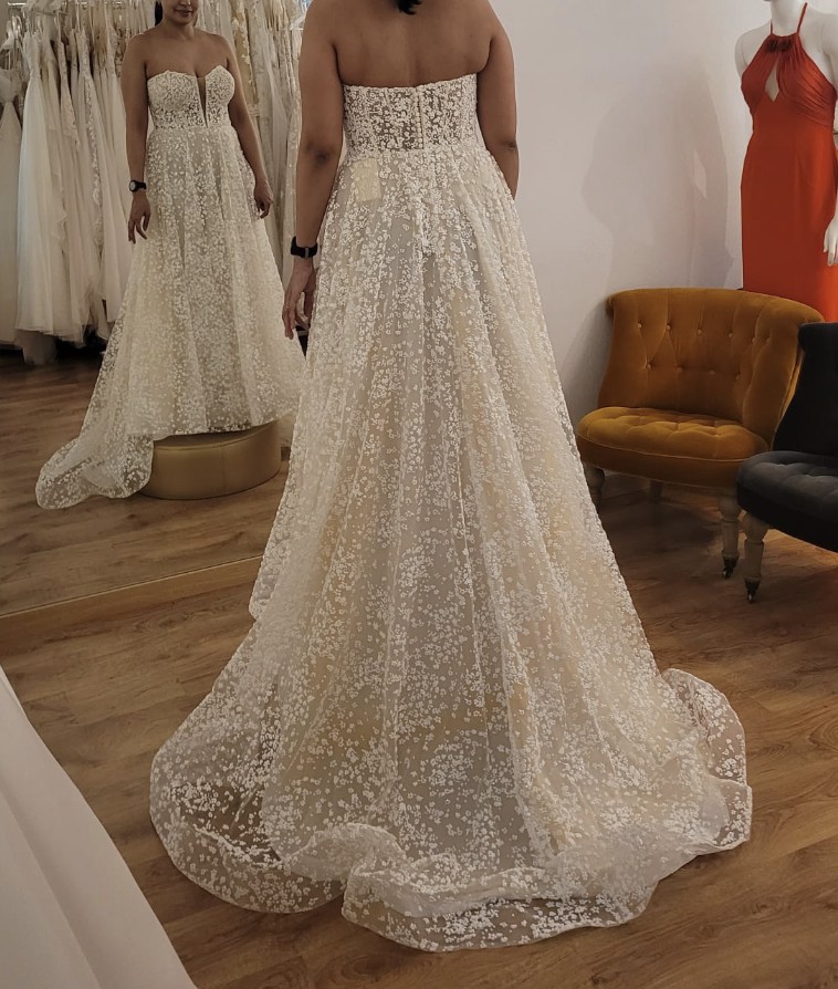 Crafted from high-quality materials, this floor-length gown flows gracefully, creating mesmerising movement with every step. The strapless feature gives the freedom to dance the night away without a worry. This dress has been meticulously cared for and is in excellent condition, ready to make another bride's dreams come true. If you're looking for a dress that combines classic charm with modern design, the Mindy is the one. I can’t wait to pass on the joy of wearing this beautiful gown.