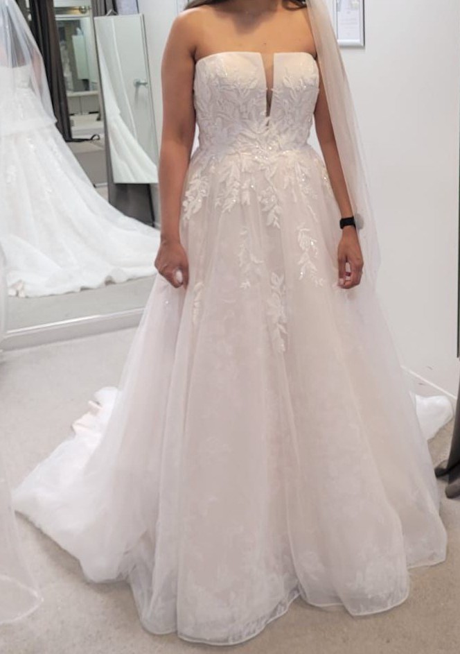 This stunning Wed2b wedding dress is the perfect blend of elegance and romance. The A-line silhouette gracefully skims the figure, providing a flattering fit that ensures you feel as beautiful as you look on your special day. The enchanting V-neckline adds a touch of allure while maintaining a classic charm, perfect for any bride seeking to make a statement.