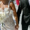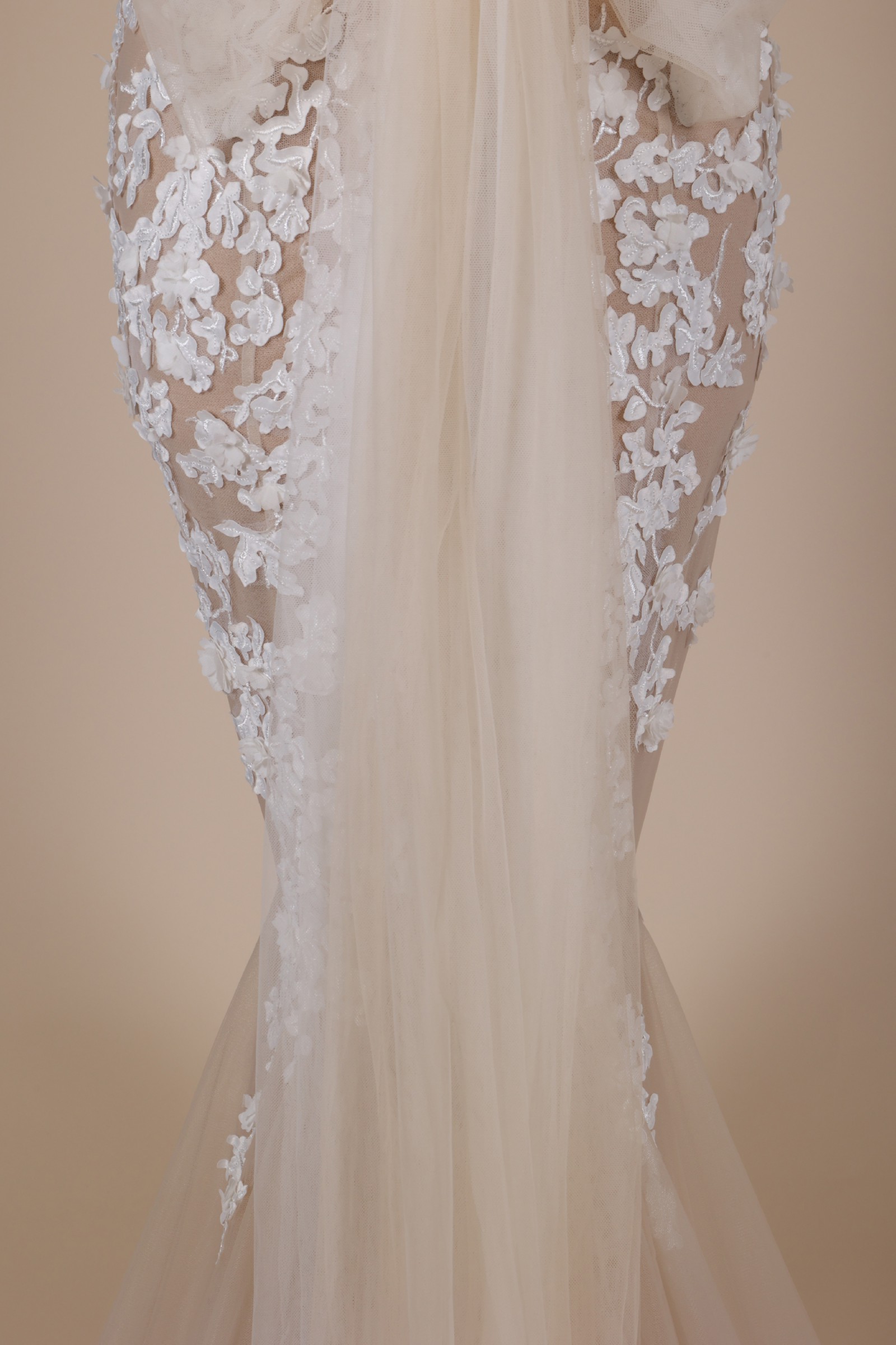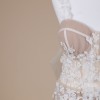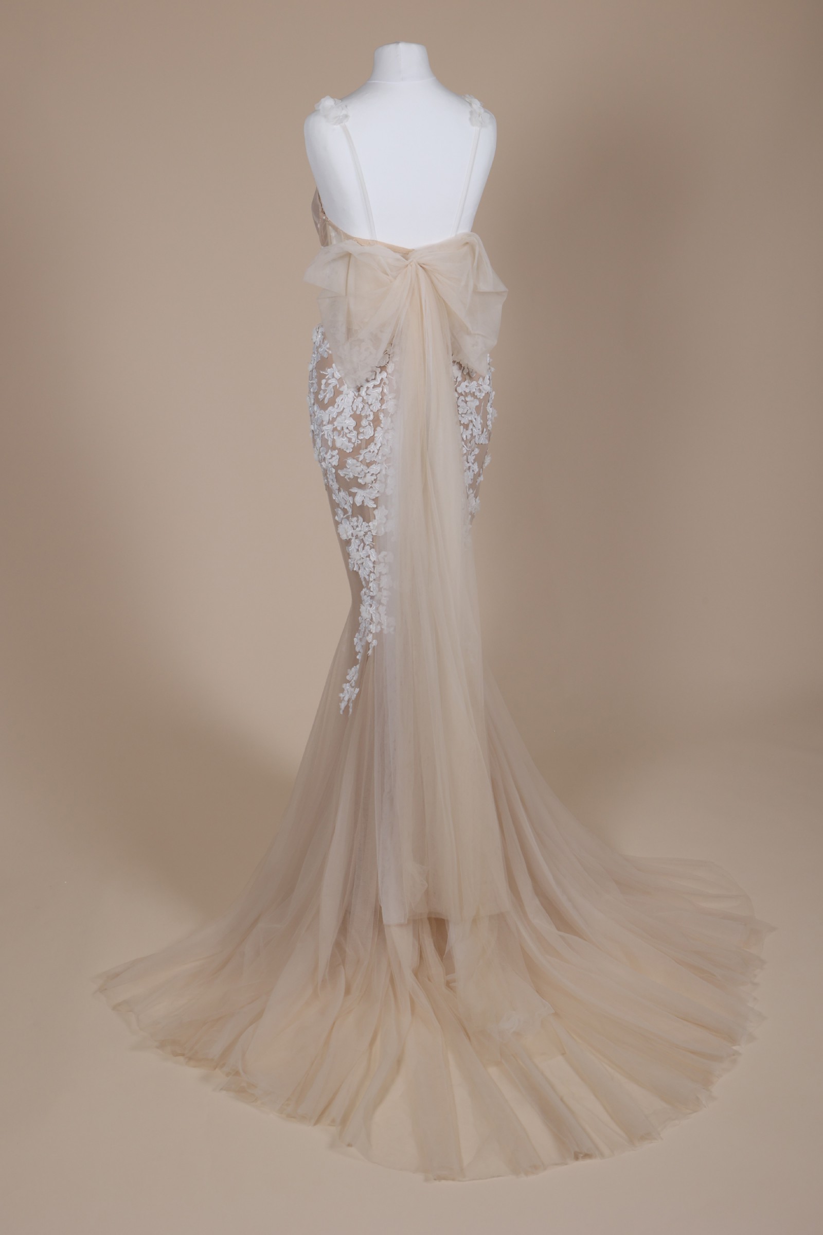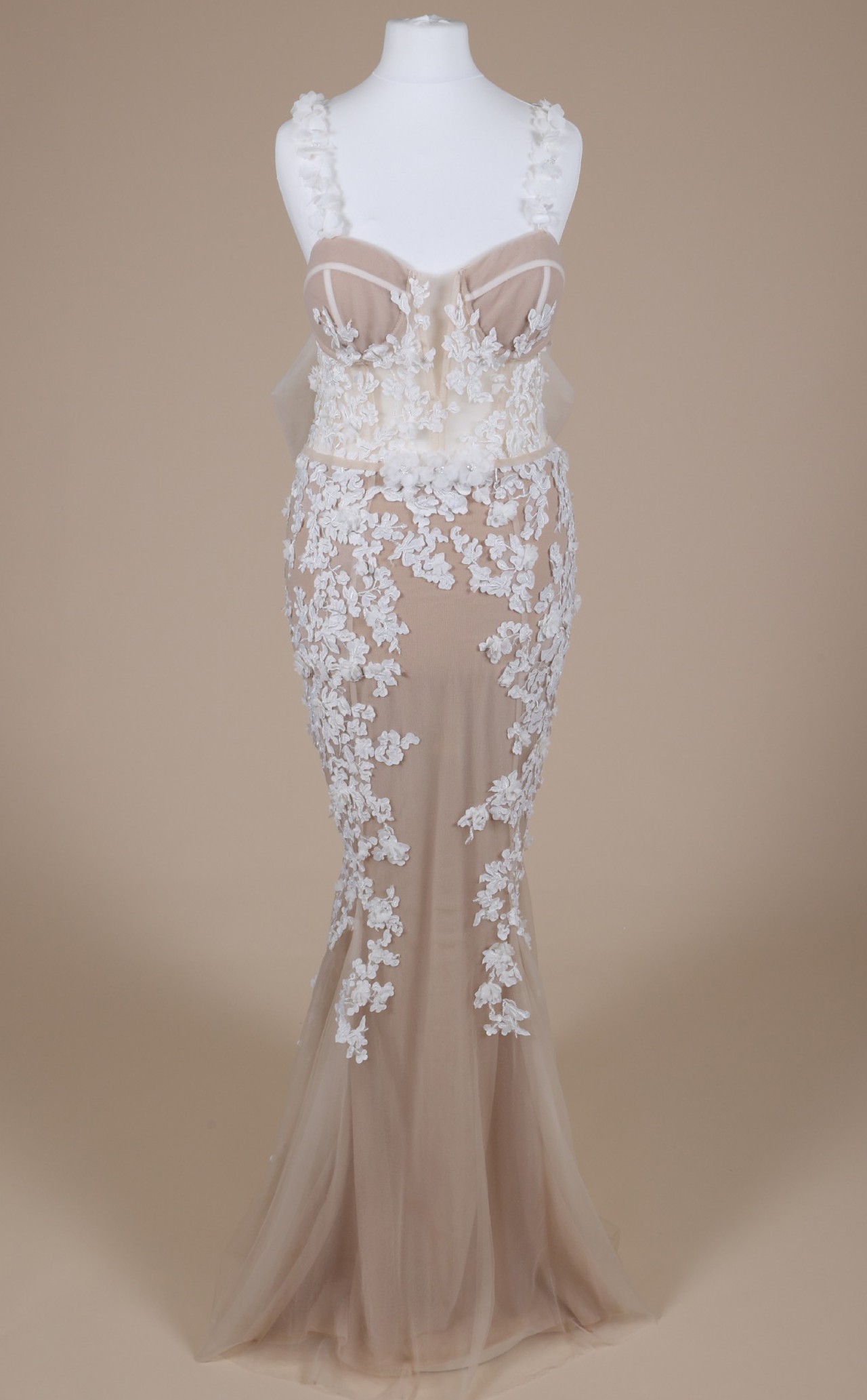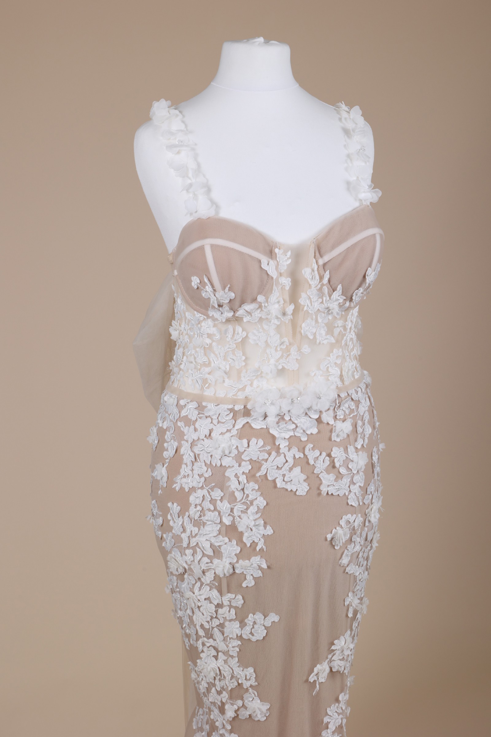 Matching 3D floral spaghetti straps bring a light, organic touch to the neckline, complementing the gown’s