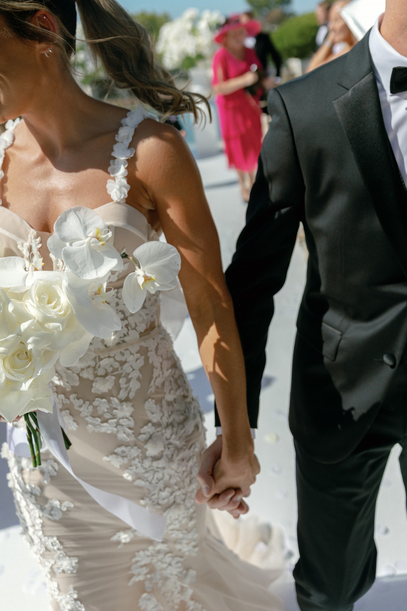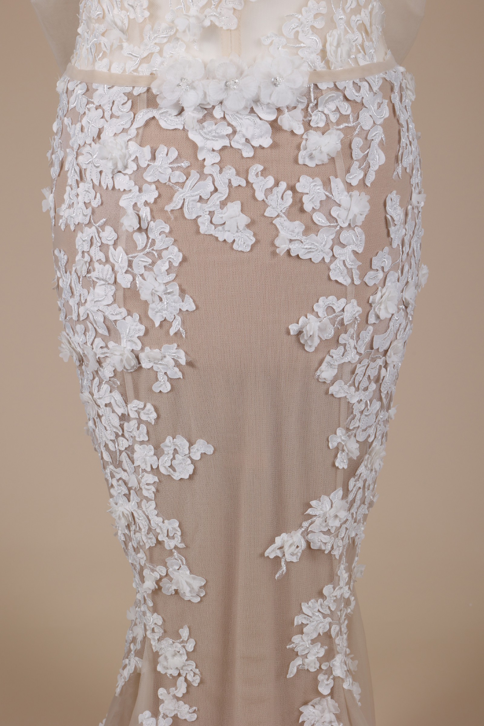 clean, sculpted look that feels both modern and delicate. White 3D floral appliqués and embellishments
