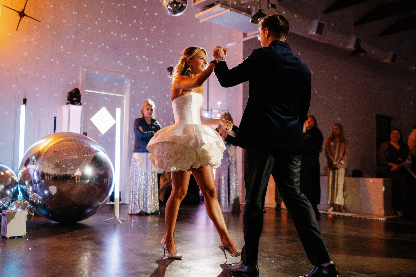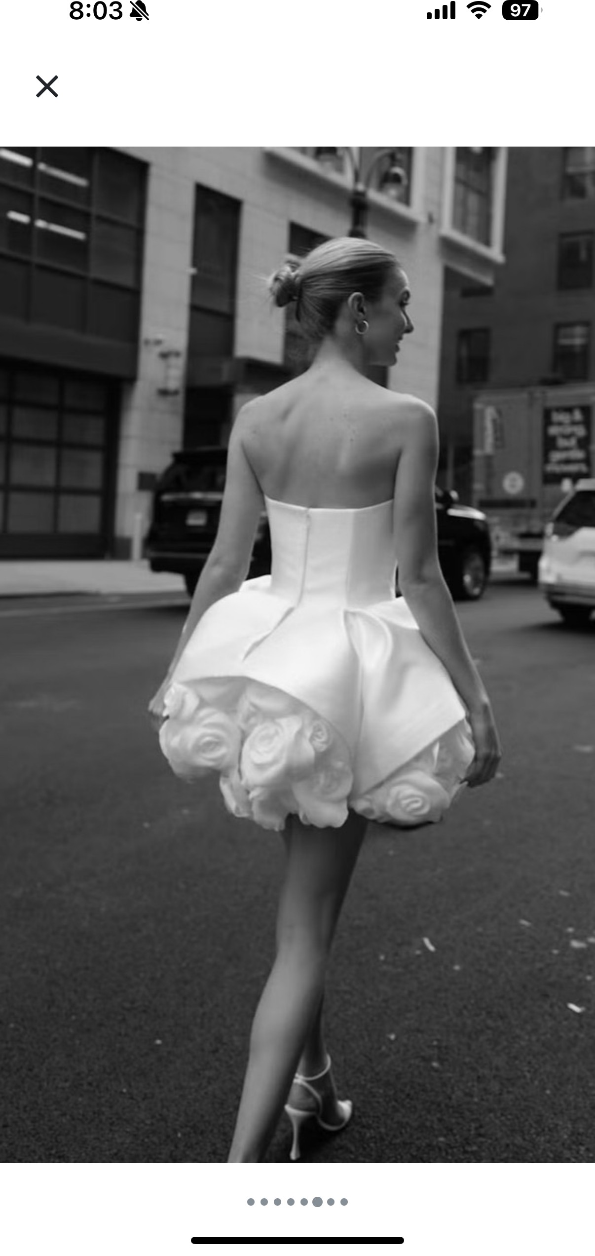 This stunning Nicole + Felicia mini dress has a structured Mikado bodice, hand crafted silk roses, and a full skirt. It is playful, classic, and sexy and is a perfect look for your second look, rehearsals dinner or bachelorette, and more. It has been dry cleaned, is in perfect, unaltered condition, and is ready to be loved by a new bride. ❤️