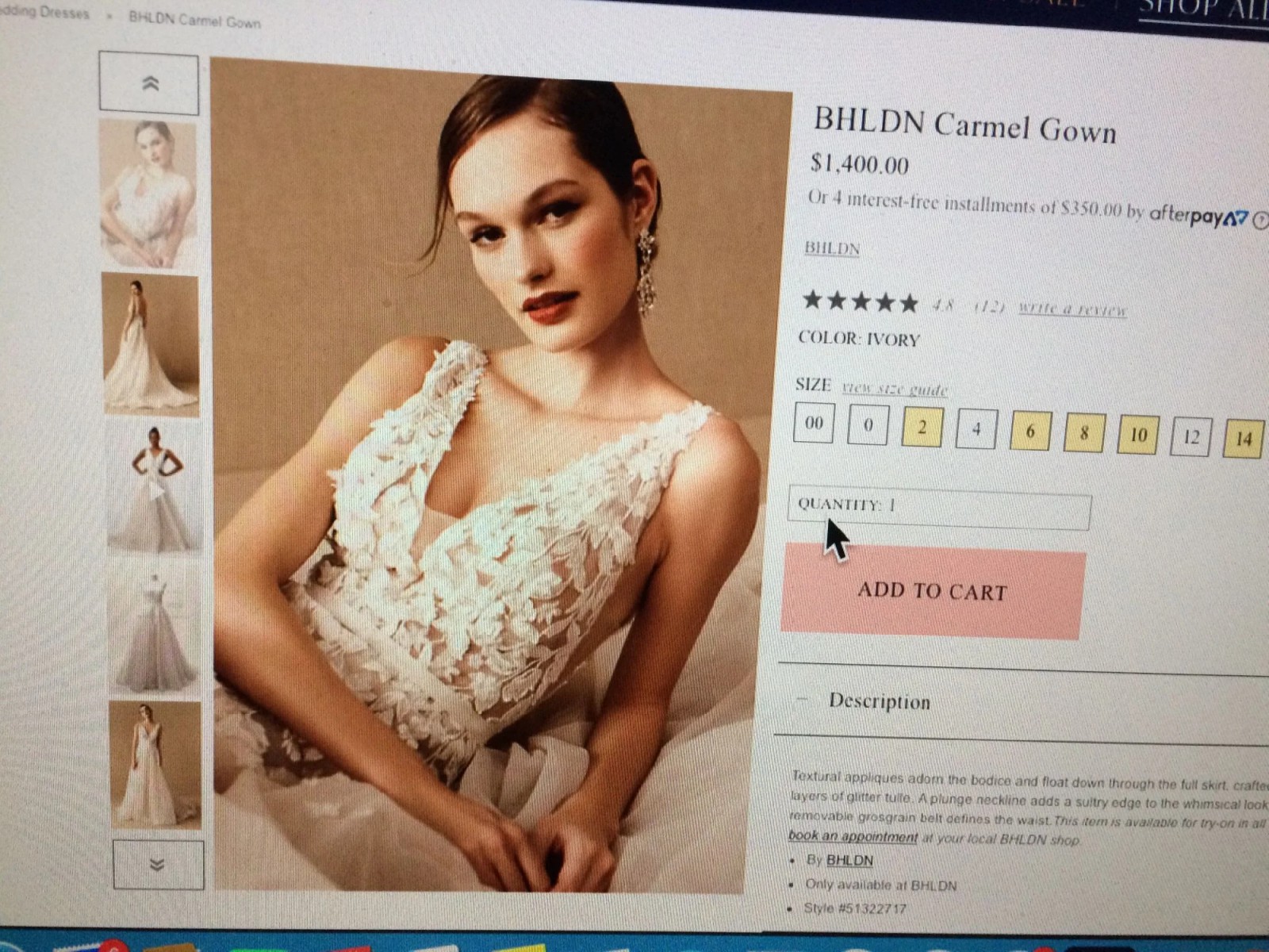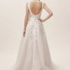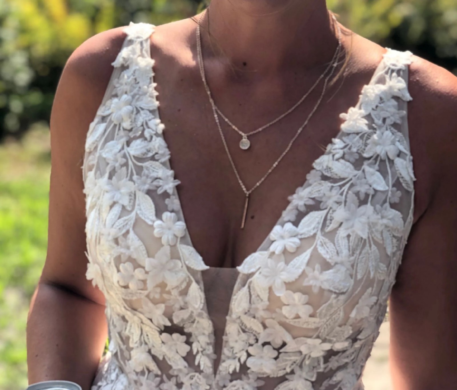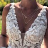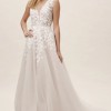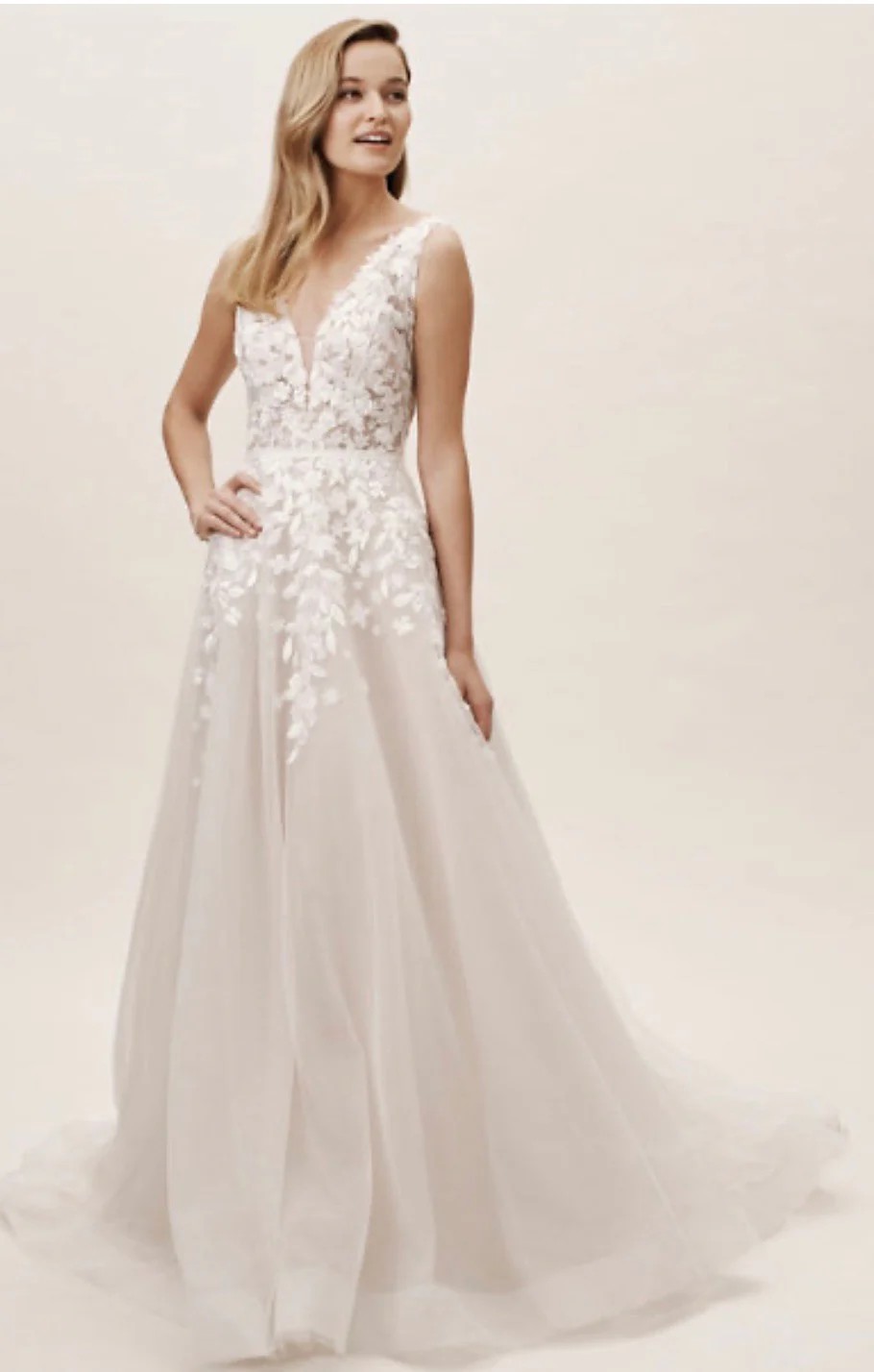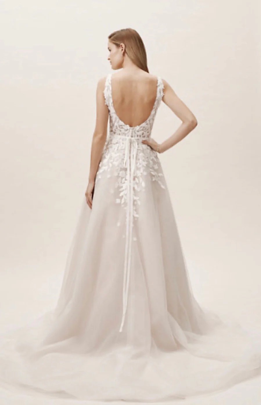 Anthropologie BHLDN Carmel Wedding Dress. Size 6. No Alterations. V Neck front. sides, and back. Textural appliques adorn bodice, float down full skirt. A Plunge neckline add a Sultry edge to Whimsical look. Professionally Dry Cleaned in Box. At Anthropologie, you can go & try on this dress.