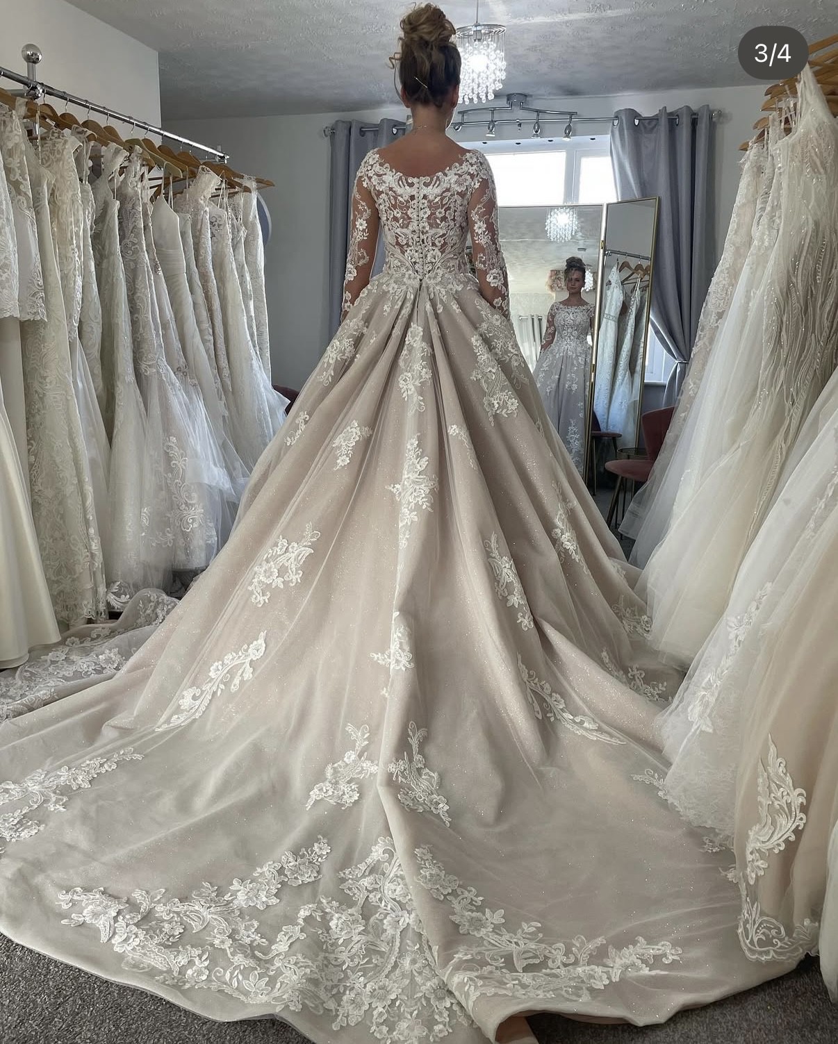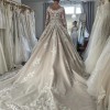 BRAND NEW. Ivory over nude, with crystals underneath. Beautiful fitted long sleeves, sewn in cups, inner corset with some visible boning.