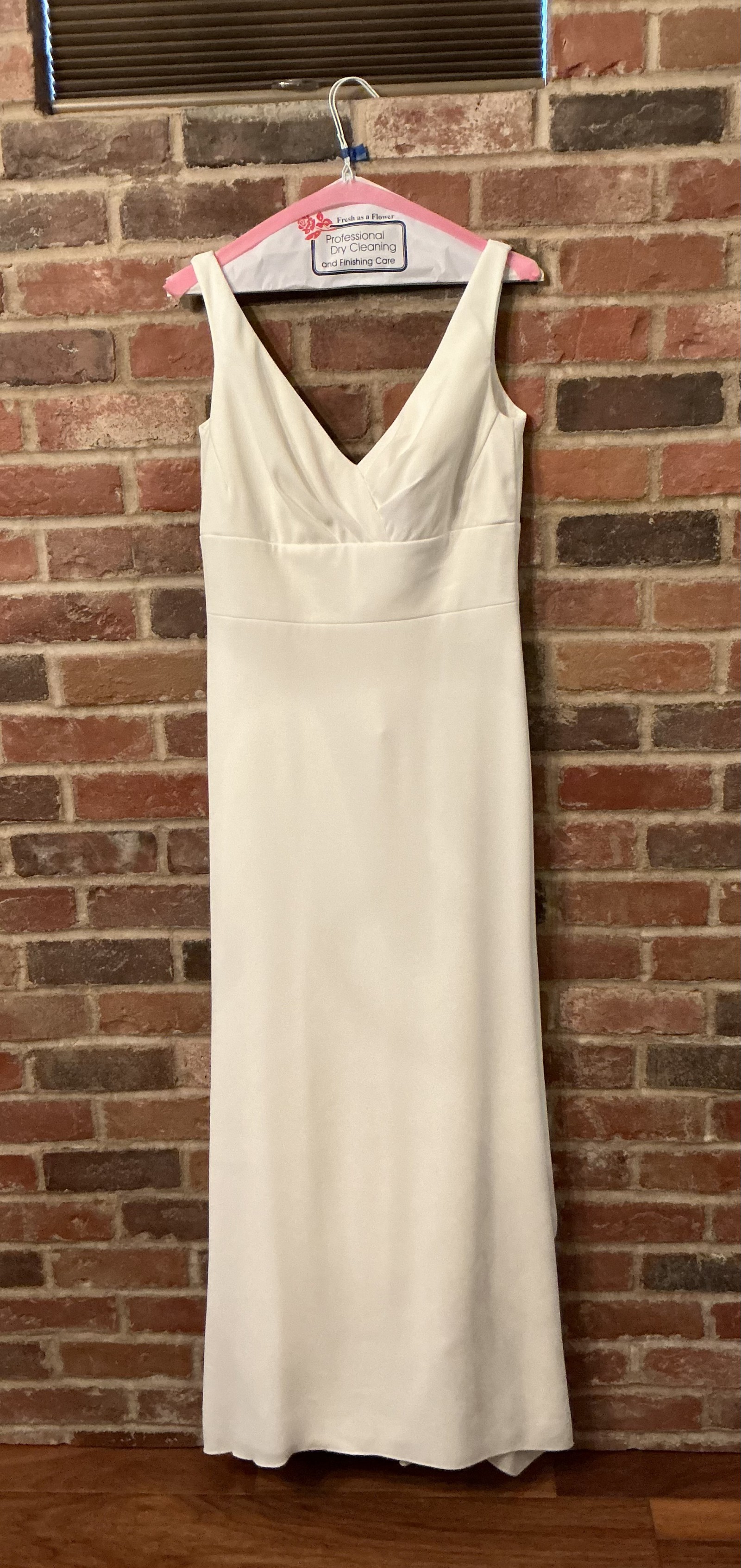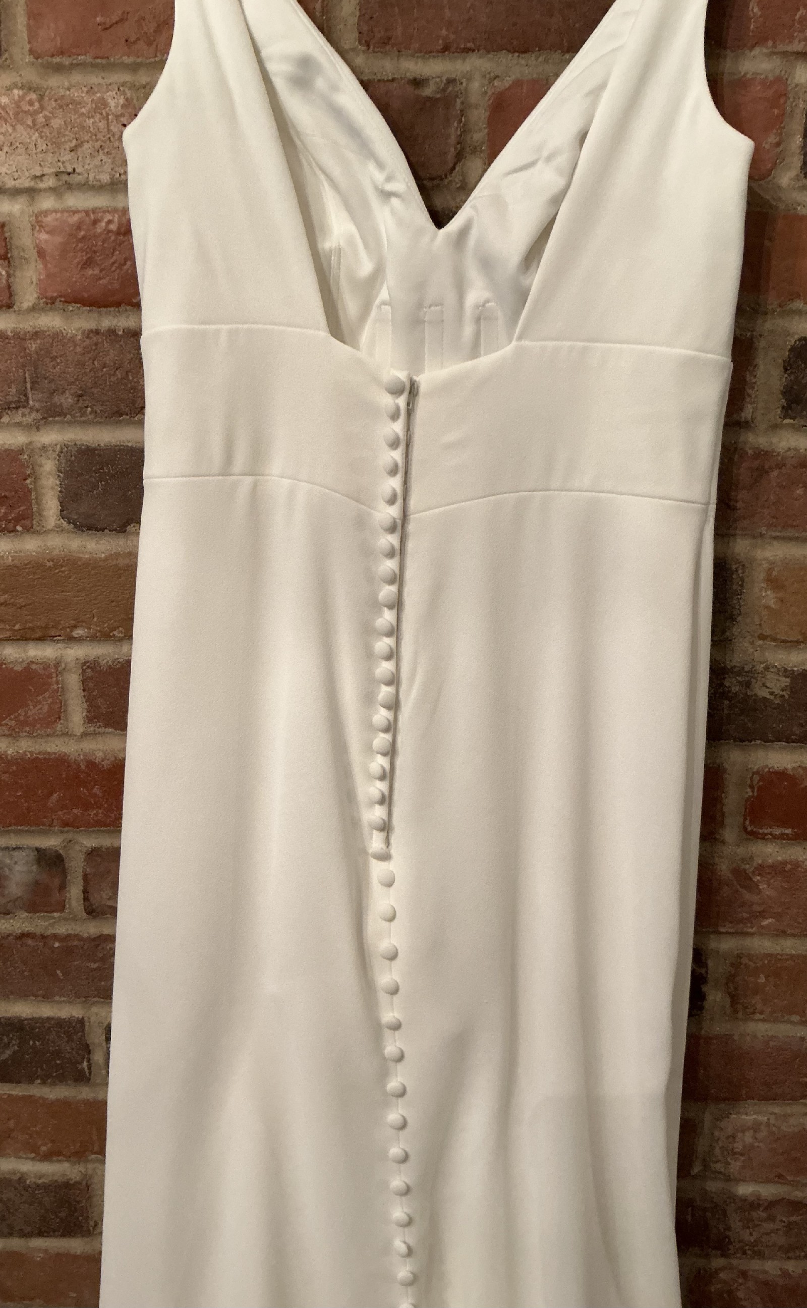 This dress is incredibly flattering, simple, and modern with beautiful movement. The silhouette is technically an A-line, but very slim and sheath-like through the hips for a clean, elongated look. The crepe fabric drapes smoothly without clinging and photographs beautifully.