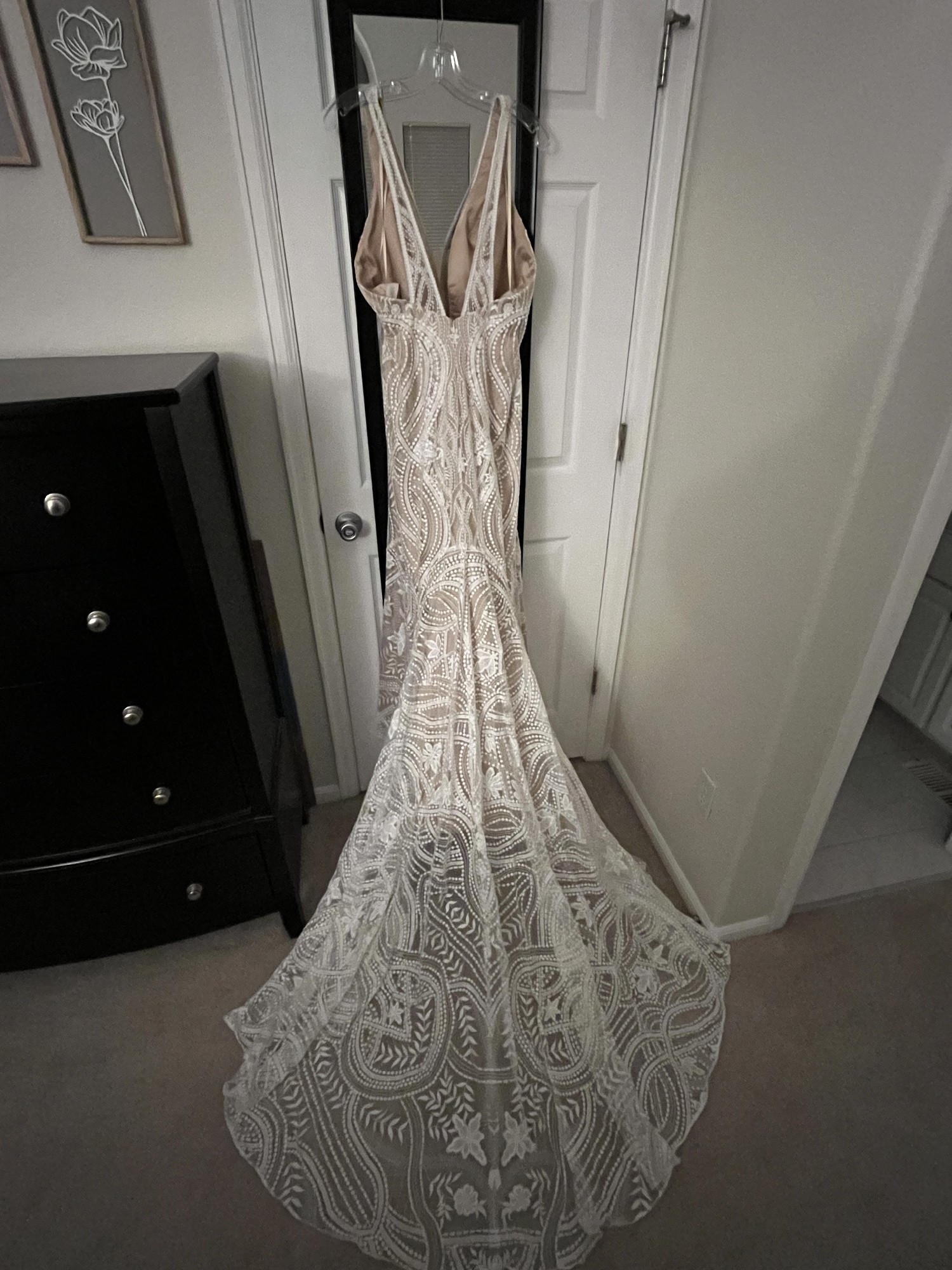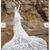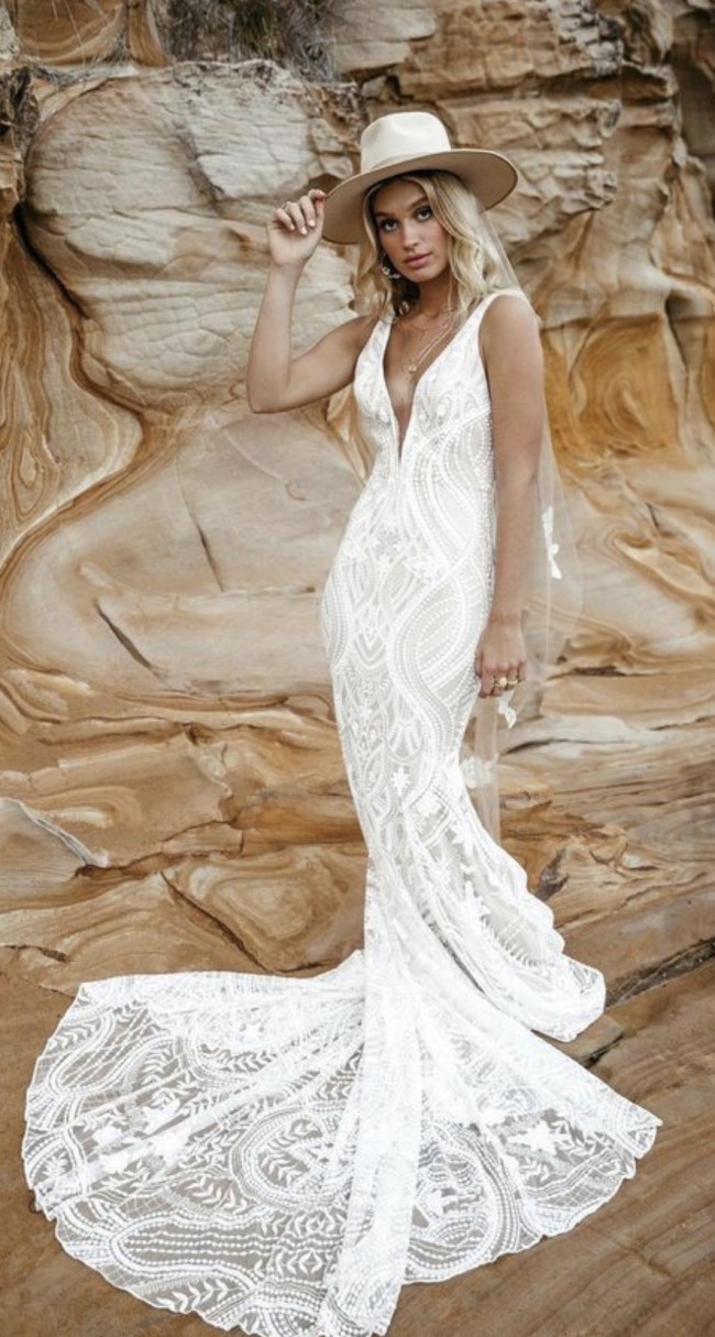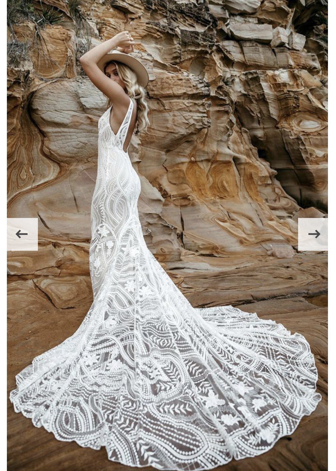 Charlie’s bold curved lace was made for fashion forward, bohemian brides and is sure to bring the magic. Cut for a slim fit, Charlie makes the most of her lace, by creating her panel lines by following these curves. The result is a sexy, sculpted fit through the body, balanced out by a low plunging neckline framed with vine trim. A low back and timeless shape makes Charlie is a gown you look back on with love for years to come. Off-white lace with blush lining.