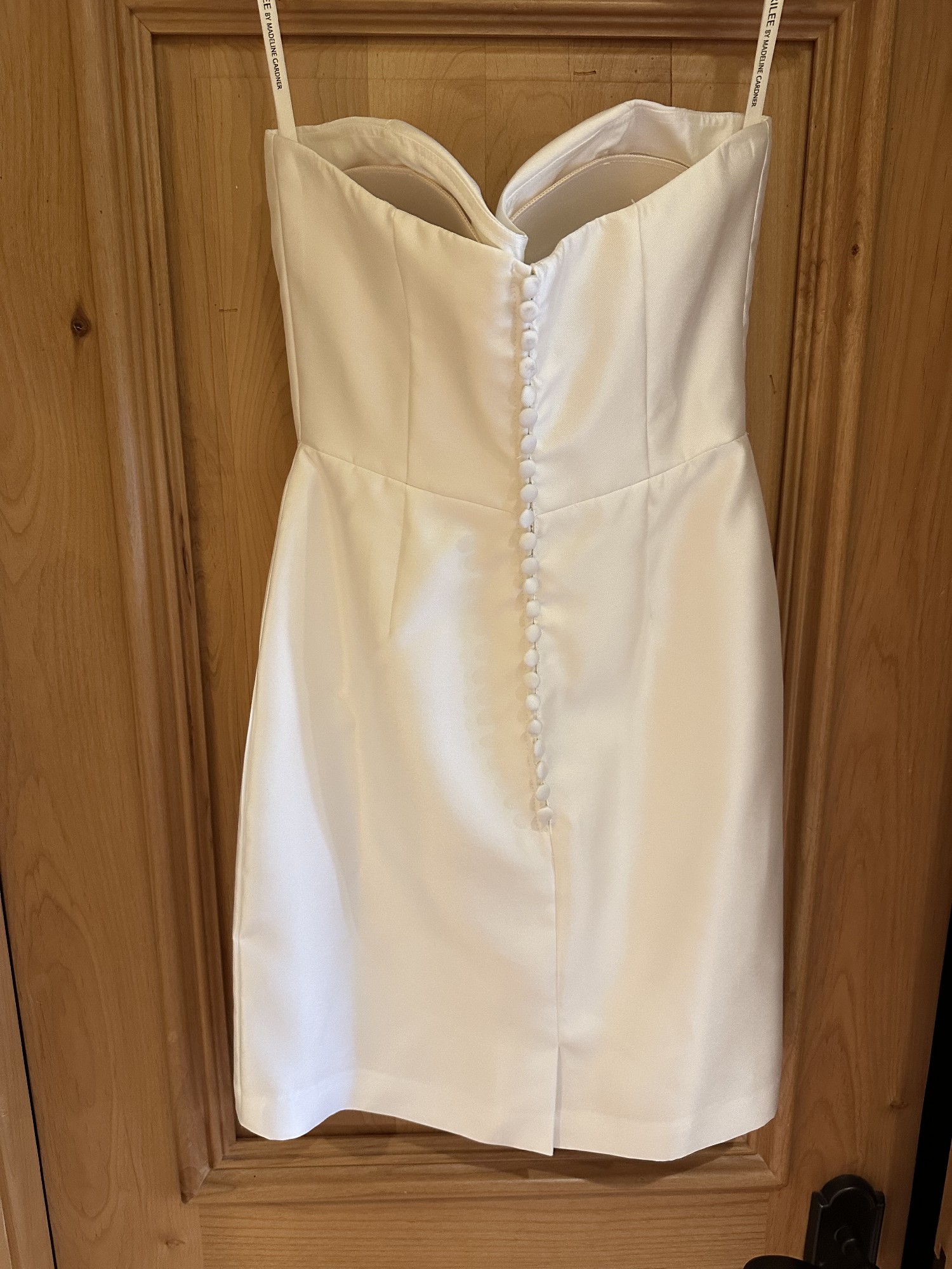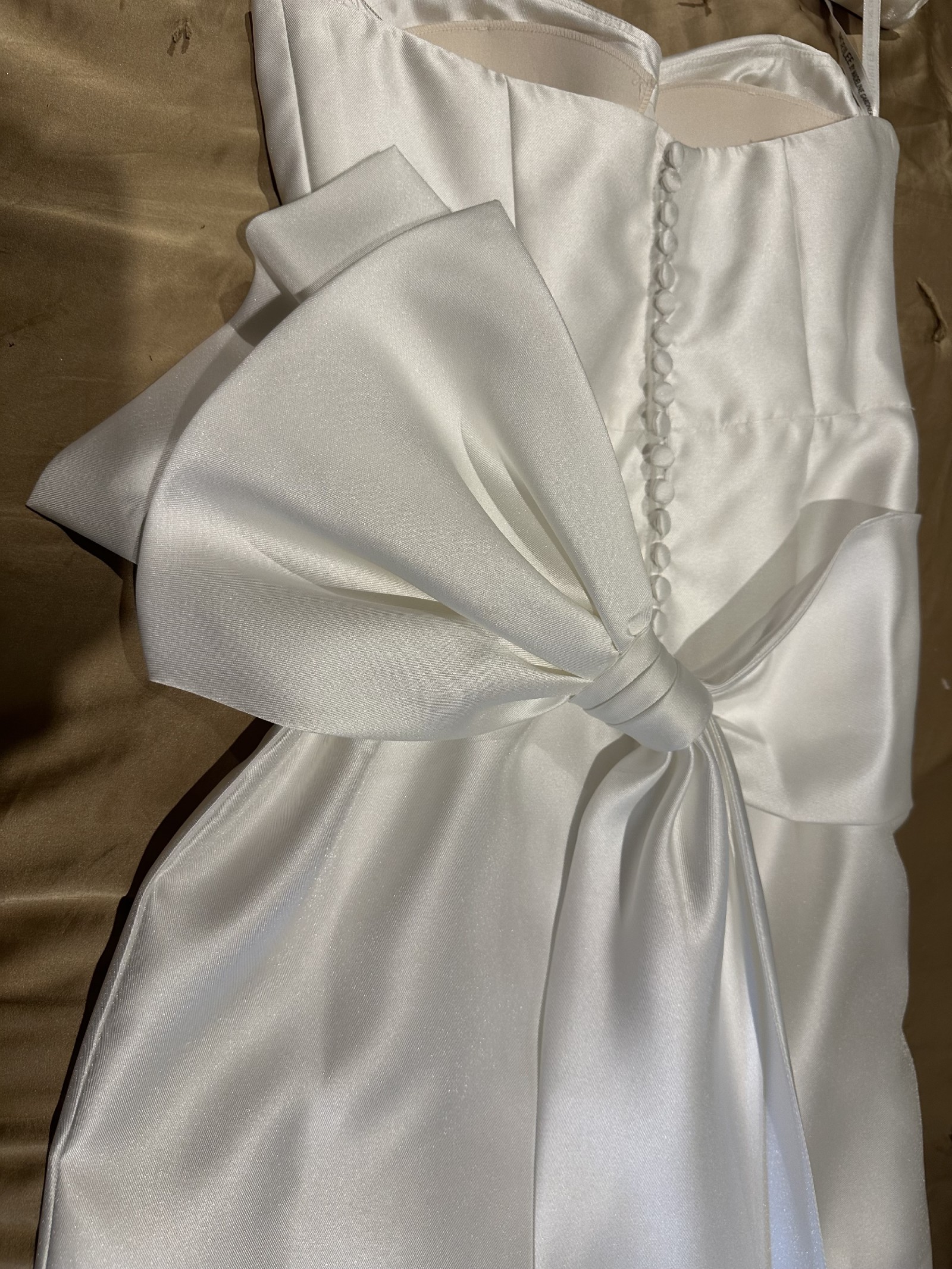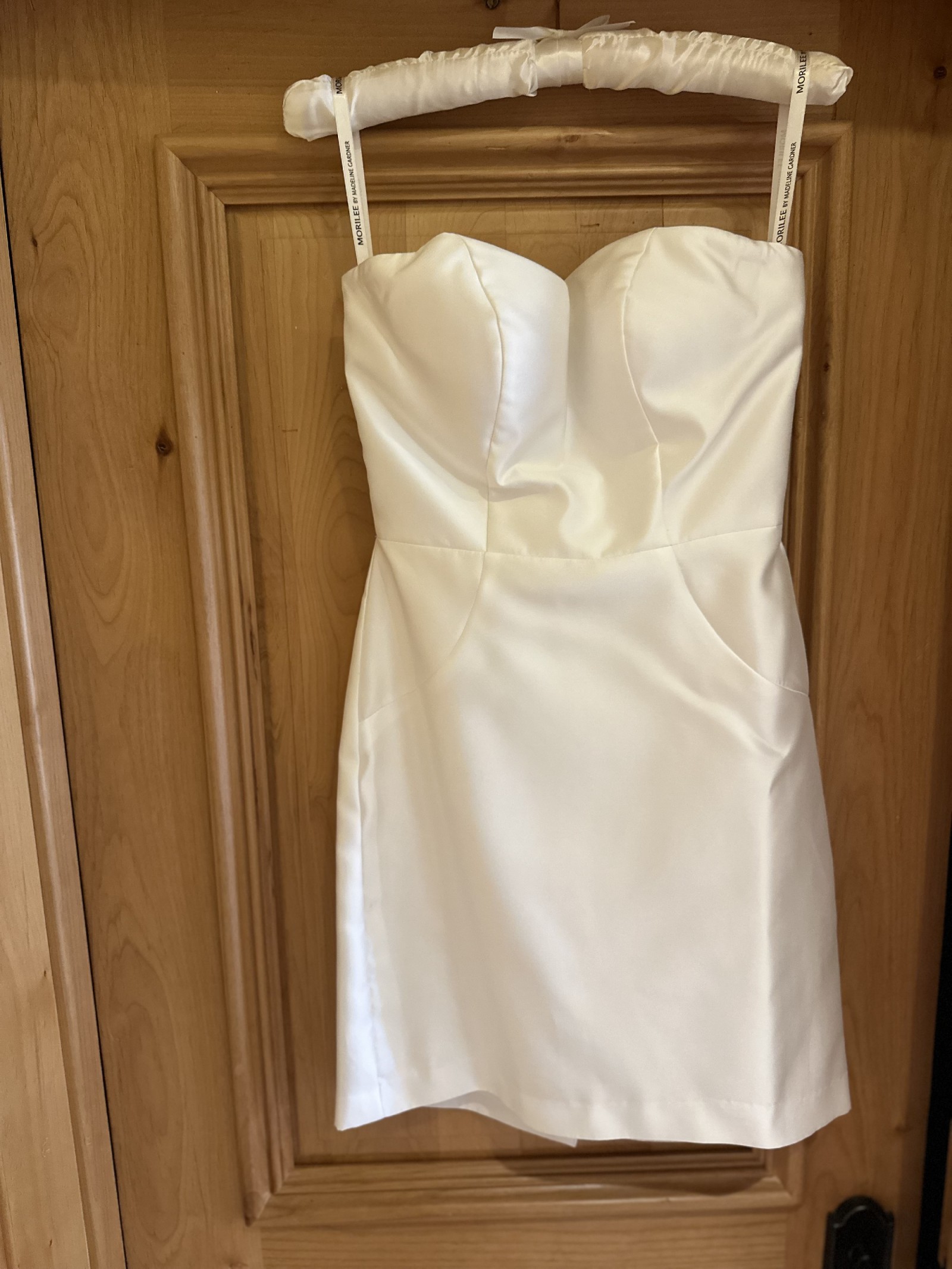 Beautiful, classic, and pristine NWOT Morilee Nikita bridal dress! Sweetheart neckline, above-the-knee cut with a fitted skirt that has a slight A-line shape. Perfect for a courthouse wedding, elopement, afterparty, or bachelorette party. Gorgeous satin fabric with covered buttons and a removable bow sash to complete the look. The dress is a timeless look that will look stunning on your big day.