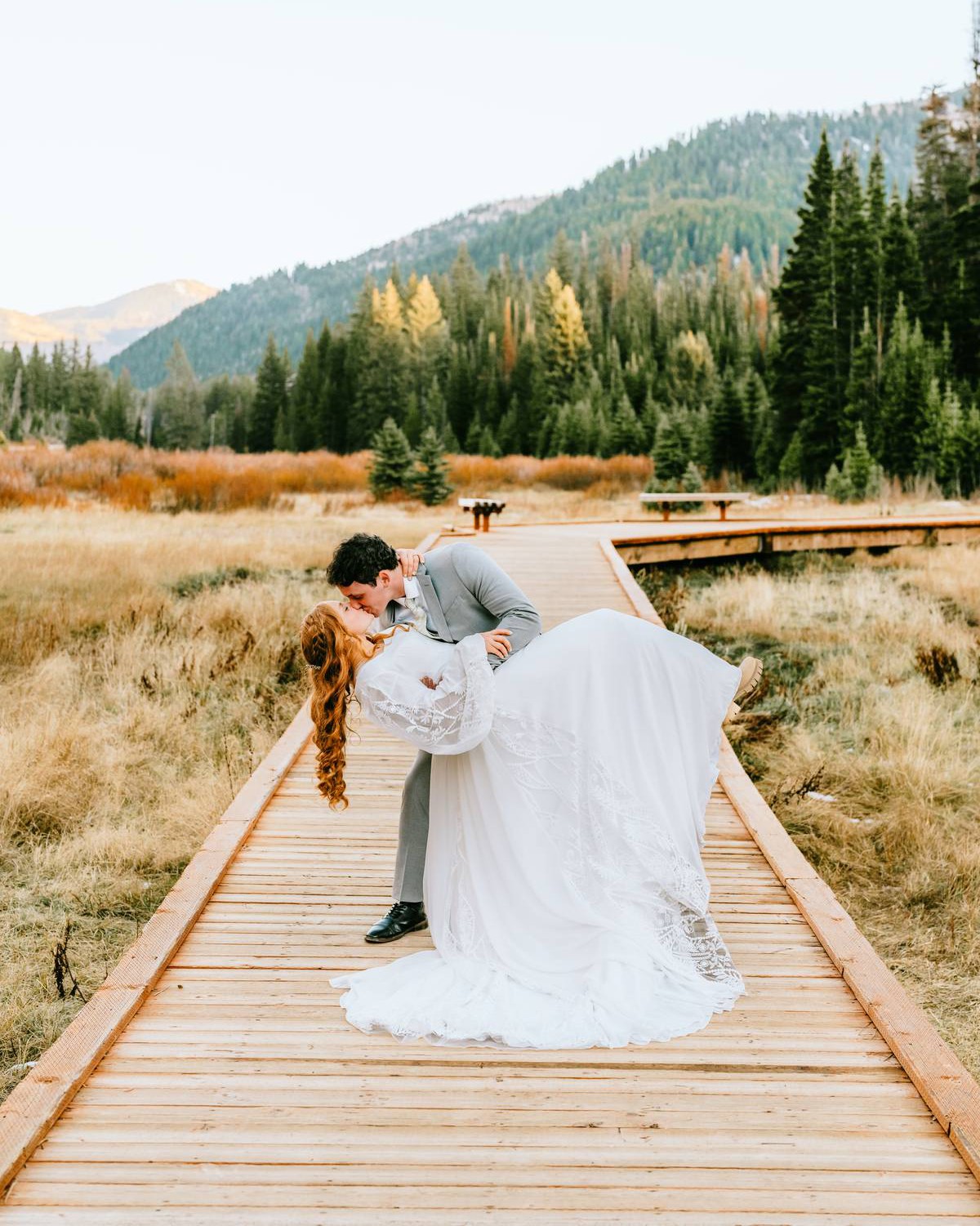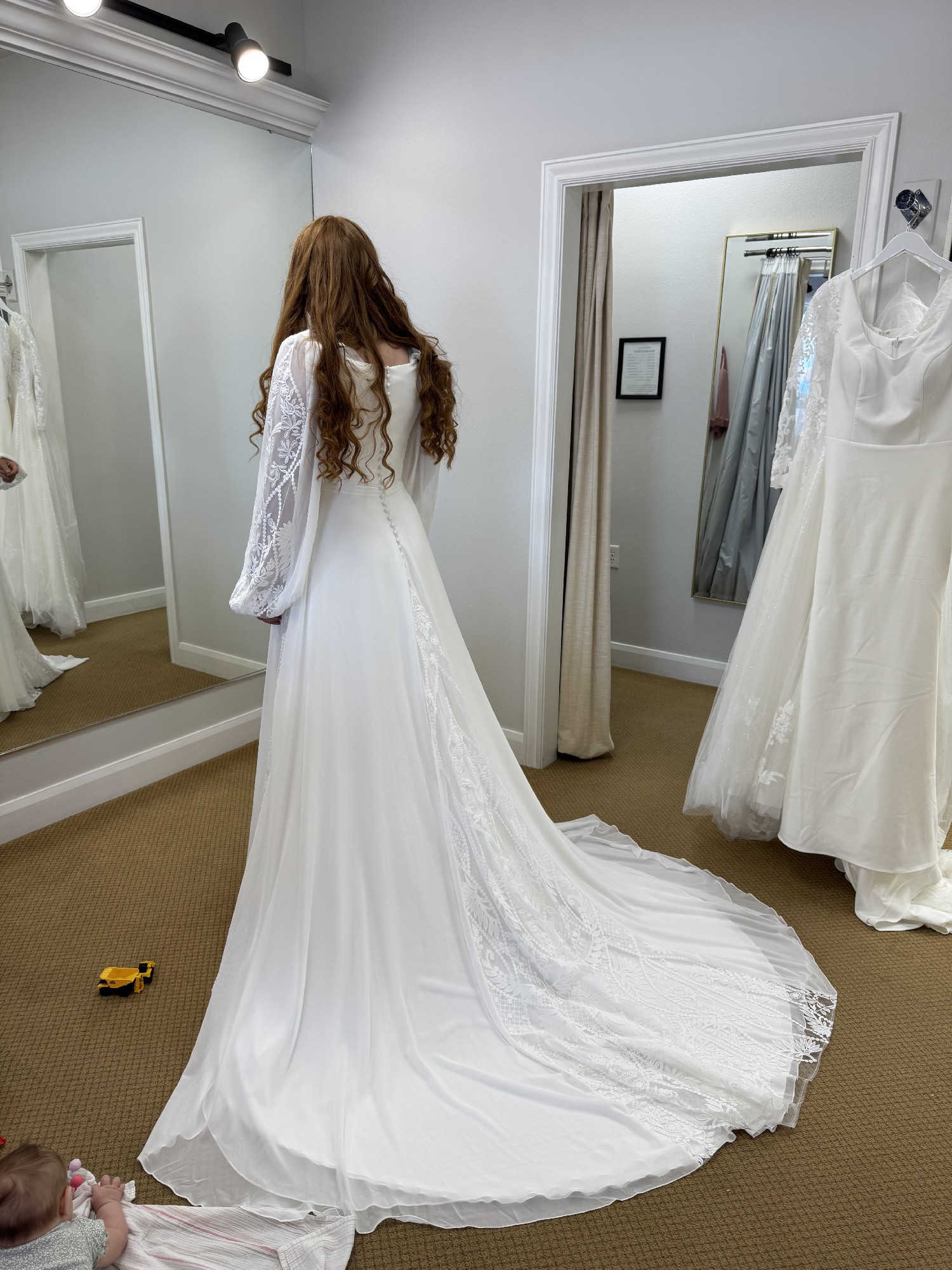 Modern boho meets classic elegance in the Willow gown. Dreamy chiffon with lace insert details, plus a pleated detailing at the waist. Will absolutely complete your princess moment. Zipper back with false buttons and inner corset.