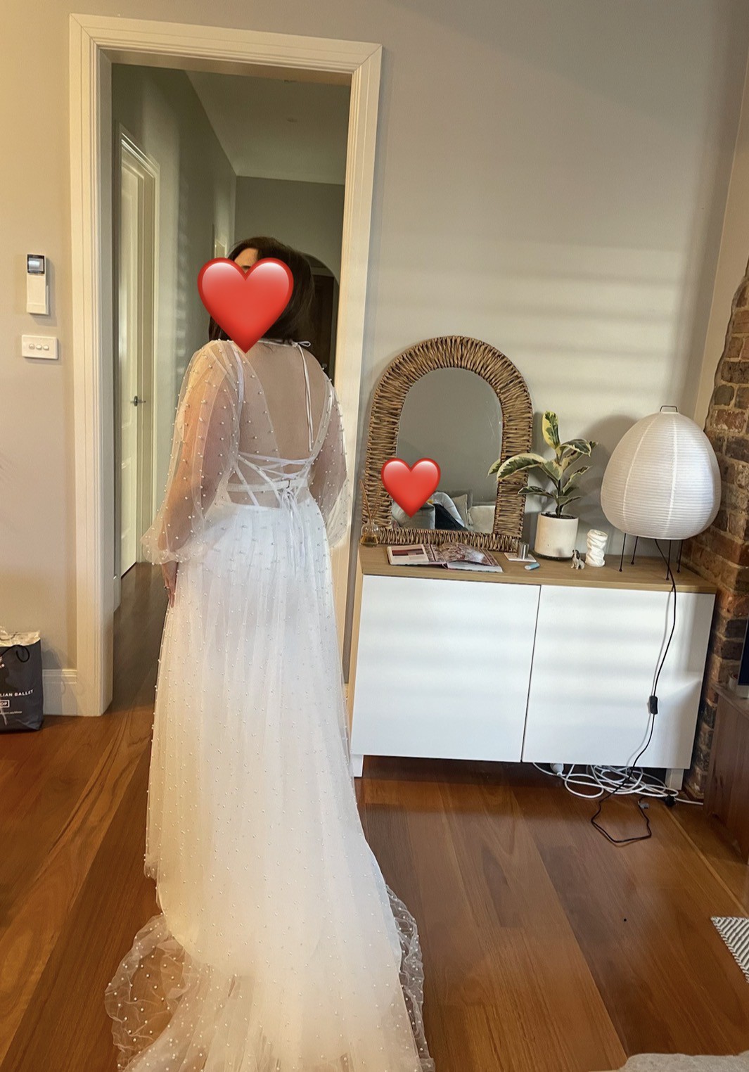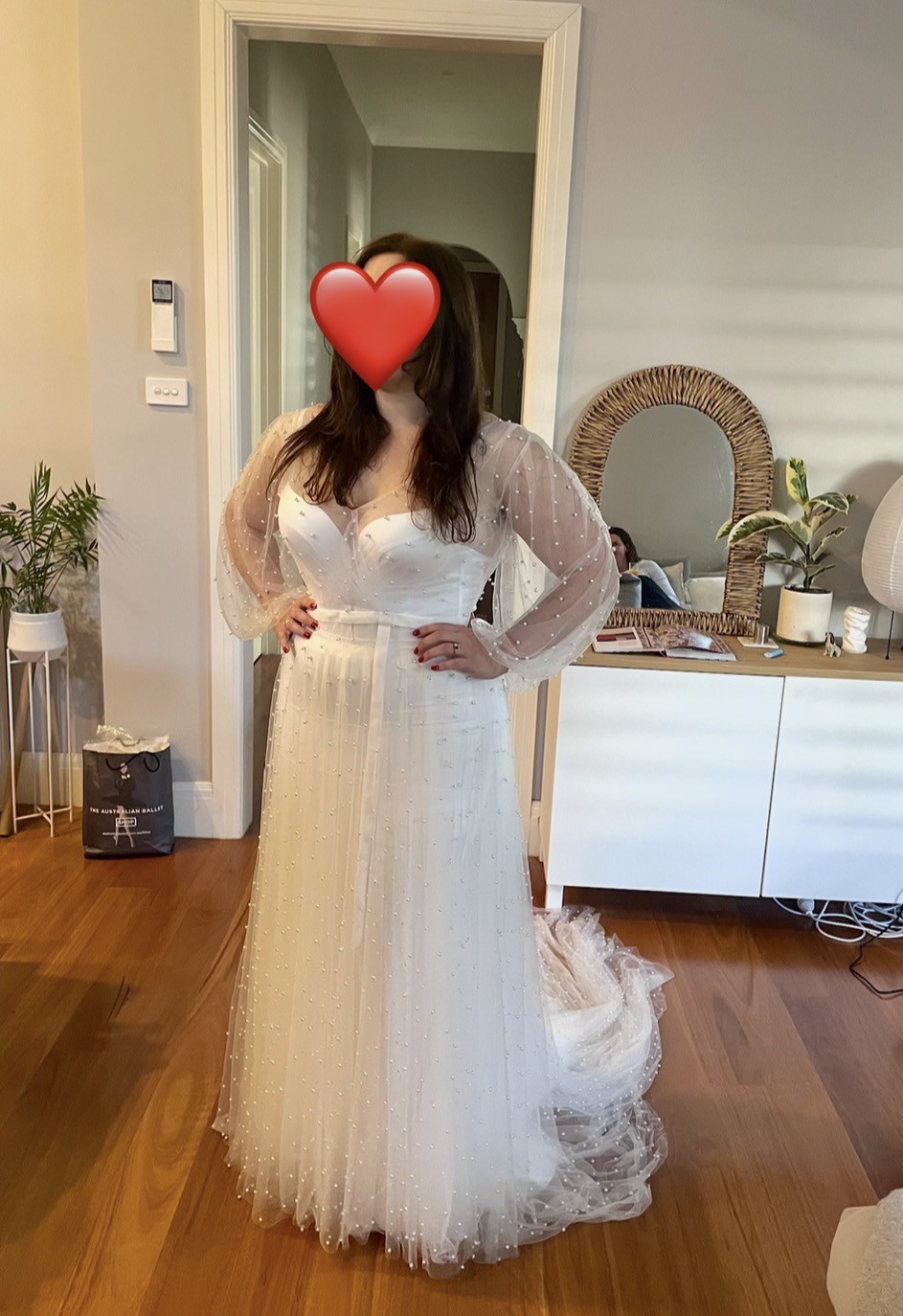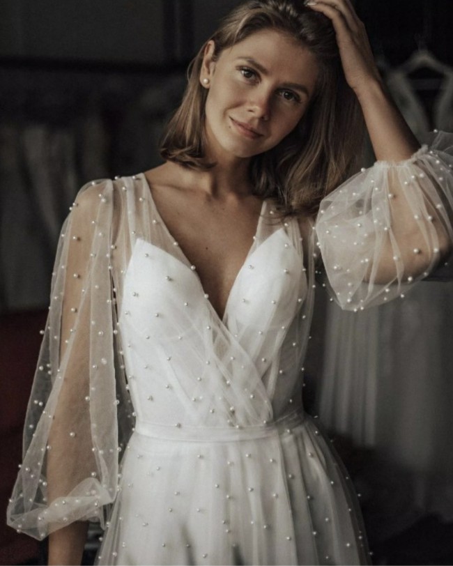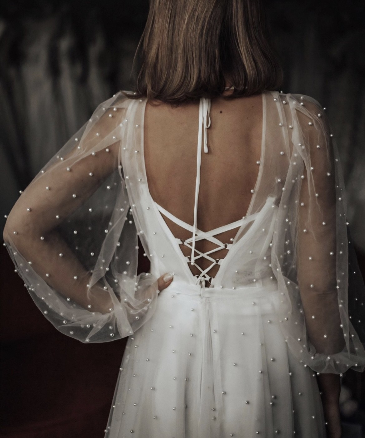 One of my favorite features has to be the long sleeves, which added a touch of vintage charm and complemented the low back perfectly. The subtle pearl embellishments shimmered softly as I moved, catching the light in the most romantic way. Every detail was crafted with love, making it not just a dress but a treasured piece of my wedding story.
