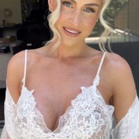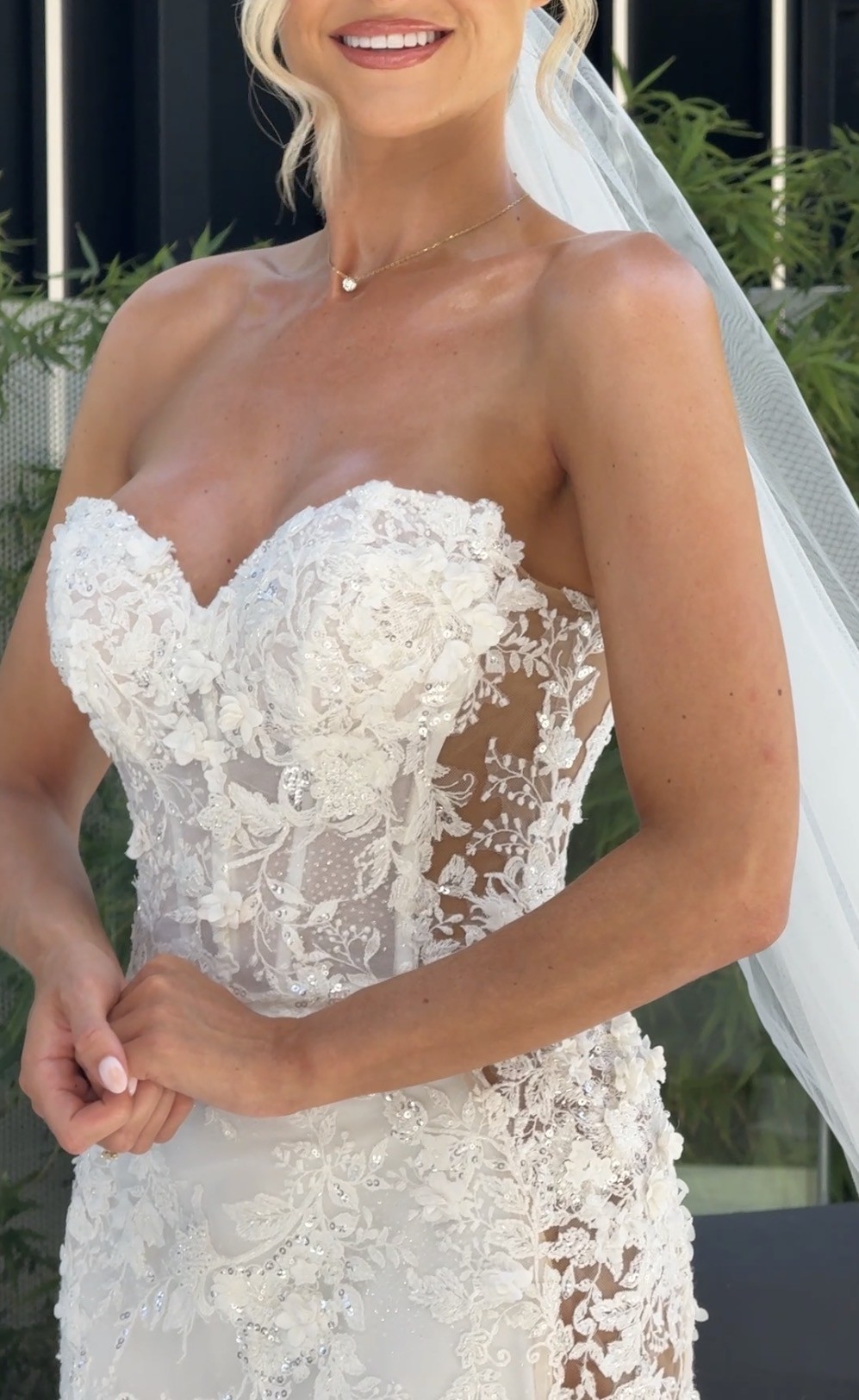 This stunning gown features elegant detailing with a flattering fitted silhouette that enhances your shape while still feeling comfortable to wear. The intricate lace and soft romantic design make it perfect for a modern yet timeless bridal look.