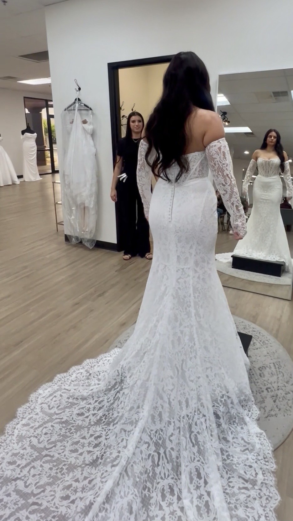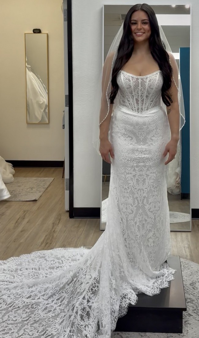 This dress was purchased new from Brilliant Bridal but I ultimately chose a different gown. It has only been tried on in-store and has never been worn outside of try-on. The dress remains in excellent, unaltered condition and has been stored safely in its garment bag.