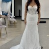 Romantic lace wedding dress featuring a flattering fit-and-flare silhouette with a structured corset bodice and sweetheart neckline. The gown is beautifully detailed with delicate lace appliqué and subtle pearl beading that adds soft shimmer and dimension throughout the dress.
