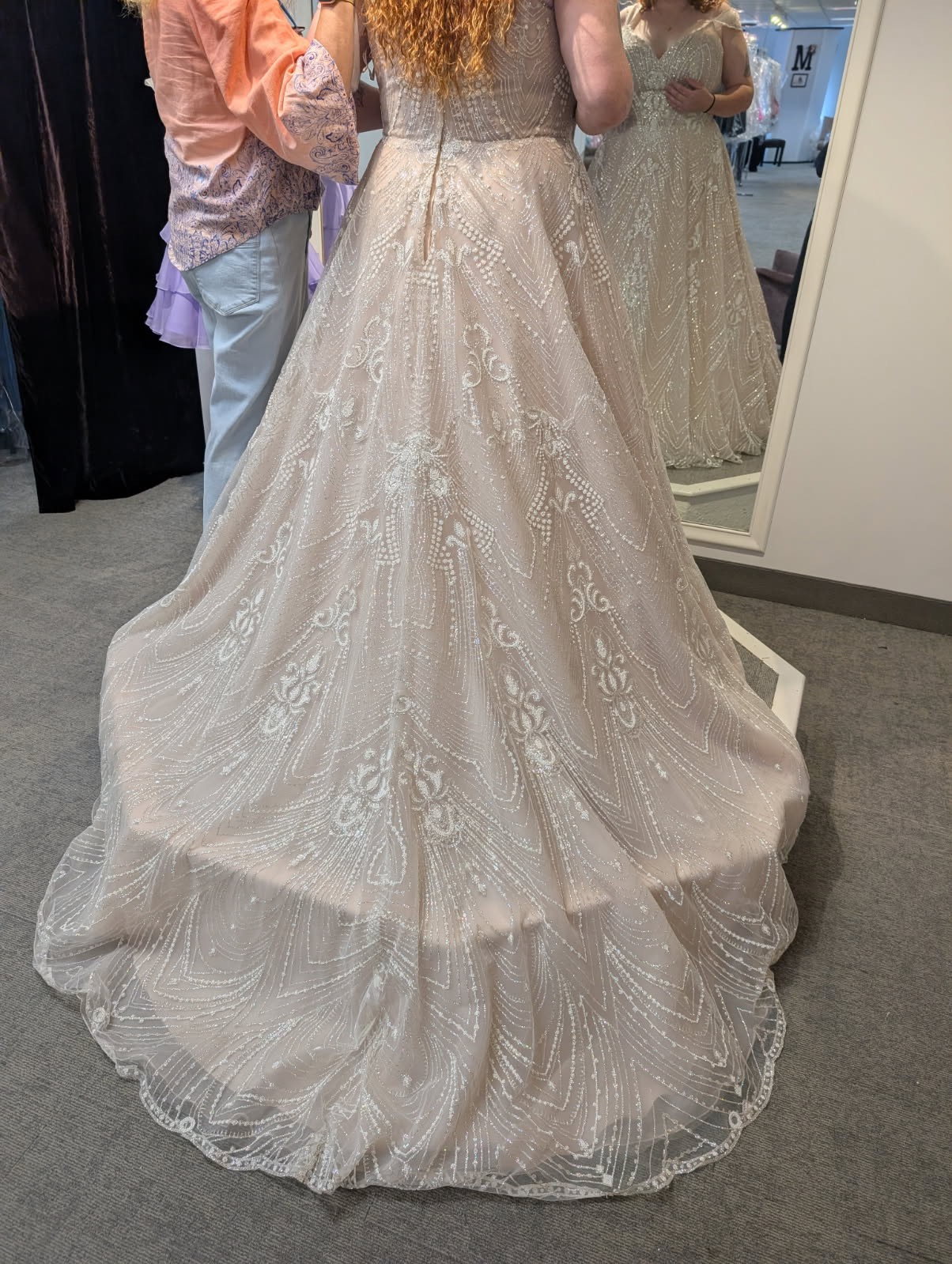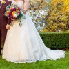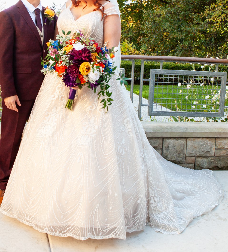 - 3-button bustle added but never used - I preferred to leave it unbustled; satin straps added for comfort on the shoulders; off-shoulder sheer straps adjusted for better fit; hemmed to fit my 5’7” height plus 2 inch heels
