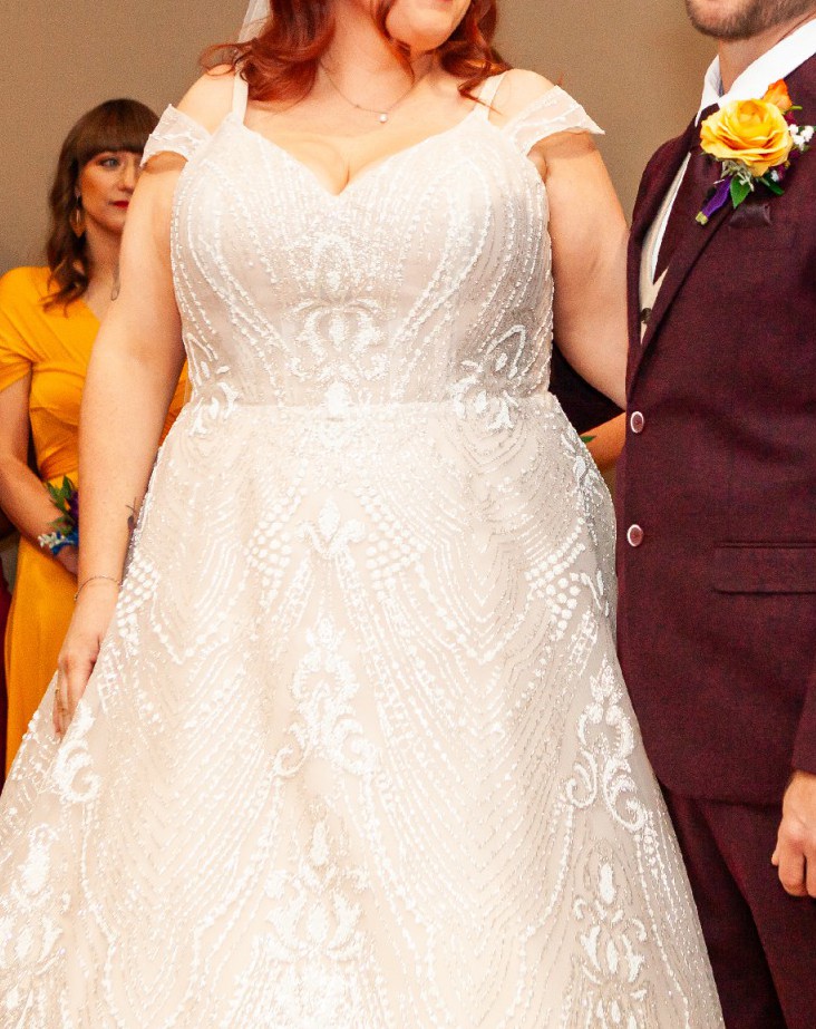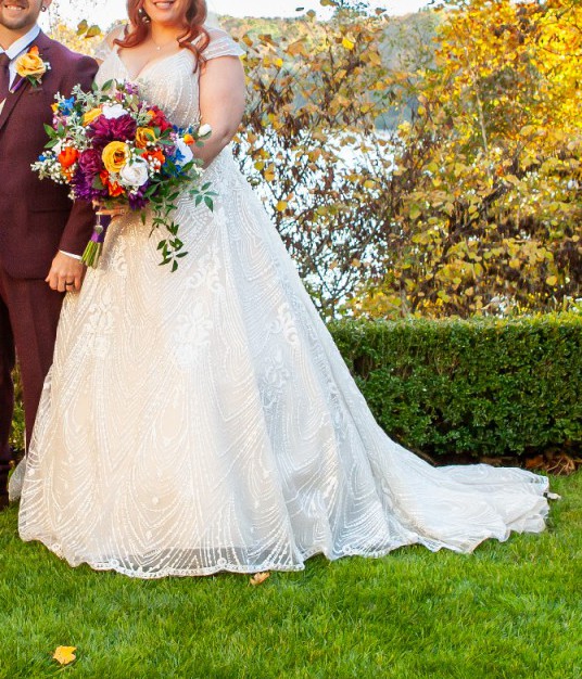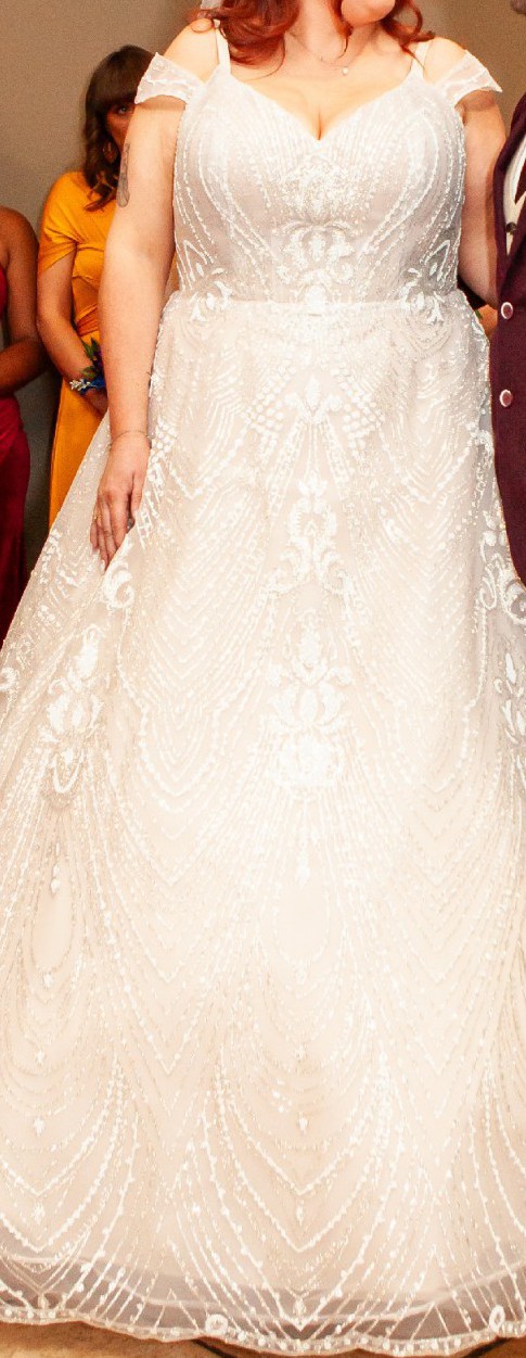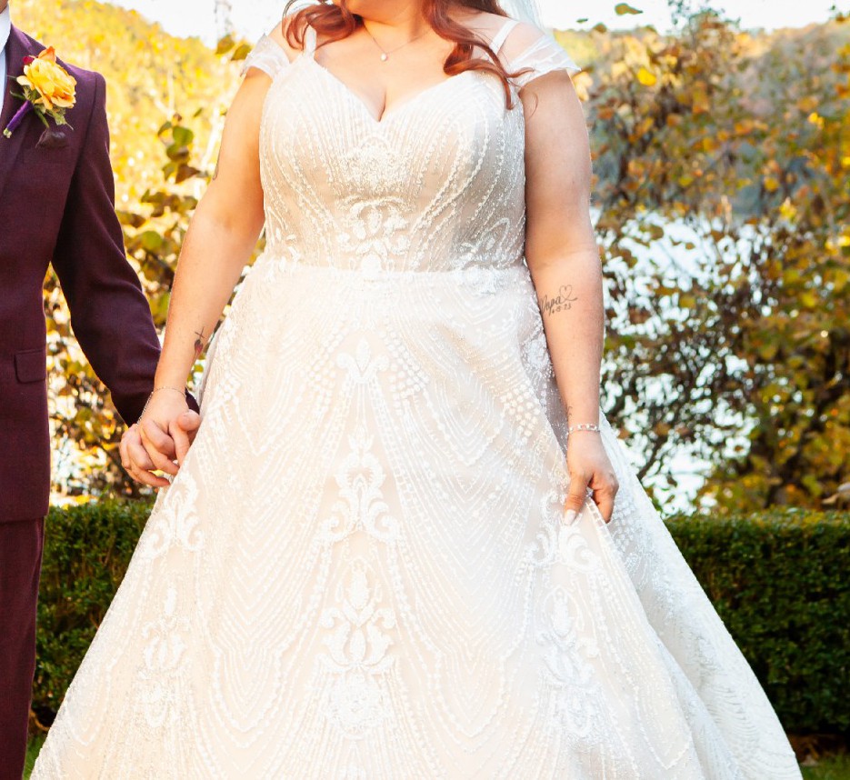 This stunning Stella York Style 7336 wedding dress was the perfect choice for my special day, and I’m excited to pass it on to another bride who will love it just as much as I did. With its beautiful A-line silhouette and delicate off-the-shoulder neckline, this dress offers a romantic and timeless aesthetic that flatters all body types.