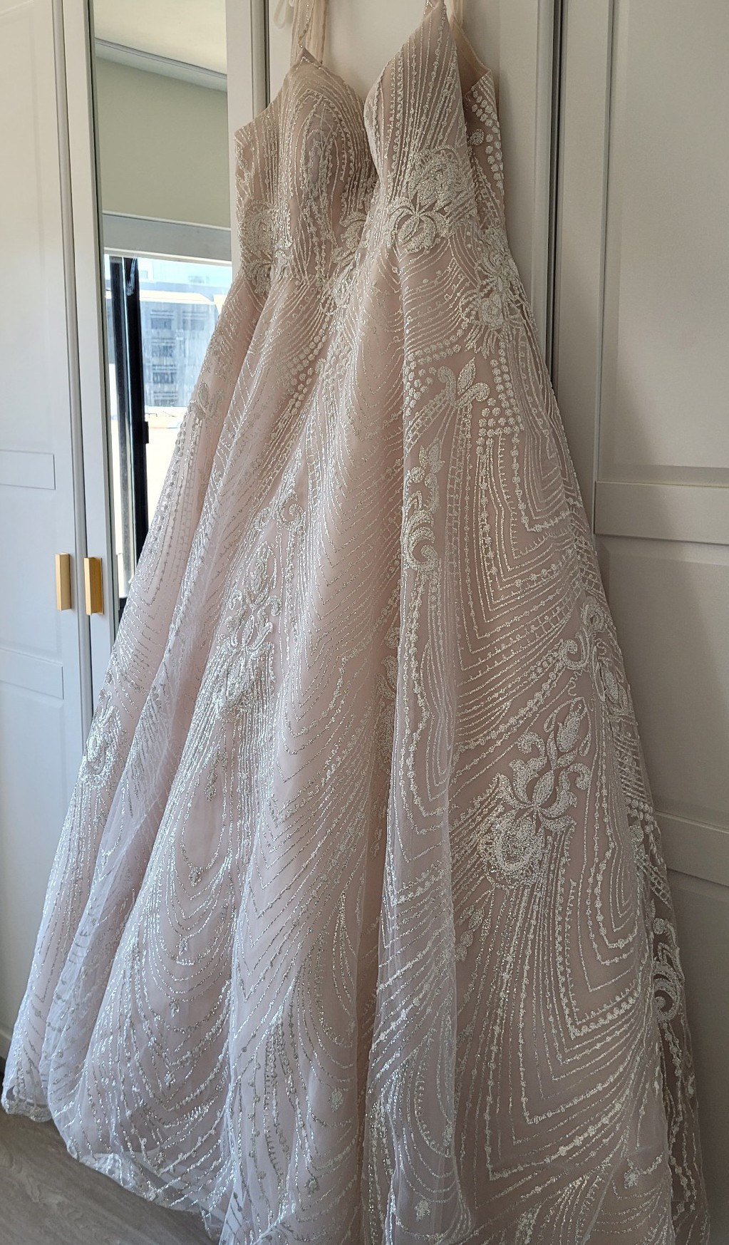 The soft pink hue of the ivory texture tulle over moscato regency organza and moscato gown adds a unique touch while still exuding an elegant vibe, perfect for both indoor and outdoor ceremonies. The spaghetti straps provide just the right amount of support, allowing for comfort throughout your celebration. I felt like a princess in this floor-length gown, and the mid-back design creates a beautiful flow down the aisle. The photos don’t capture the absolute stunning sparkle of this gorgeous gown.