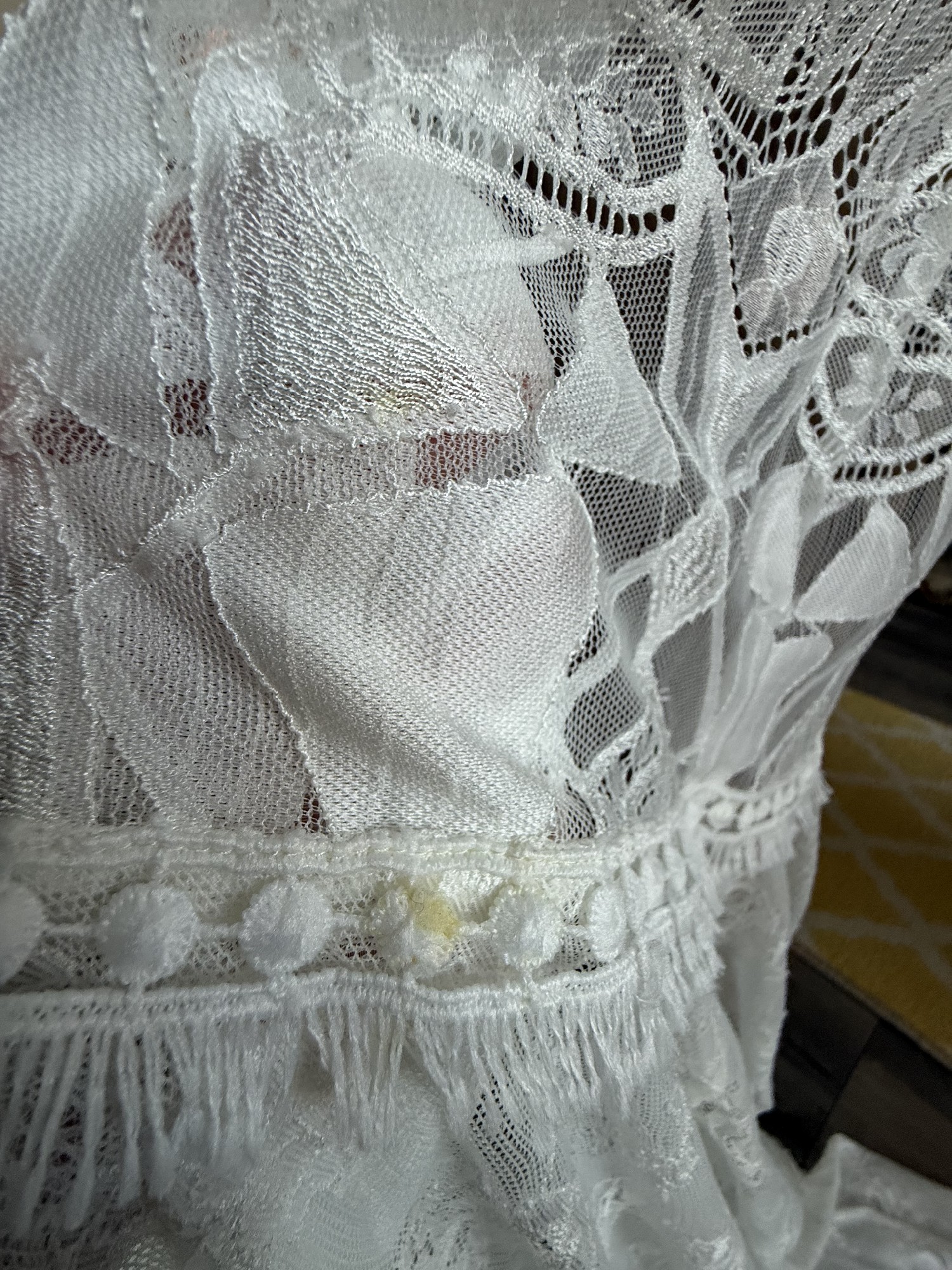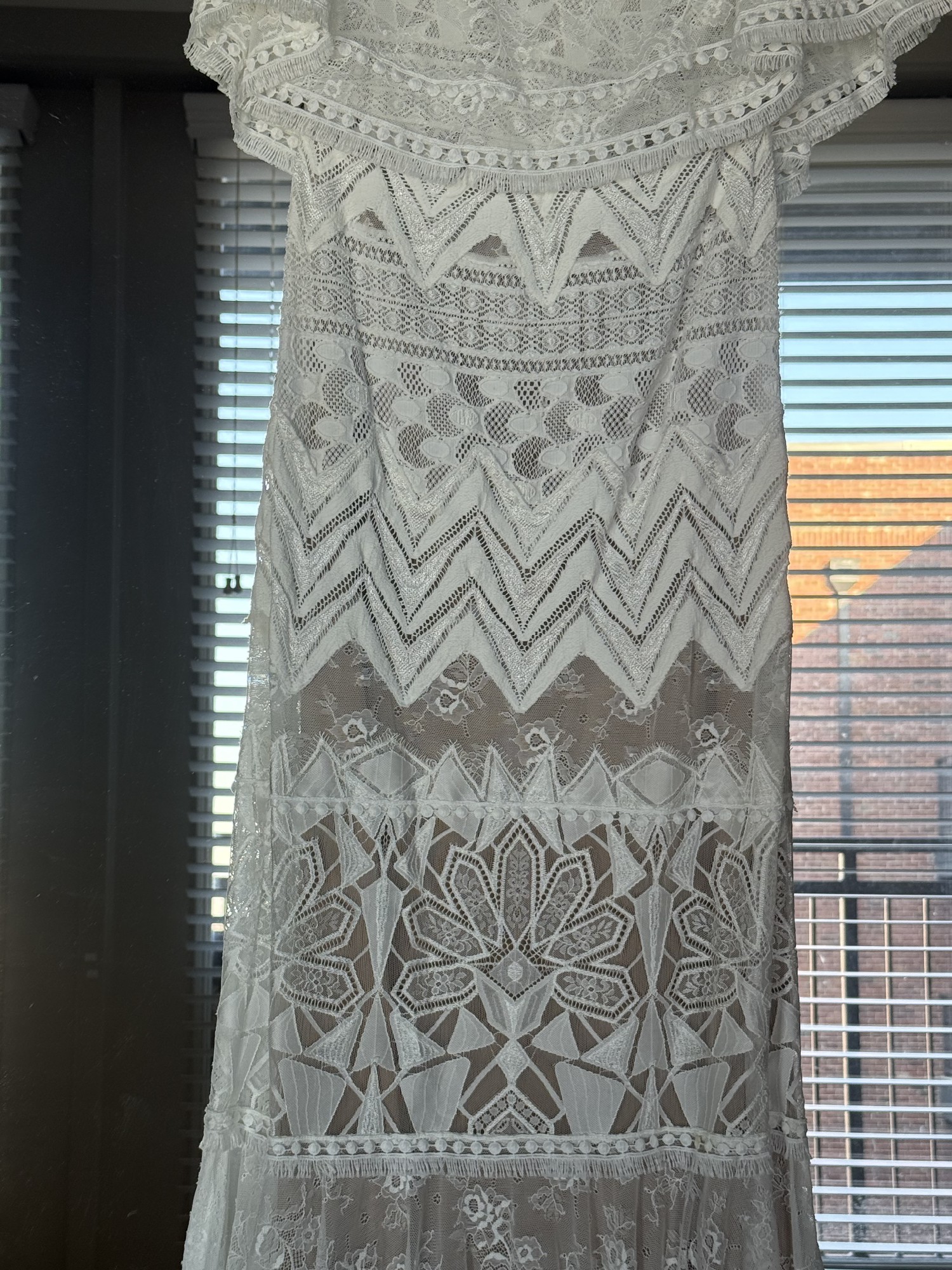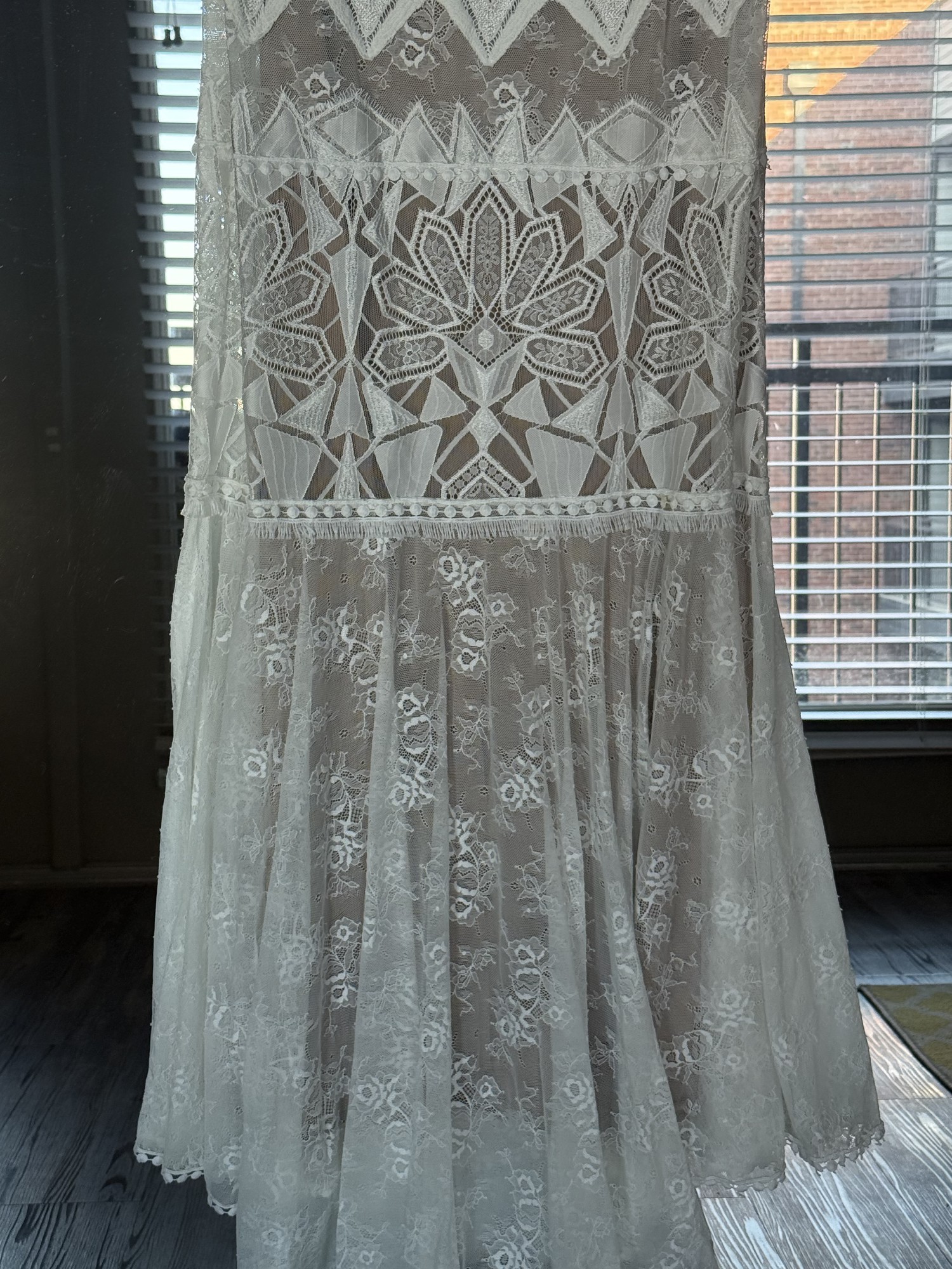 The showroom noted a small lace discrepancy under the loose fabric beneath the front bust. It’s not visible when worn and can be easily corrected if desired.
