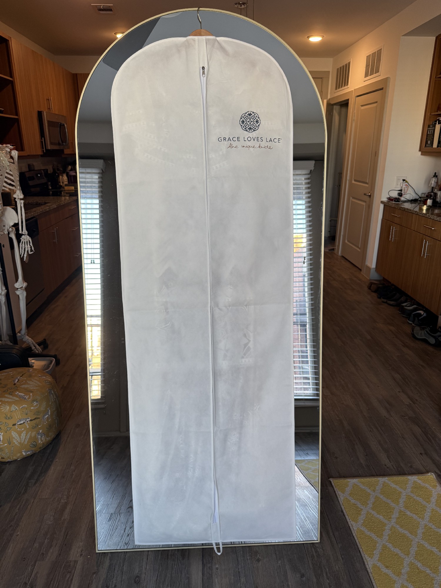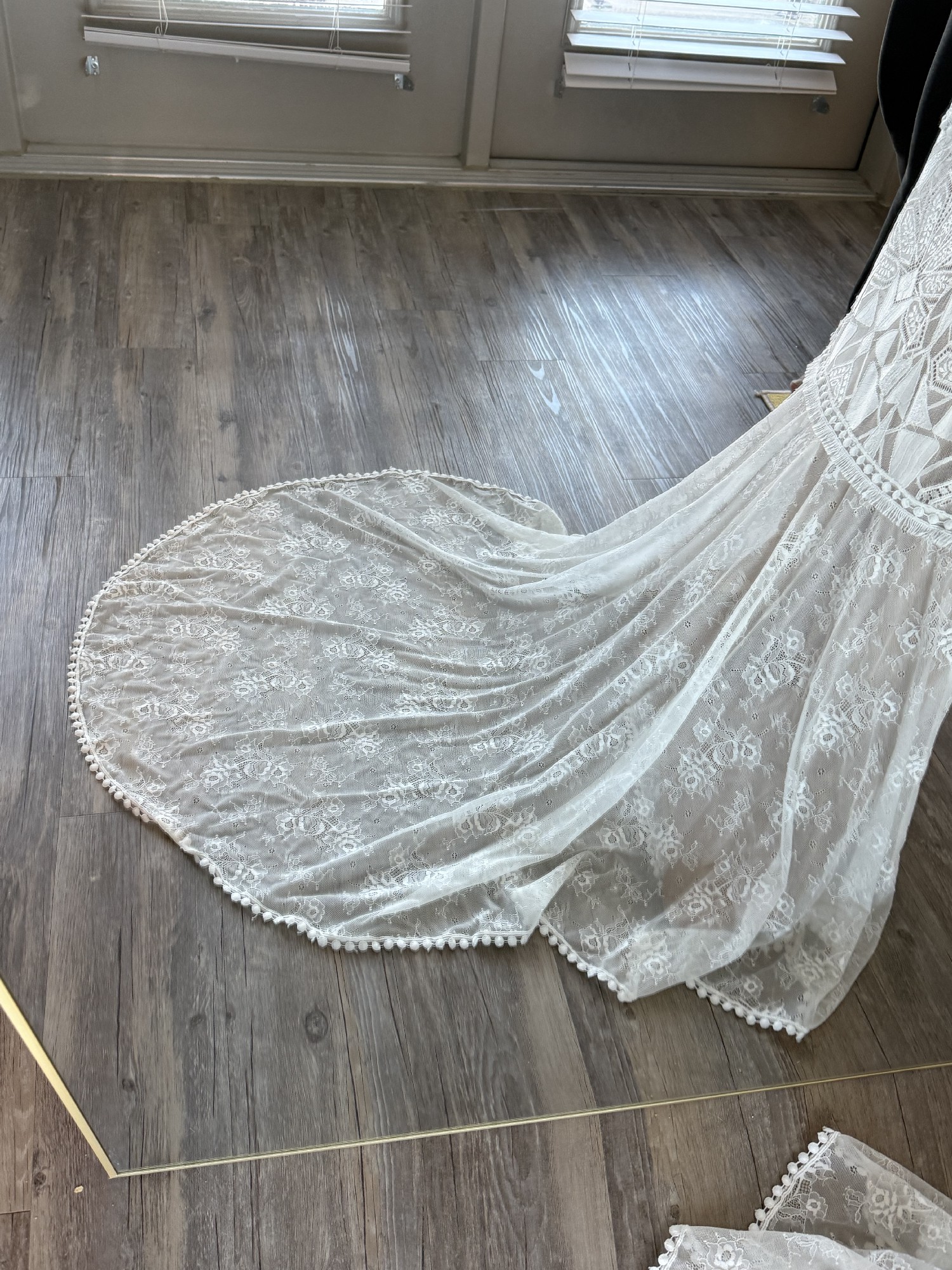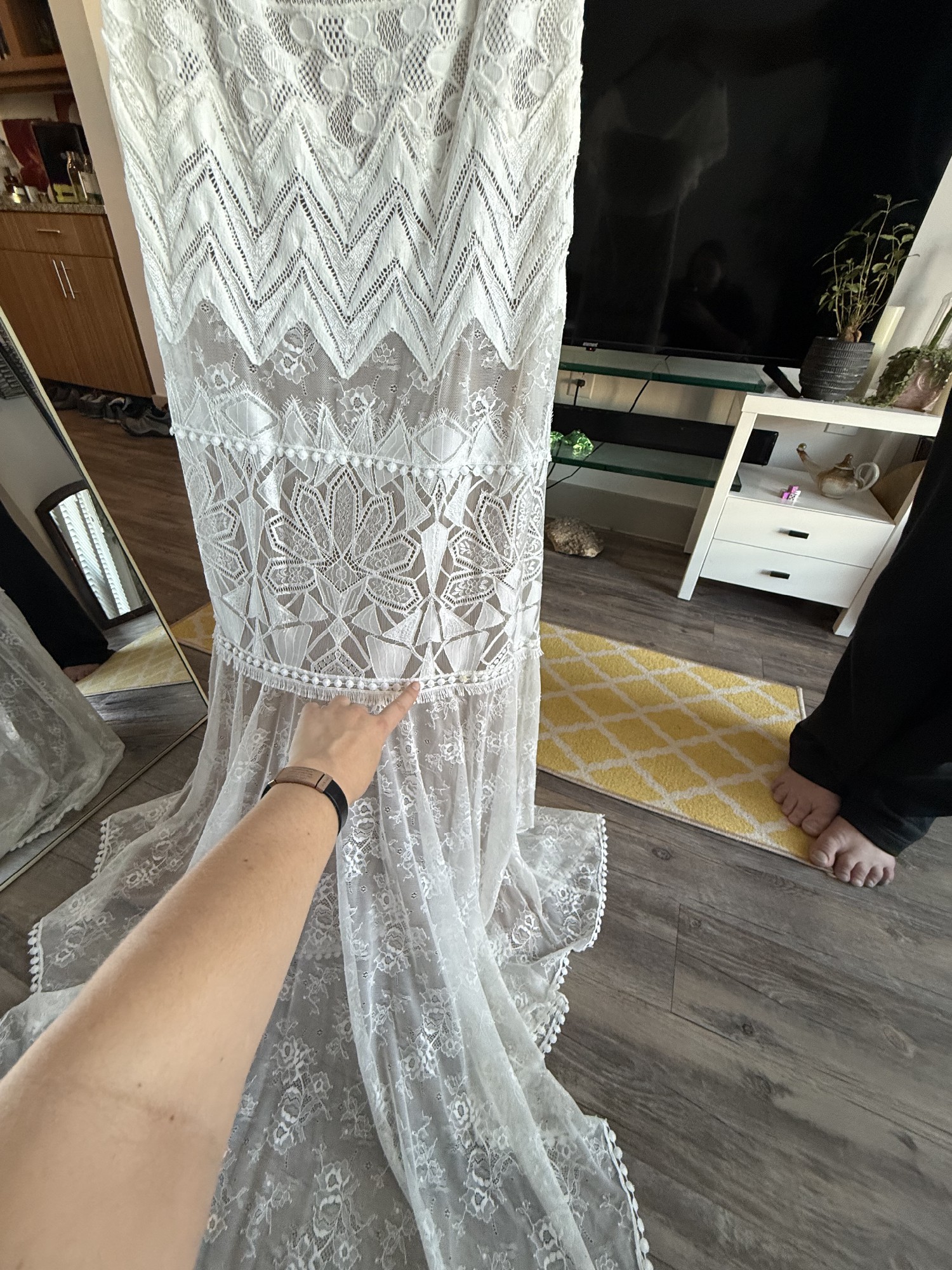 The showroom noted a small lace discrepancy under the loose fabric beneath the front bust. It’s not visible when worn and can be easily corrected if desired.