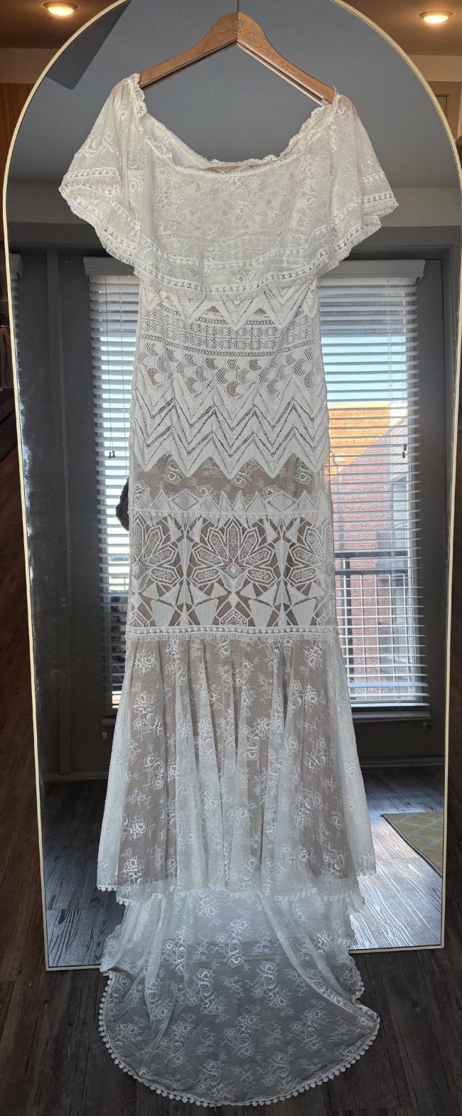 This Emanuala wedding dress from Grace Loves Lace is the perfect embodiment of elegance and romance for the modern bride. Crafted in soft white lace with a stretchy and soft form fitting, skin colored, slip it features a stunning trumpet silhouette that accentuates your curves while allowing for graceful movement down the aisle. The off-the-shoulder neckline adds a touch of allure, beautifully framing the shoulders and collarbone, ensuring you feel effortlessly beautiful.