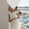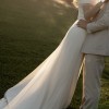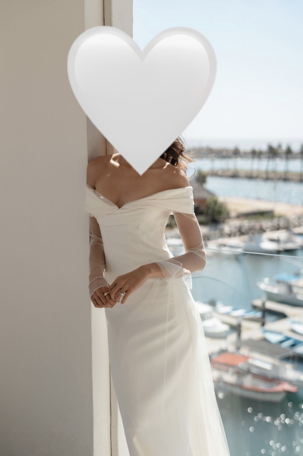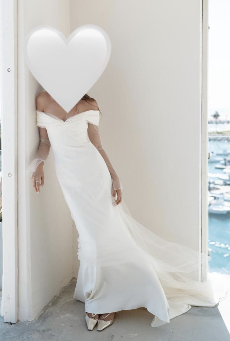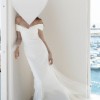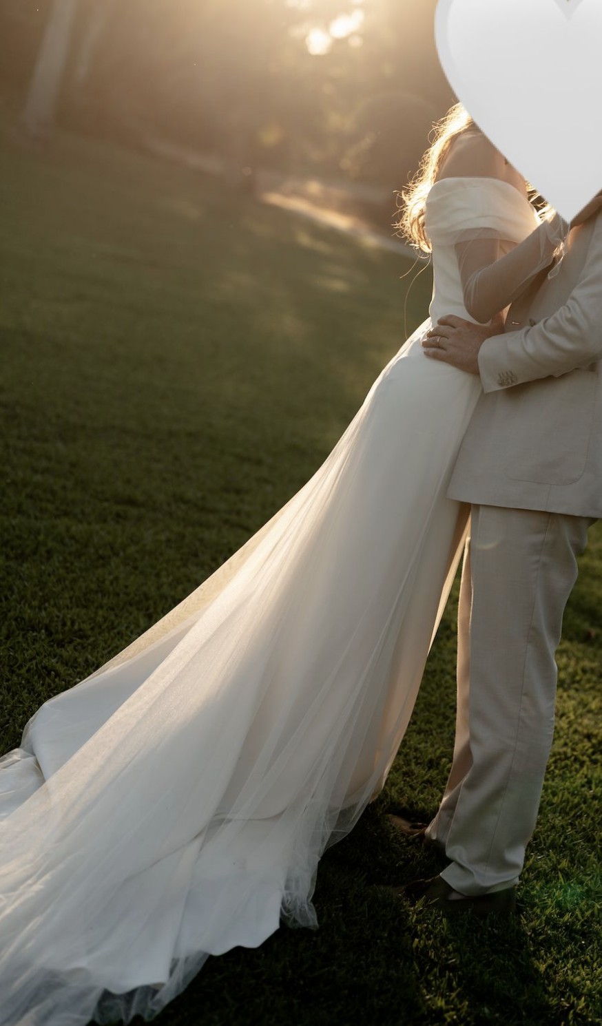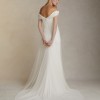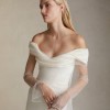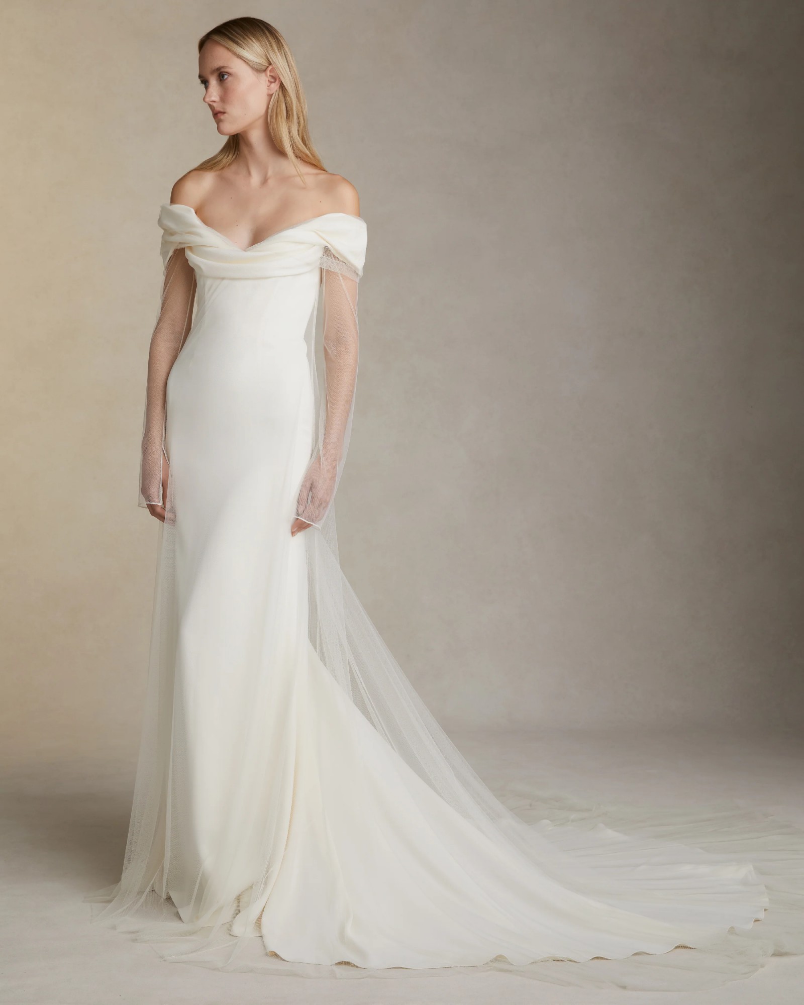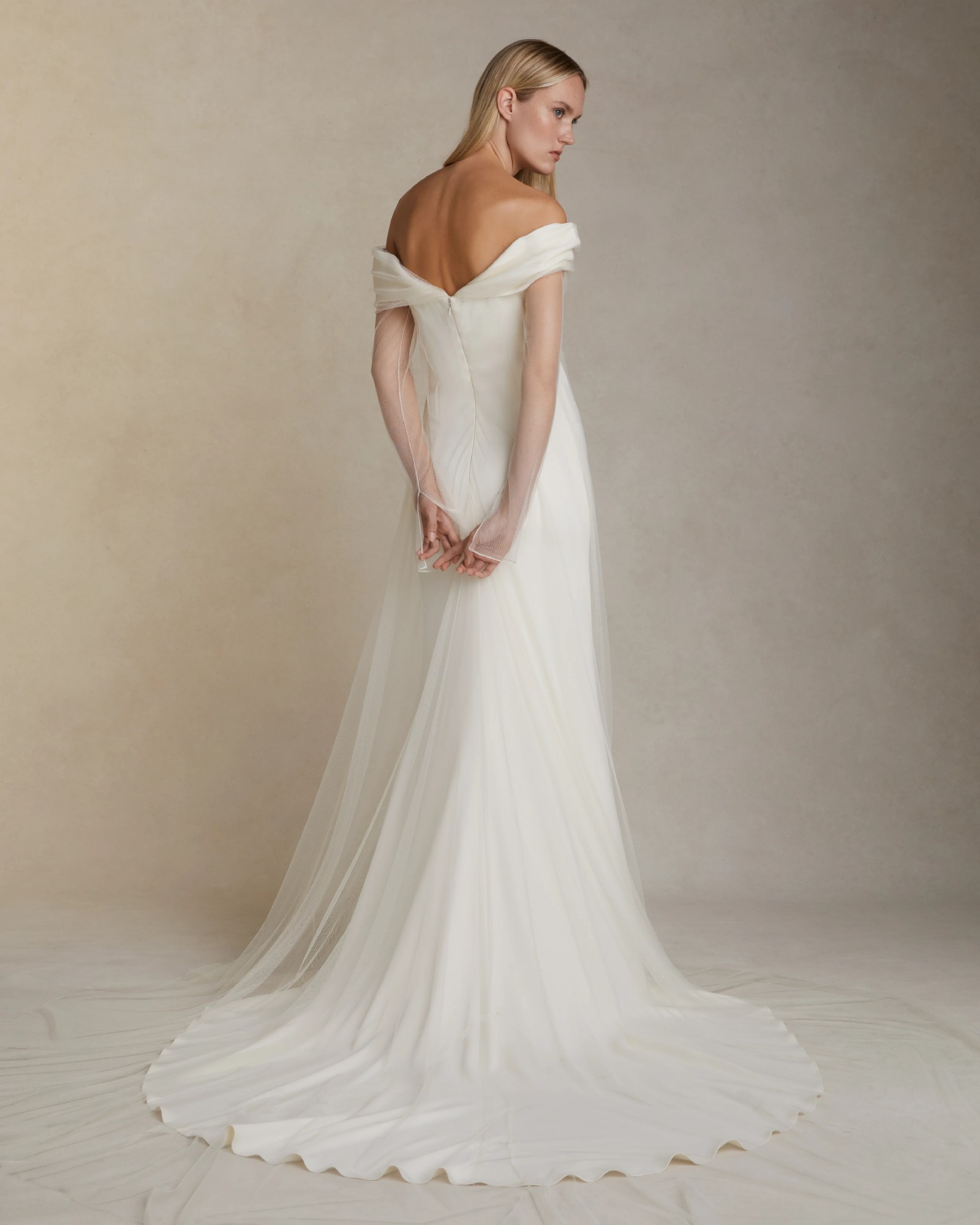 Stretch cady off the shoulder gown with draped bodice detail. Soft tulle overlay extends from neckline. Invisible zip closure at center back.