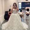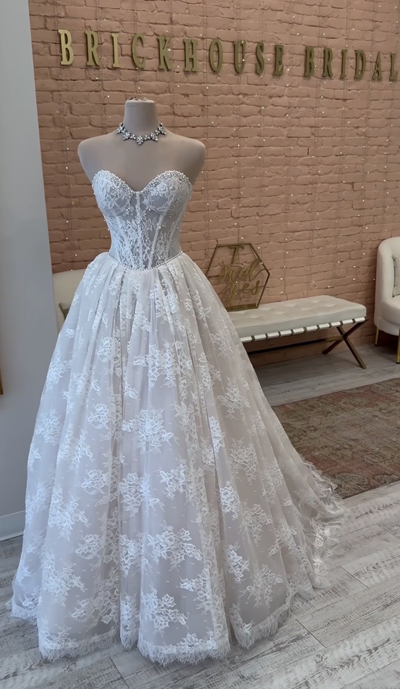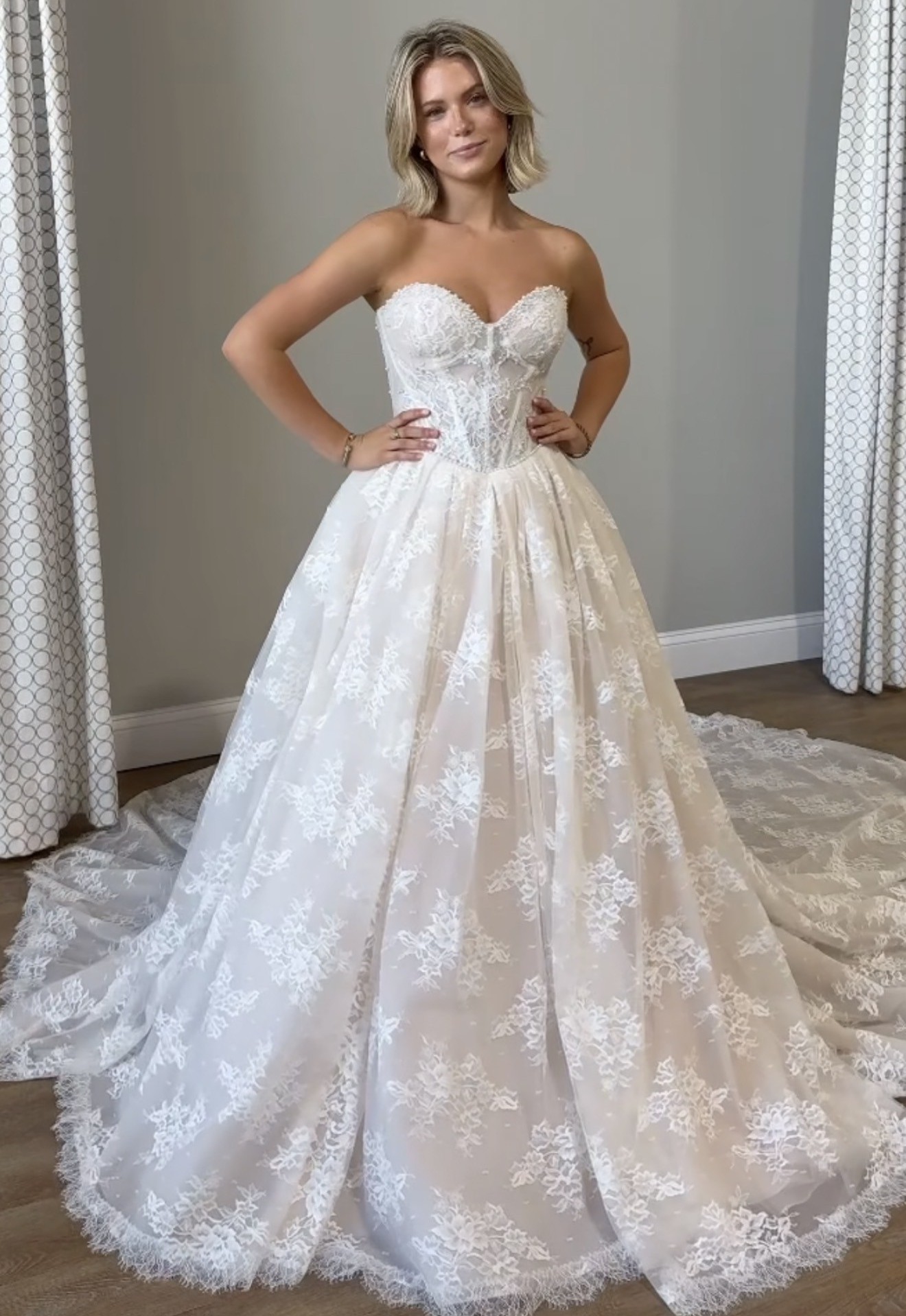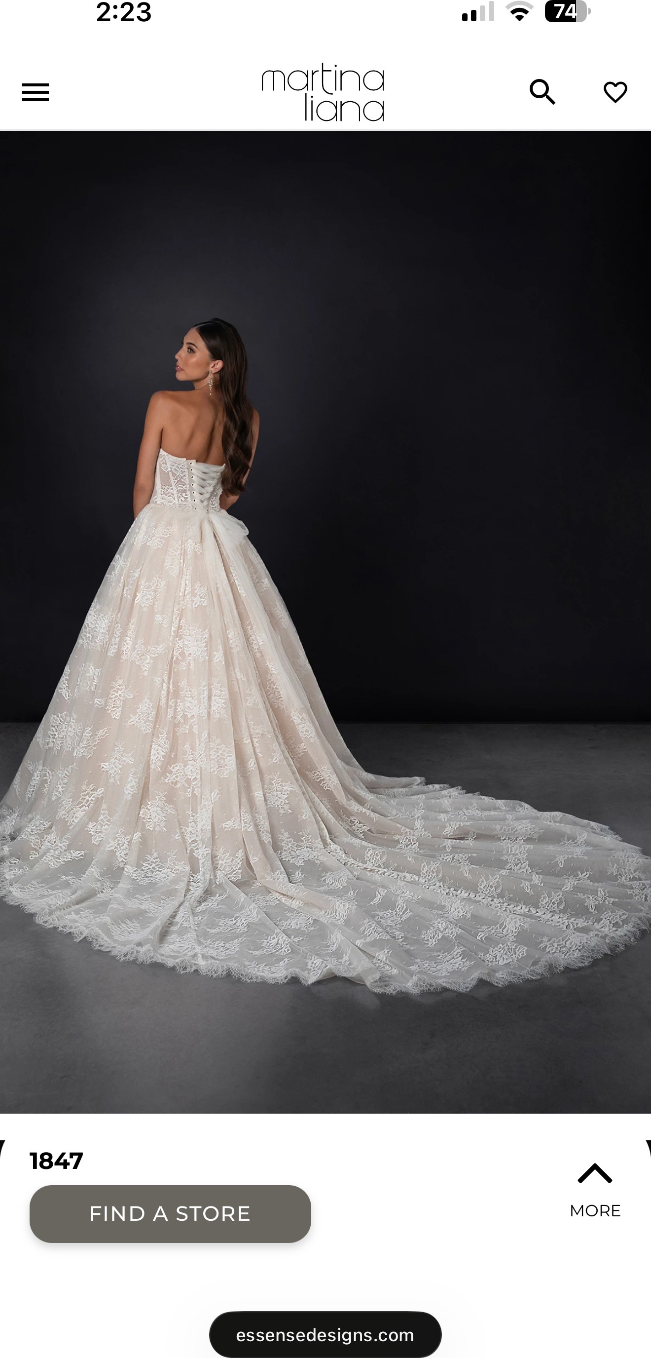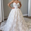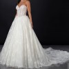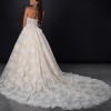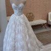 From the website: A fairytale romance comes to life, this lace ballgown wedding dress exudes romantic charm from every angle. Style 1847 features a strapless pearl-embellished sweetheart neckline atop a princess-inspired corset bodice. A charming laced back detail concludes with a delicate tulle bow to meet the classic Basque waist outlined in pearl beads. The romantic floral motifs cascade throughout the voluminous ballgown skirt that comes in both lined and unlined options, culminating in an exquisite eyelash lace trim at the hemline. This princess ballgown wedding dress brings the magic to that happily ever after moment