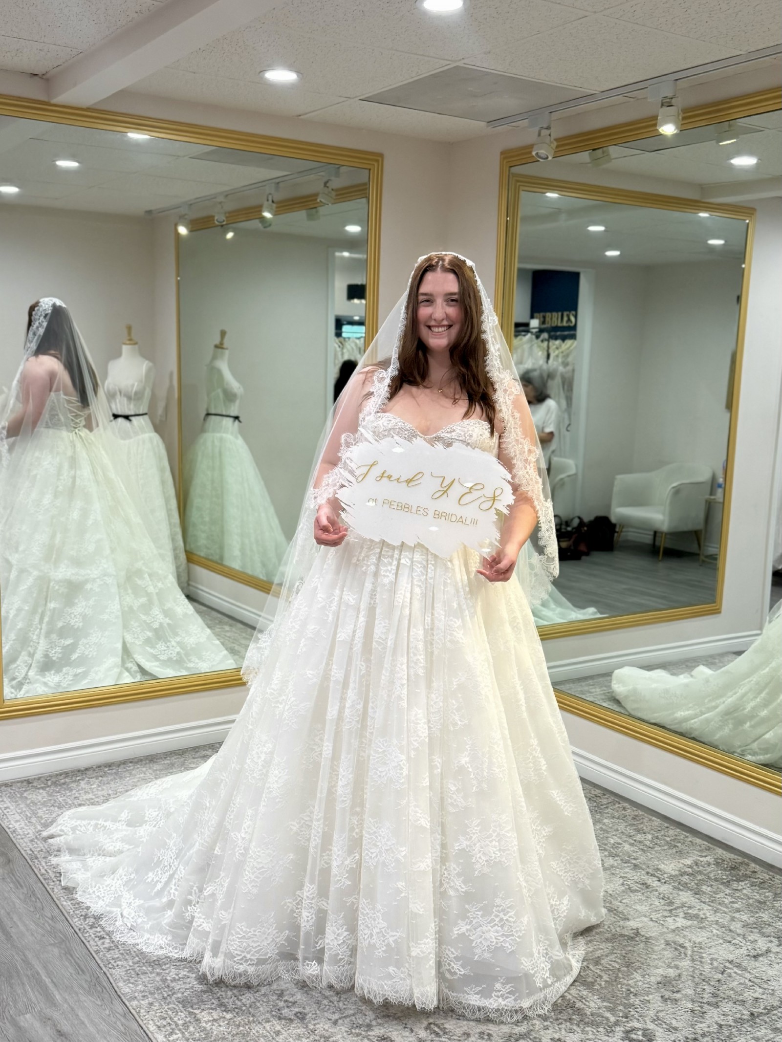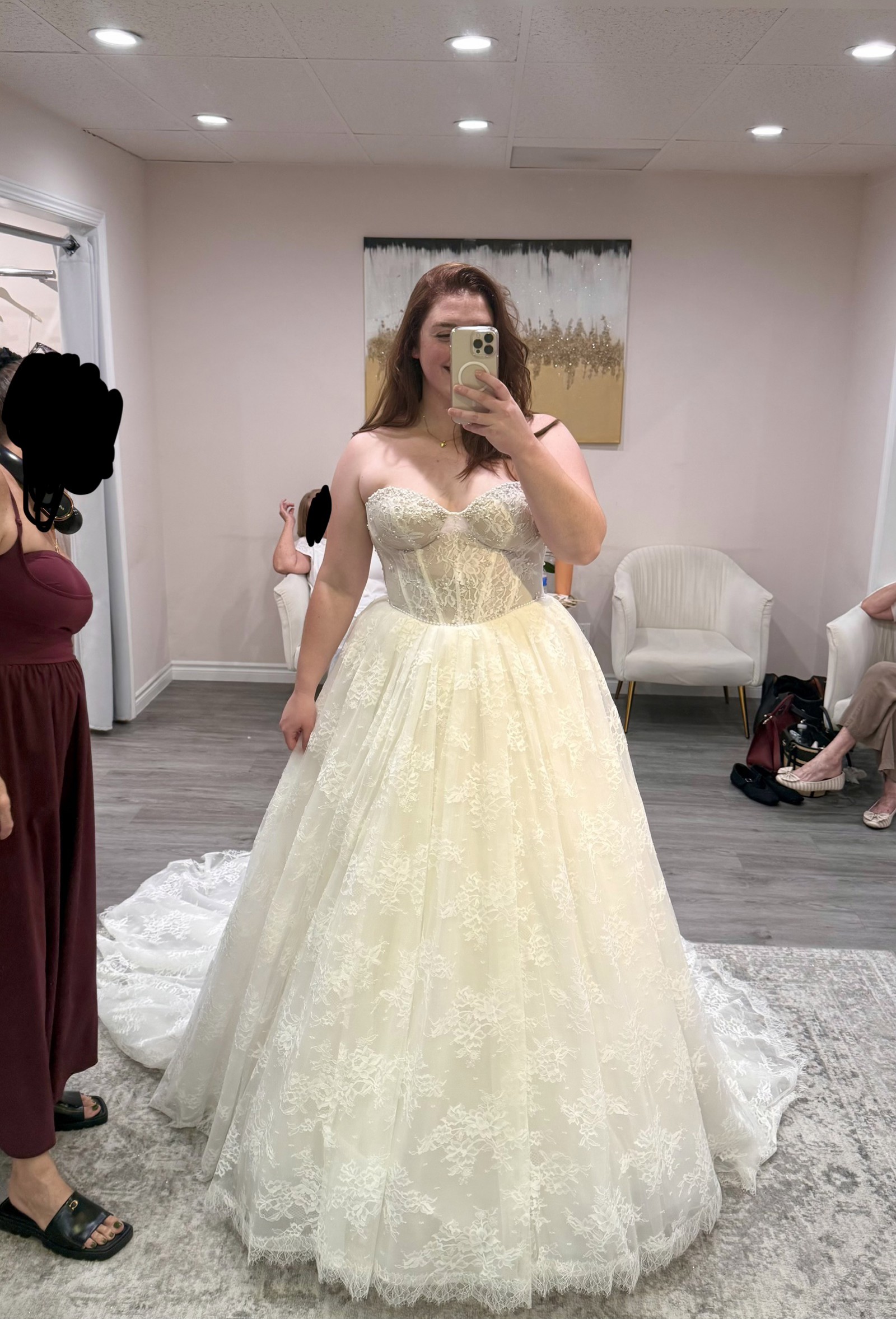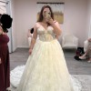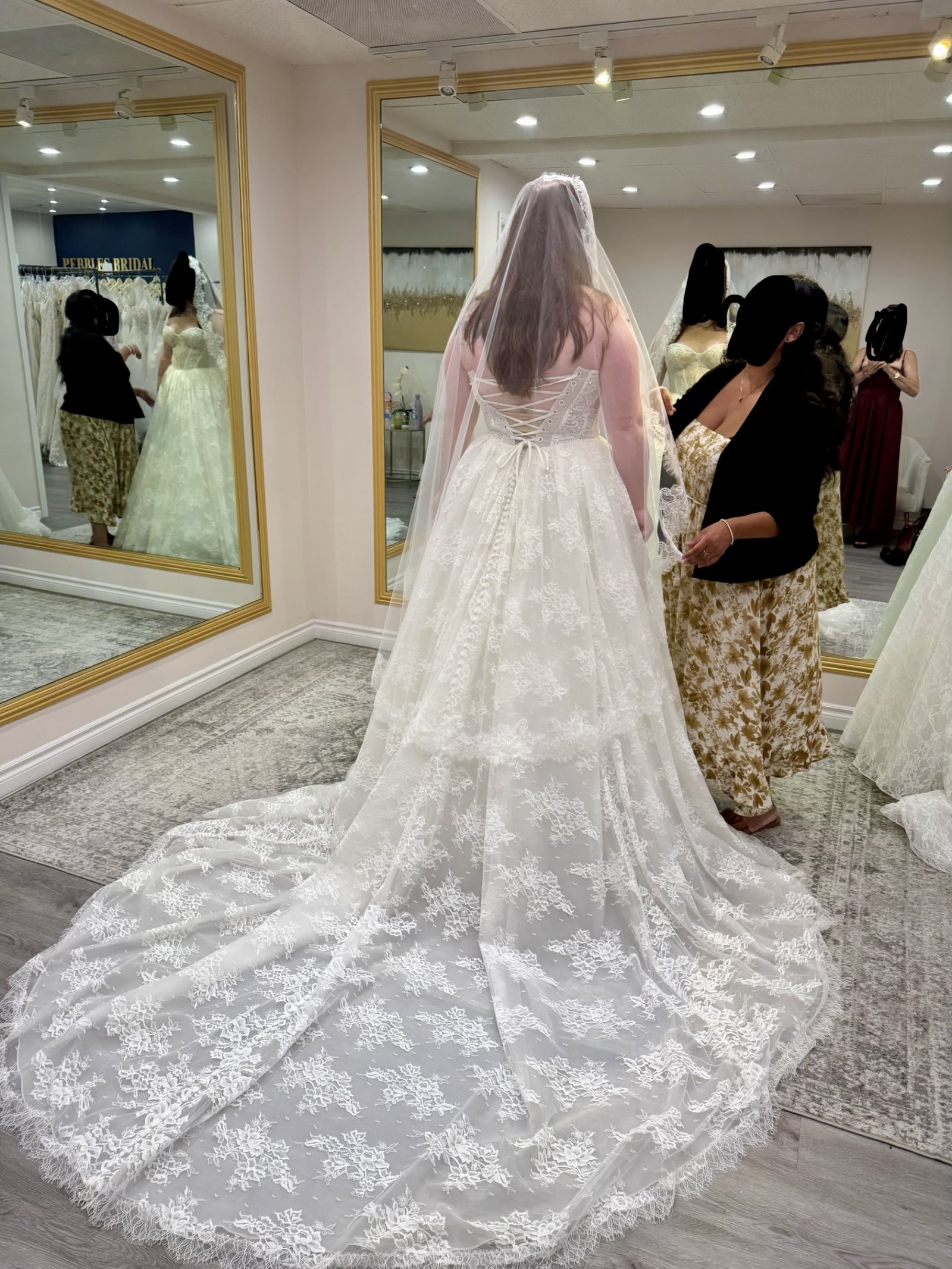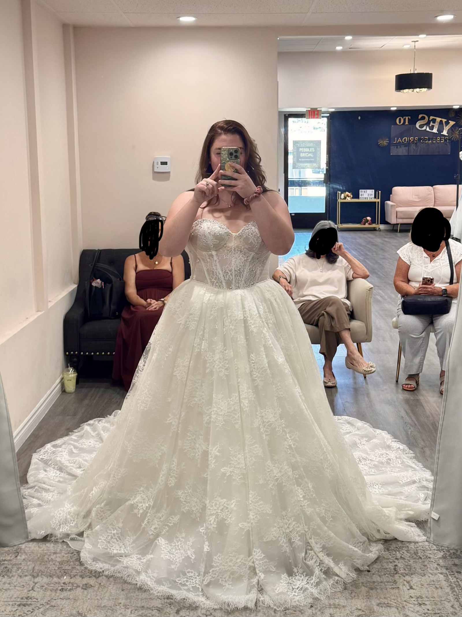 From the website: A fairytale romance comes to life, this lace ballgown wedding dress exudes romantic charm from every angle. Style 1847 features a strapless pearl-embellished sweetheart neckline atop a princess-inspired corset bodice. A charming laced back detail concludes with a delicate tulle bow to meet the classic Basque waist outlined in pearl beads. The romantic floral motifs cascade throughout the voluminous ballgown skirt that comes in both lined and unlined options, culminating in an exquisite eyelash lace trim at the hemline. This princess ballgown wedding dress brings the magic to that happily ever after moment