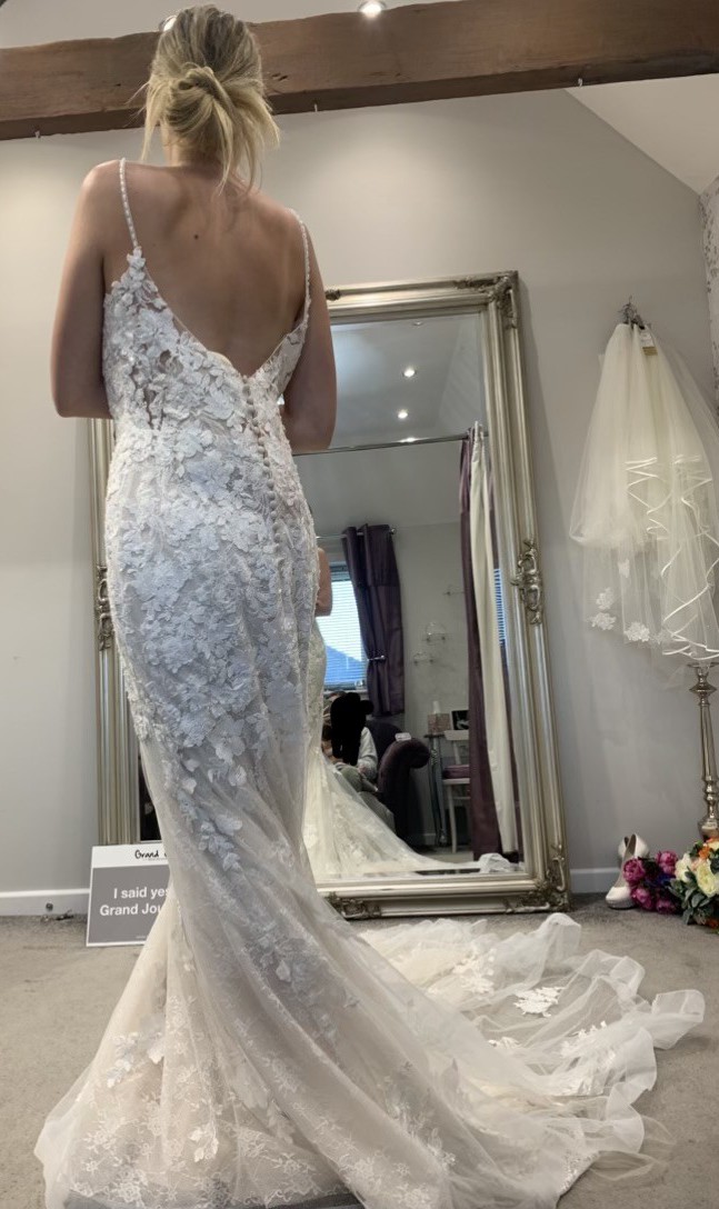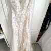 This stunning Mon Cheri Collection dress by designer Martin Thornburg encapsulates elegance and modernity with its fit and flare silhouette, ideal for the bride who desires to make a striking impression. Crafted in a size 12, this exquisite gown showcases a flattering V-neckline that accentuates the décolletage while maintaining a sophisticated allure. The delicate spaghetti straps offer both support and a touch of romance, elegantly framing the shoulders.