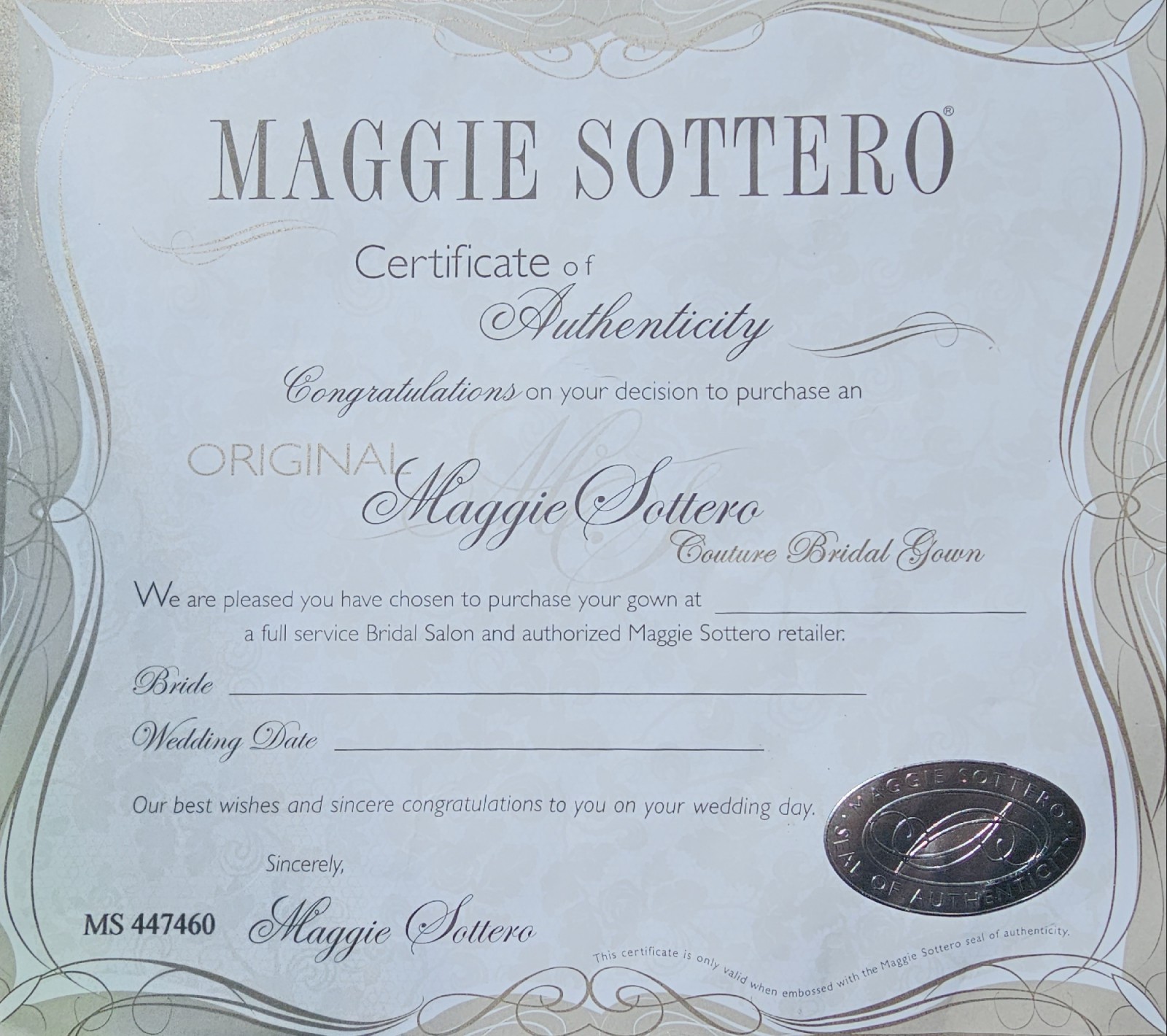 This is an Haute Couture dress from Maggie Sottero. You can see it on the tag. It comes with the Certificate of Authenticity from Maggie Sottero.