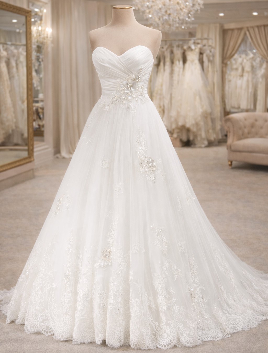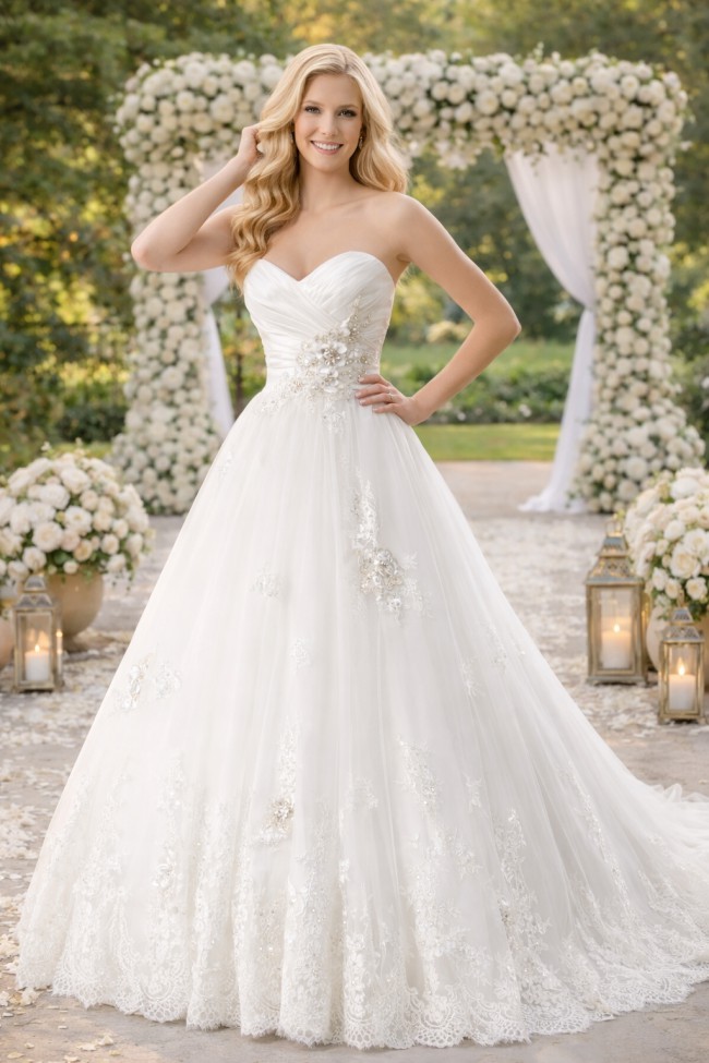 This Gorgeous, romantic wedding dress by Maggie Sottero is the embodiment of romance and elegance, perfect for the bride who dreams of a fairytale celebration. The enchanting ballgown silhouette flatters your figure while the sweetheart neckline gracefully highlights your décolletage. Crafted from exquisite ivory lace, this dress combines timeless beauty with intricate detailing, ensuring you feel nothing short of magical on your special day.
