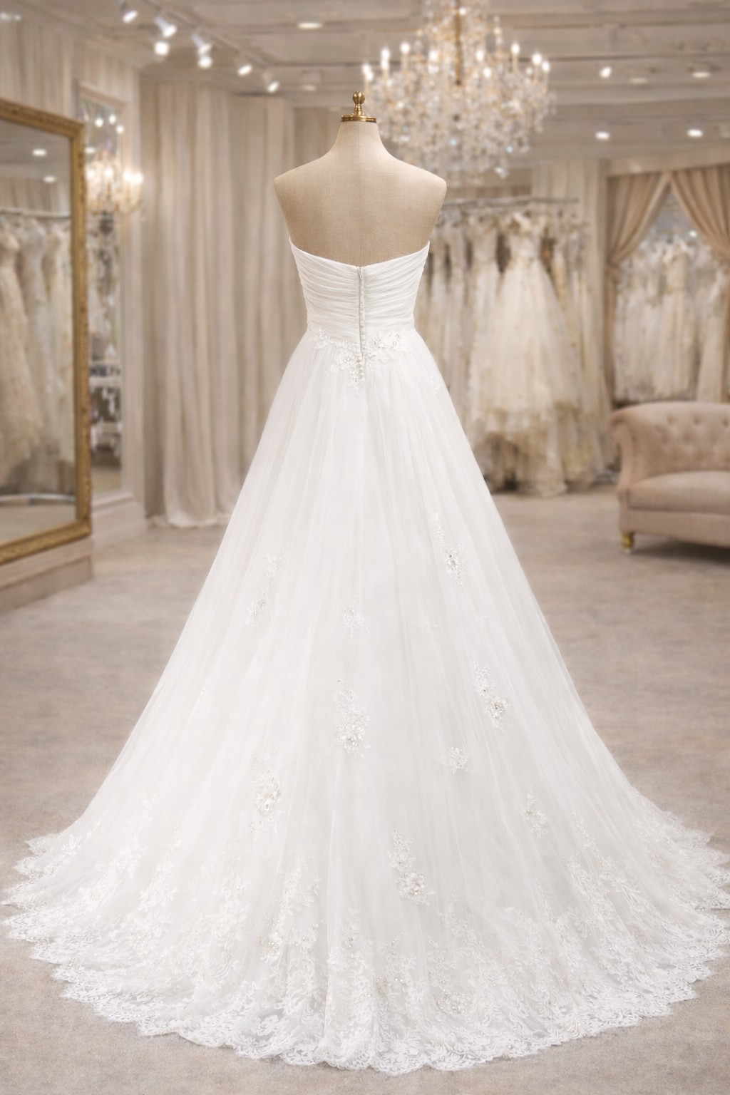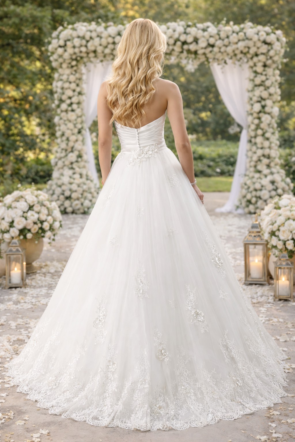 The strapless design adds a touch of allure, allowing you to move freely and gracefully as you enjoy every moment with your loved ones. The mid-back enhances your silhouette while providing a touch of sophistication, making this dress a stunning choice for a bride looking to make a lasting impression.