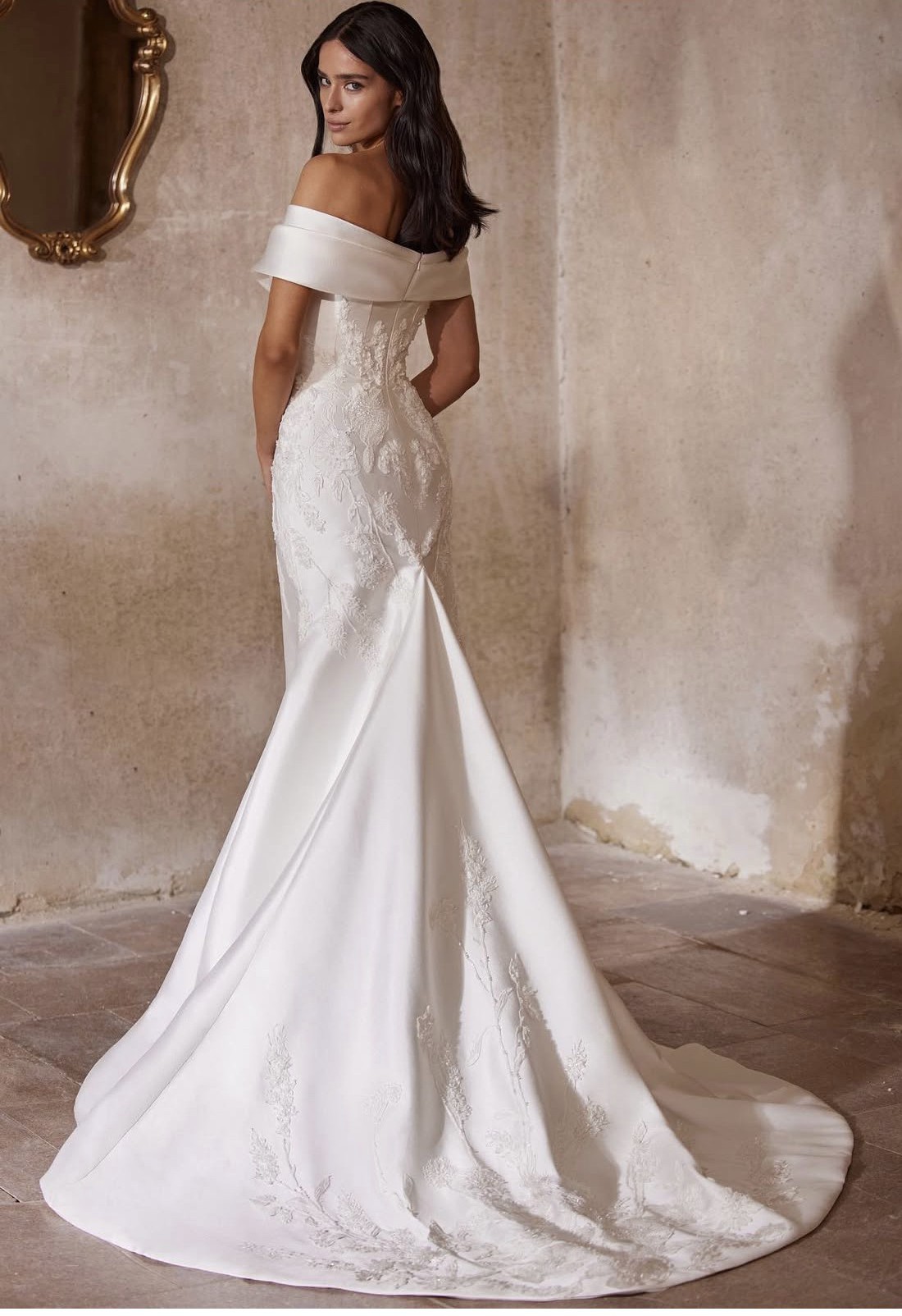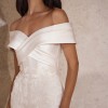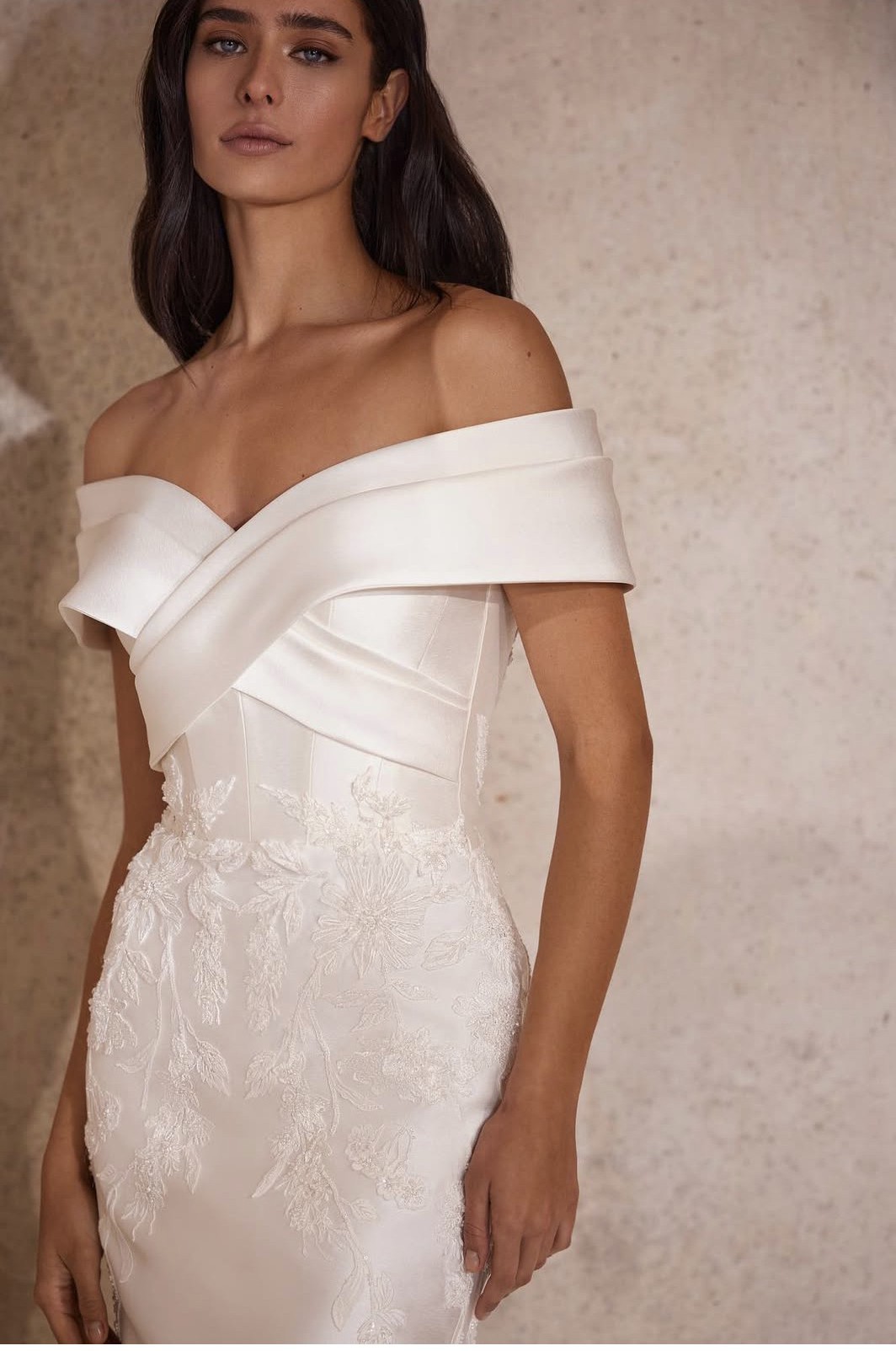 This Ambrosia gown by Luce Sposa is the epitome of bridal elegance. Crafted for the modern romantic, this A-line silhouette flatters every figure, gracefully enhancing your natural curves while providing comfort and ease. The off-the-shoulder neckline adds a touch of allure, framing the décolletage beautifully and making it perfect for both formal ceremonies and intimate celebrations.