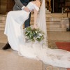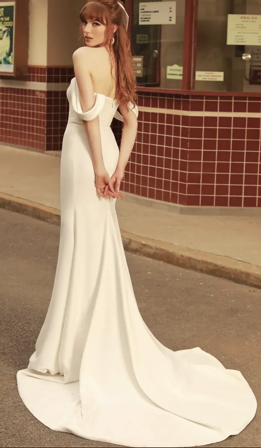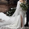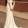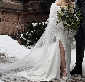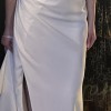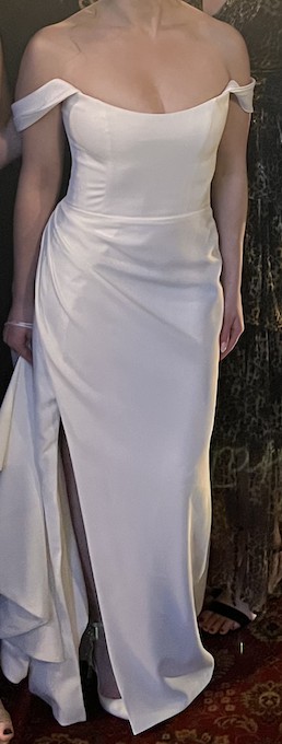 Sleek and elegant with boning in bodice and high slit. Wrist loop train. Detachable off shoulder sleeves. Bra cups sewn in but support of bodice does most of the work. Veil is cathedral length.
