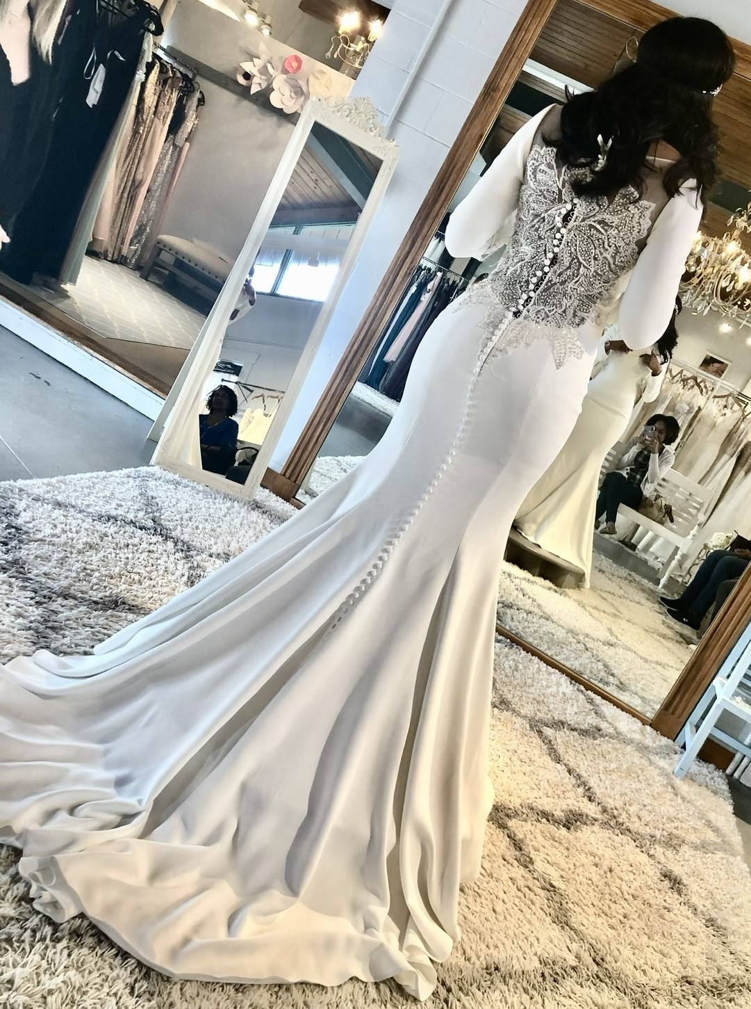 from top to bottom. An elaborately beaded motif on the sheer illusion back