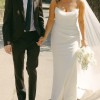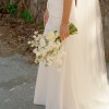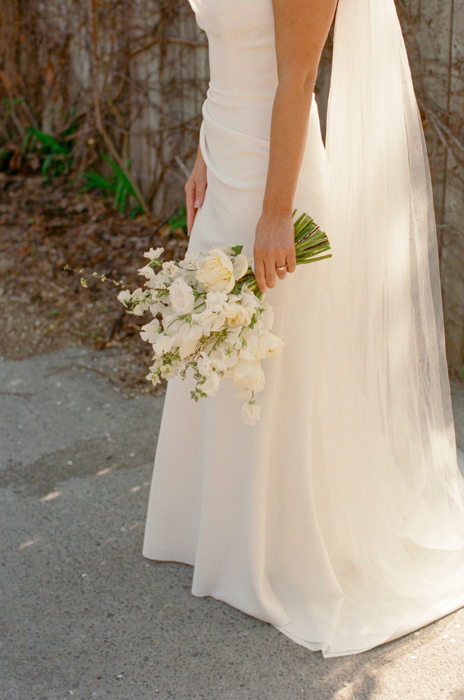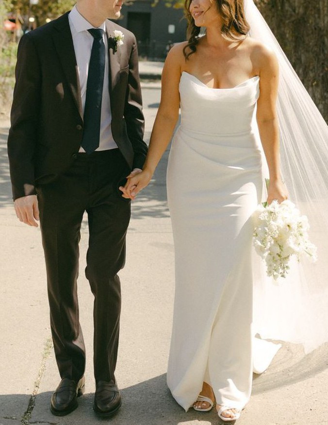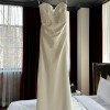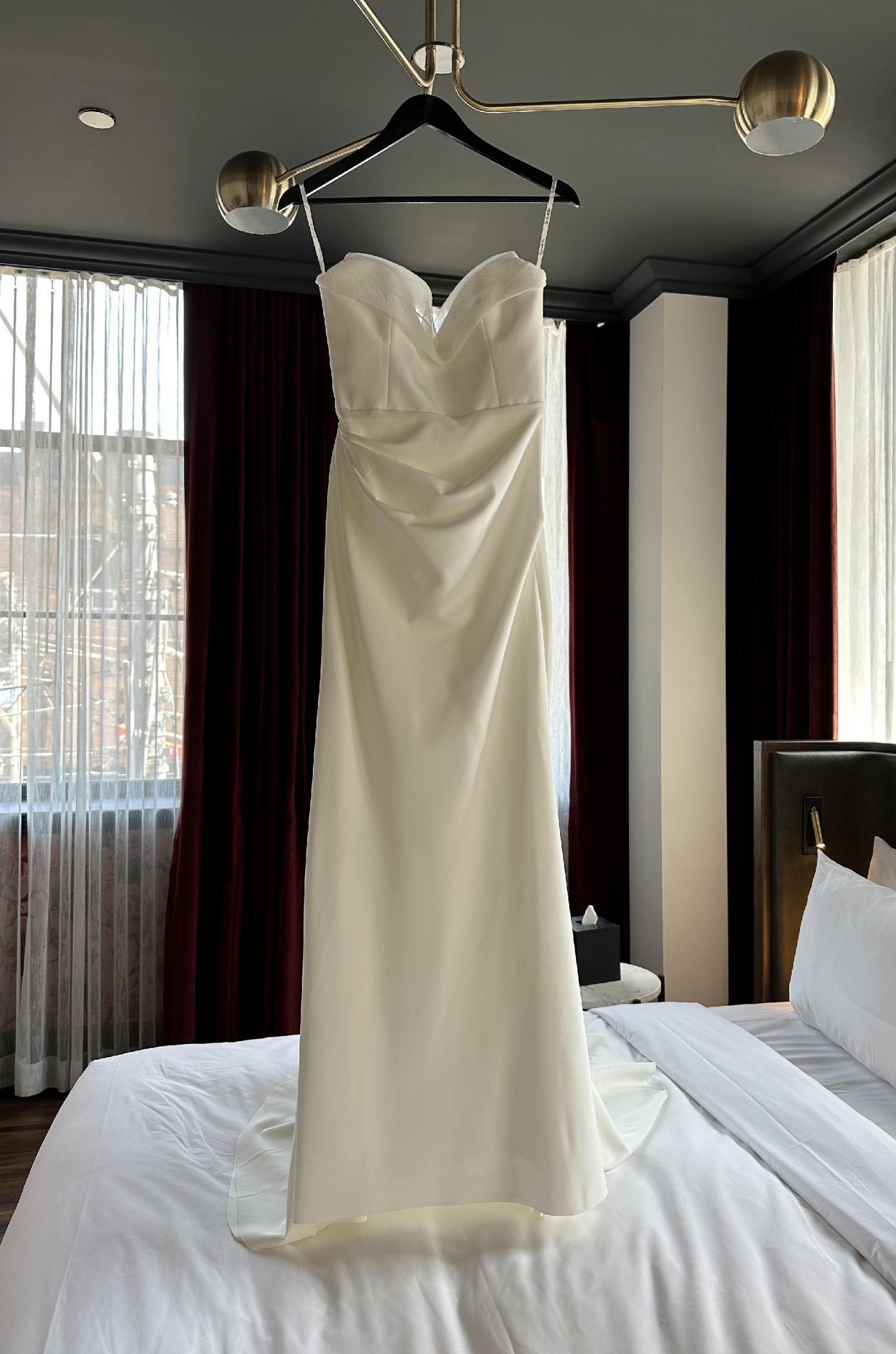This gown features a structured sweetheart neckline adorned with draped bodice details, embellished in textured organza for a touch of ethereal charm. Delicate ruching along the waistline adds graceful definition, enhancing the silhouette with understated allure and feminine sophistication.