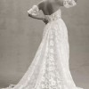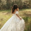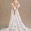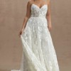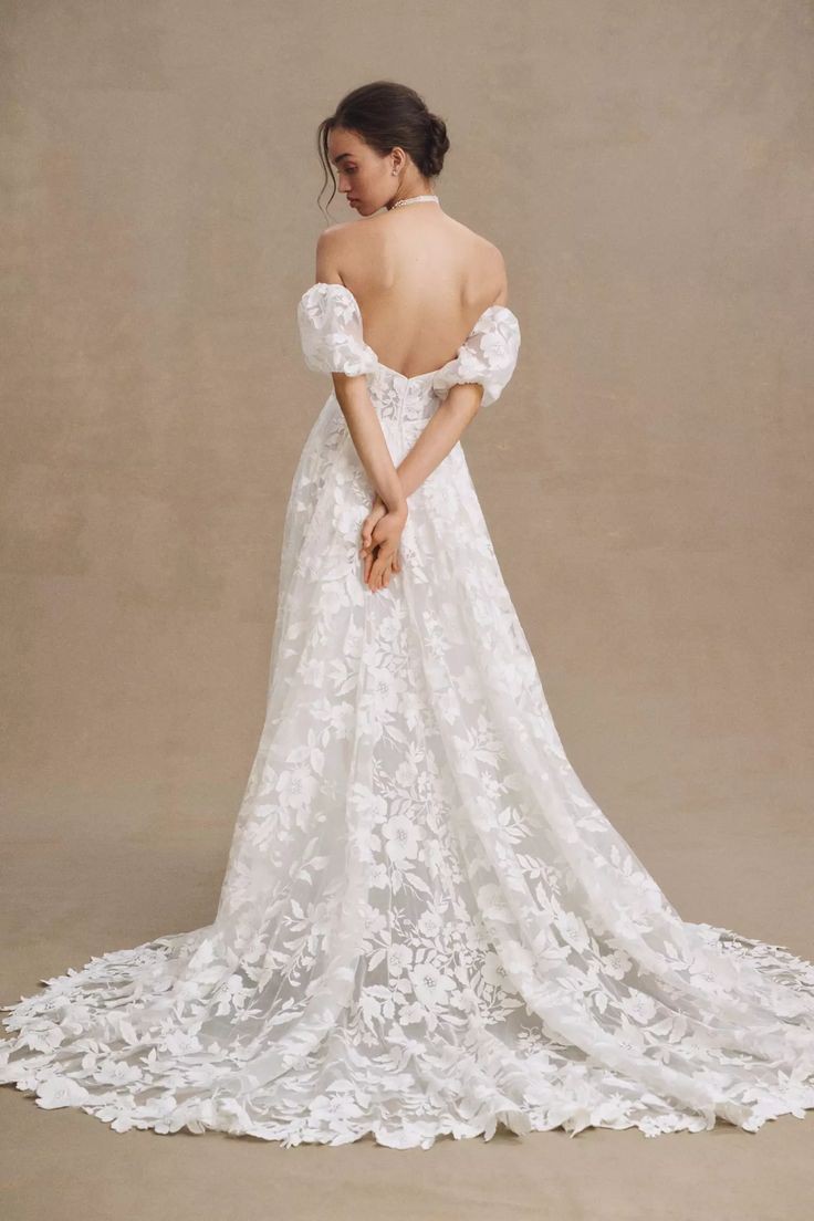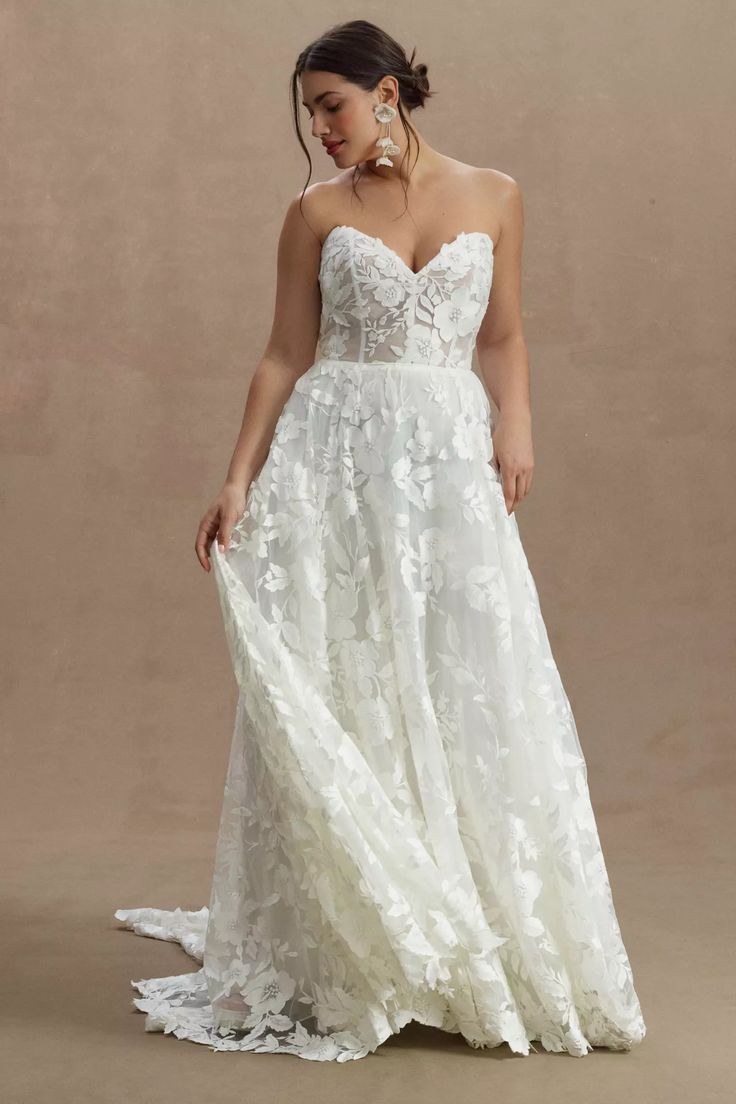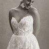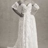 Crafted with intricate lace appliqués, the Madeline Wedding Gown features a structured, strapless bodice and removable puff sleeves for added drama.