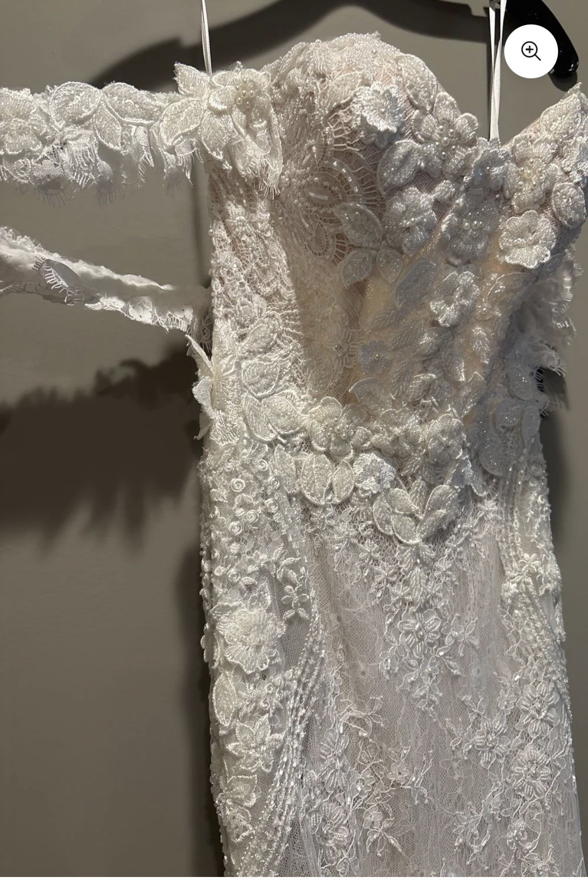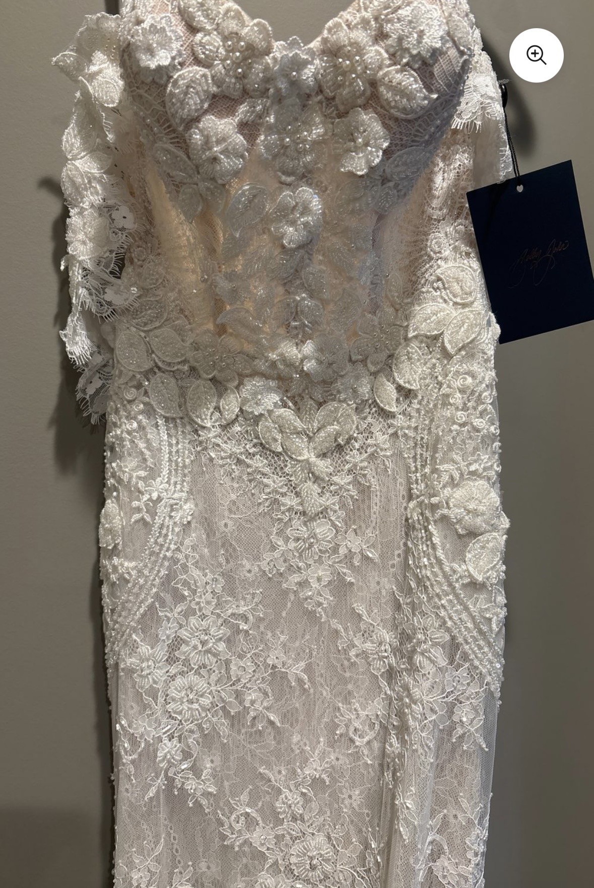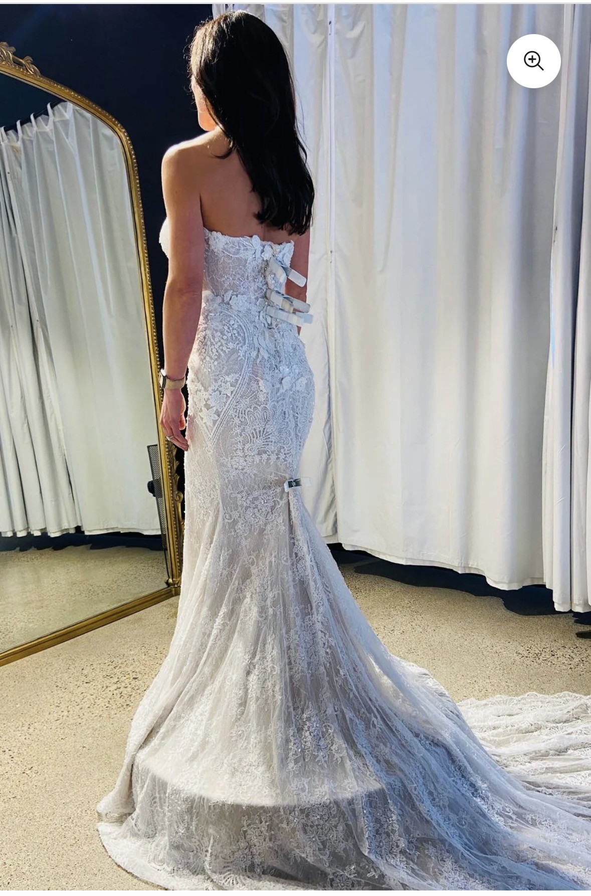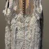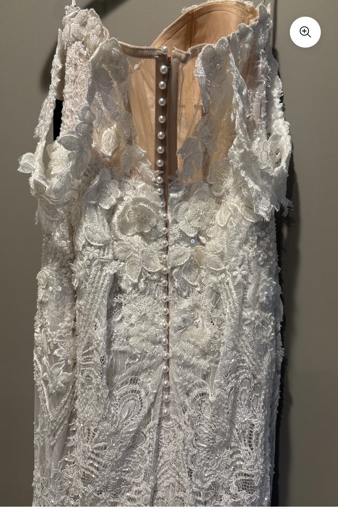 Never worn, custom lace dress. Designed with off the shoulder straps from Latrice, which are removable for a versatile look. Custom sheer corset back in nude mesh and pearl buttons positioned all the way down the zipper. Waist with distinct pattern, accentuating figure.
