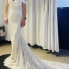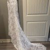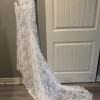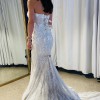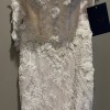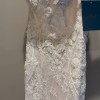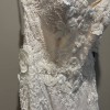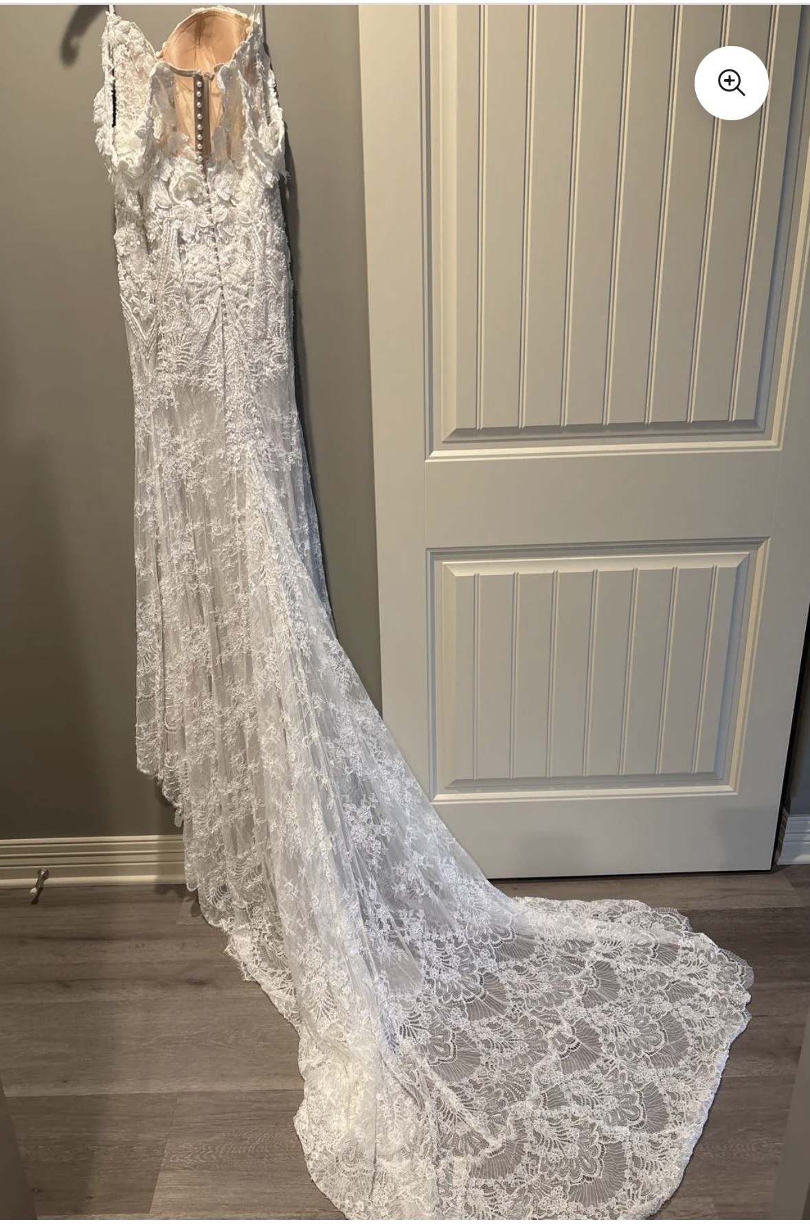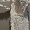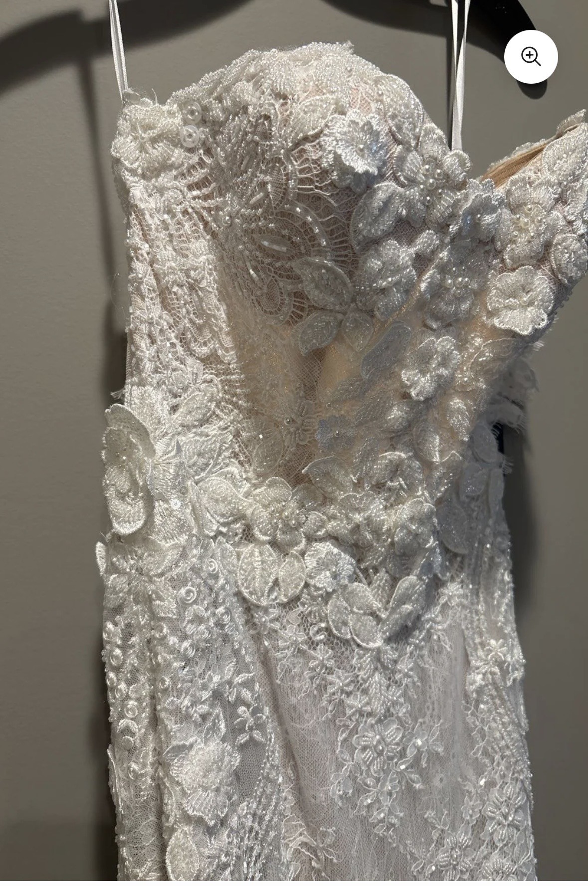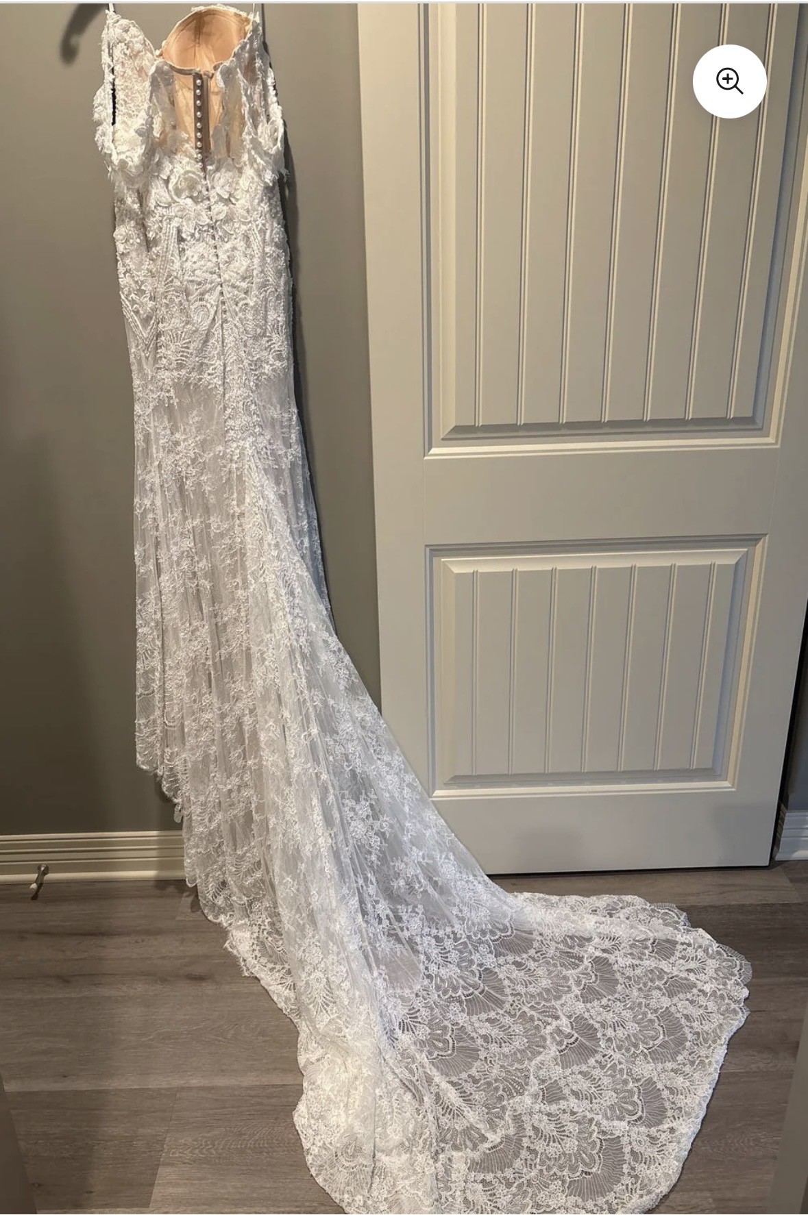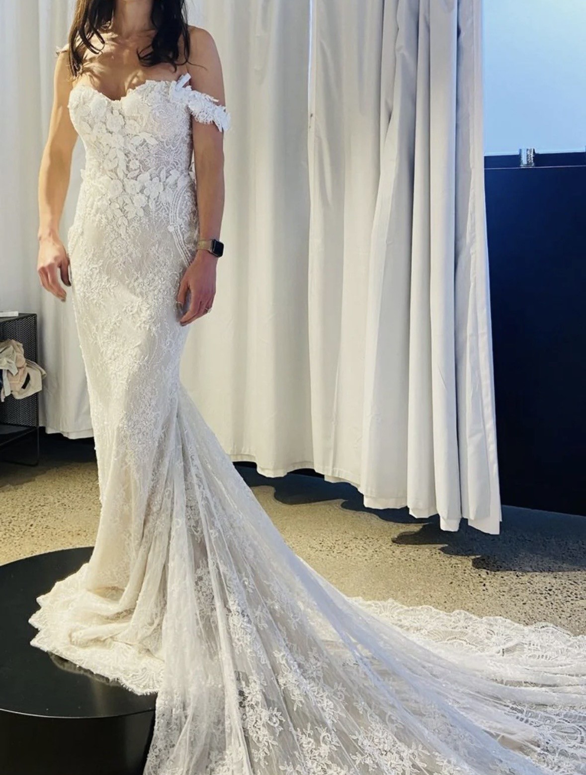 Never worn, custom lace dress. Designed with off the shoulder straps from Latrice, which are removable for a versatile look. Custom sheer corset back in nude mesh and pearl buttons positioned all the way down the zipper. Waist with distinct pattern, accentuating figure.