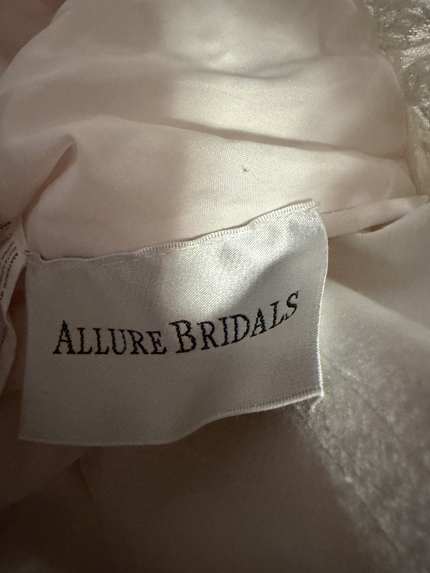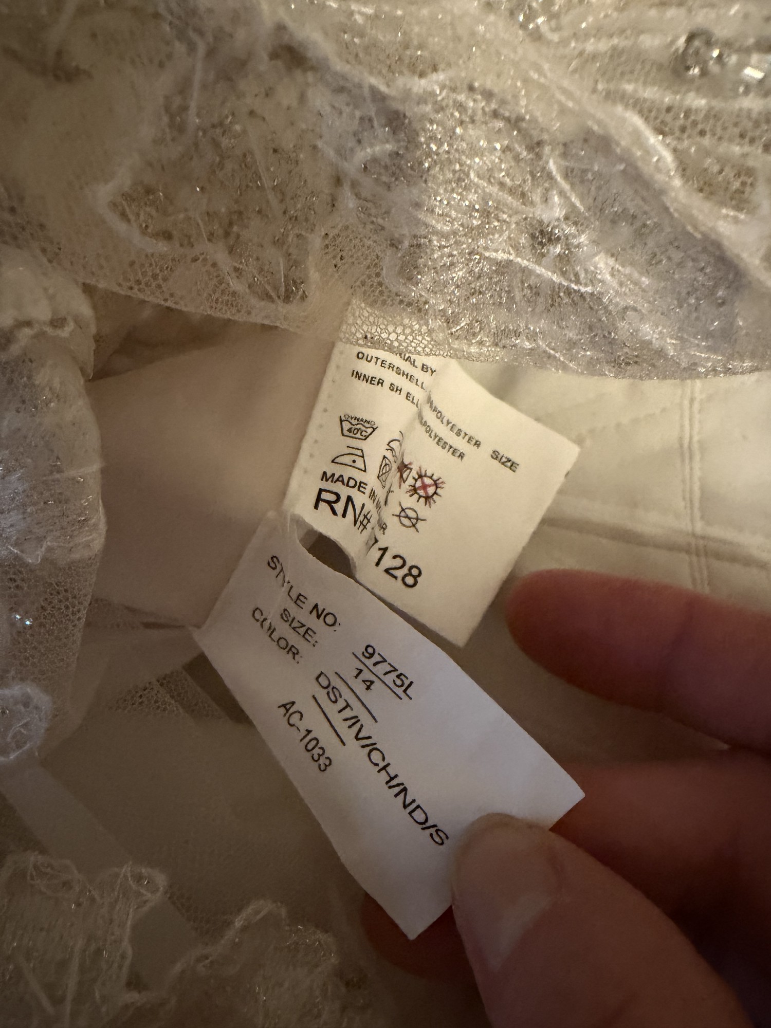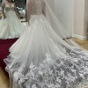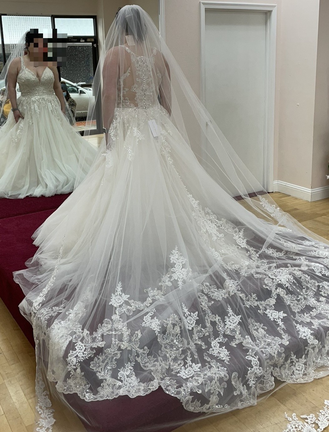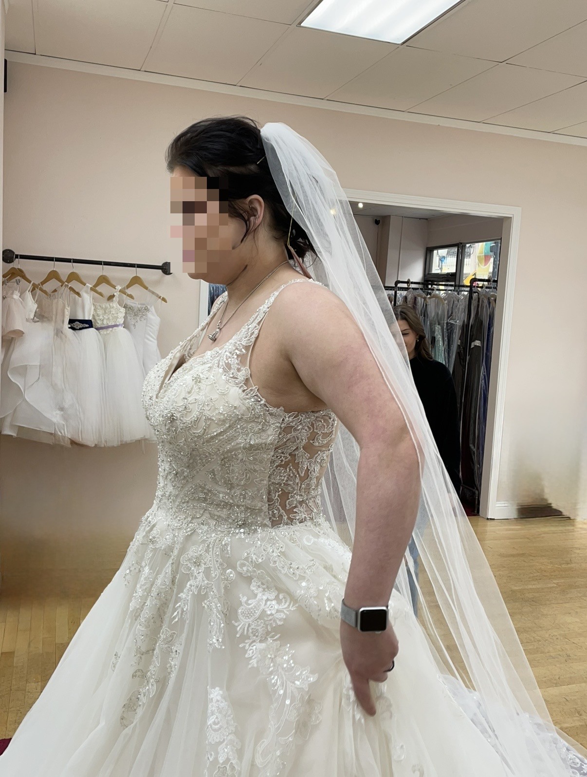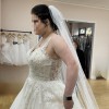 Beautiful ballgown style. Embellished with pearls and sequins, embroidery. Sheer back. Veil included as in photo. Never worn. Not altered.