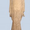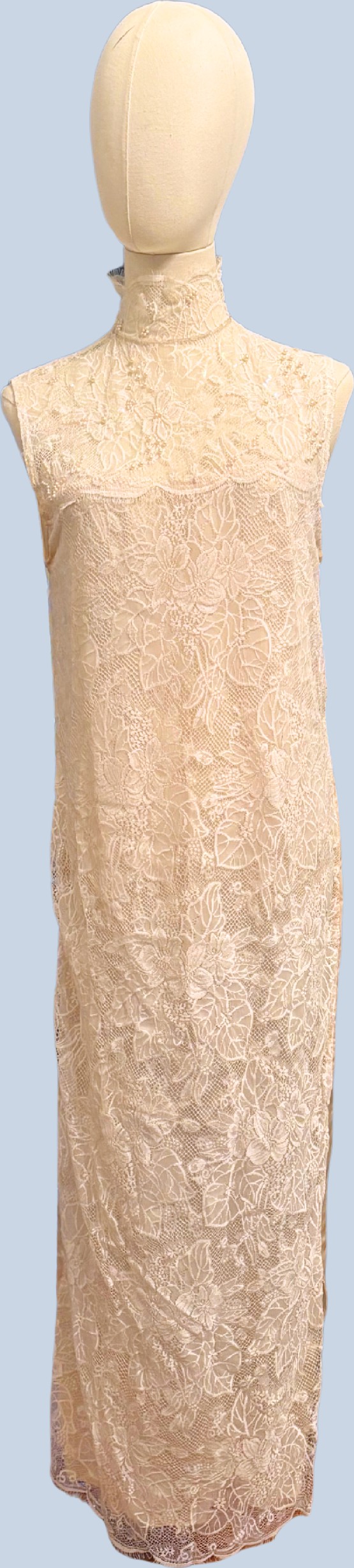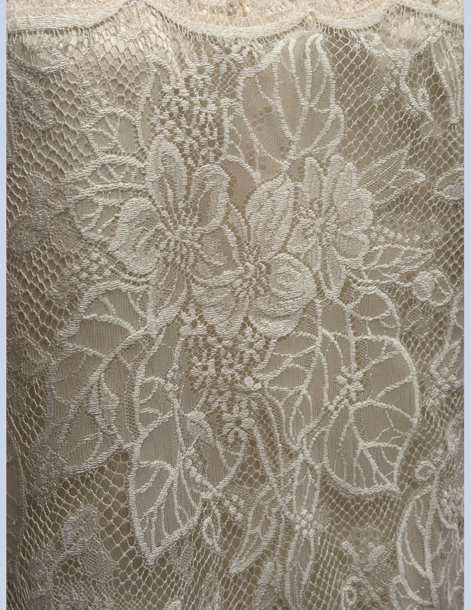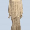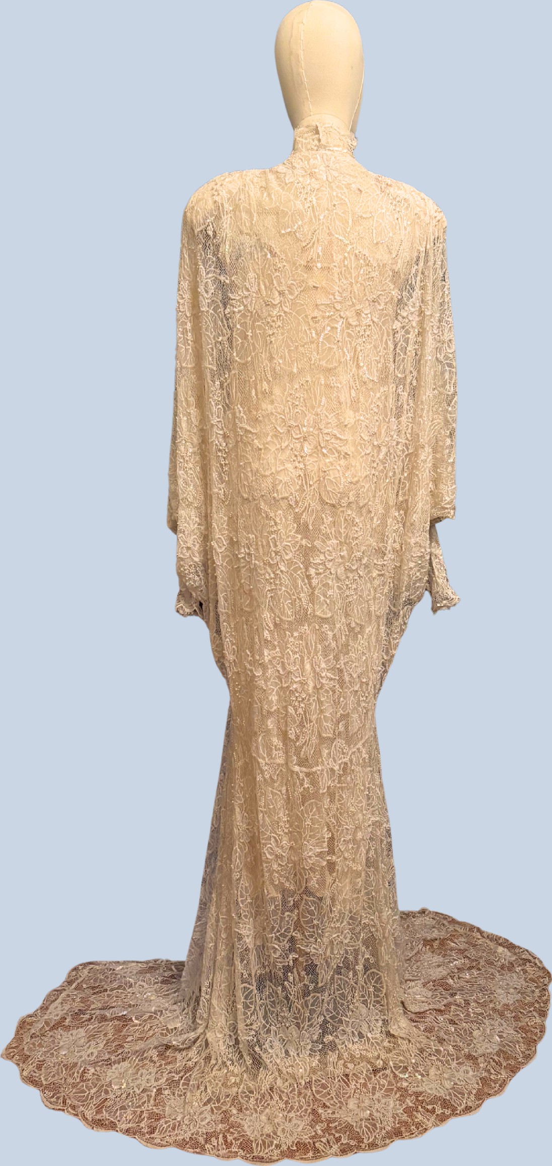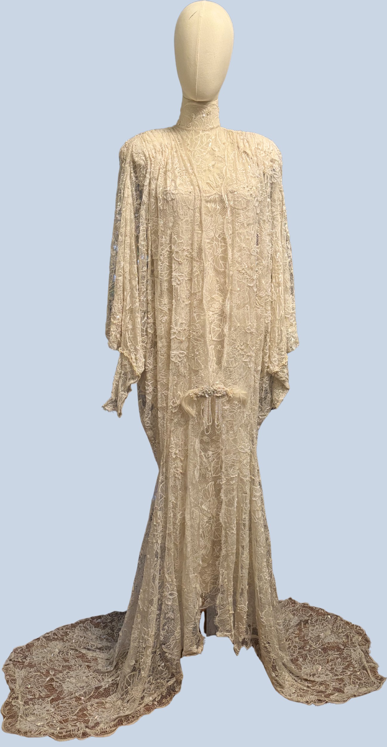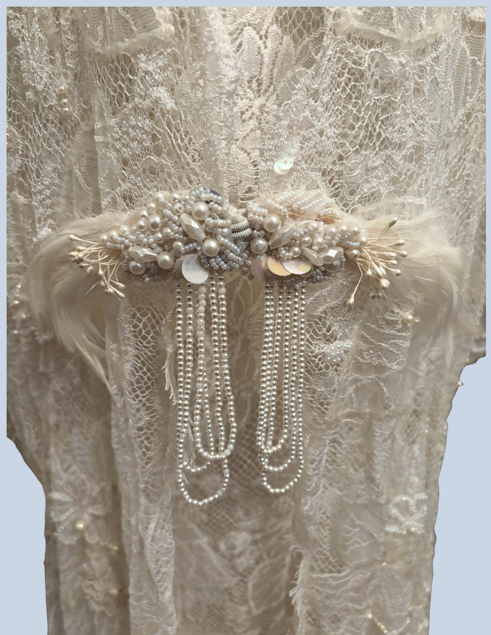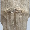 This beautiful Erté-inspired deco wedding dress sparkles with every move. You will not only be the "belle-of-the-Ball" but will show off your personal style in this unique wedding dress. There is a simple, sleeveless under dress made of silk and lace and a lace over piece that buckles in the front with a gorgeous hand-made pearl clasp before it flows in all directions to the ground. This dress is handmade with 1500 real pearls, sequins and lace that makes it one of the finest pieces you will ever wear!