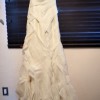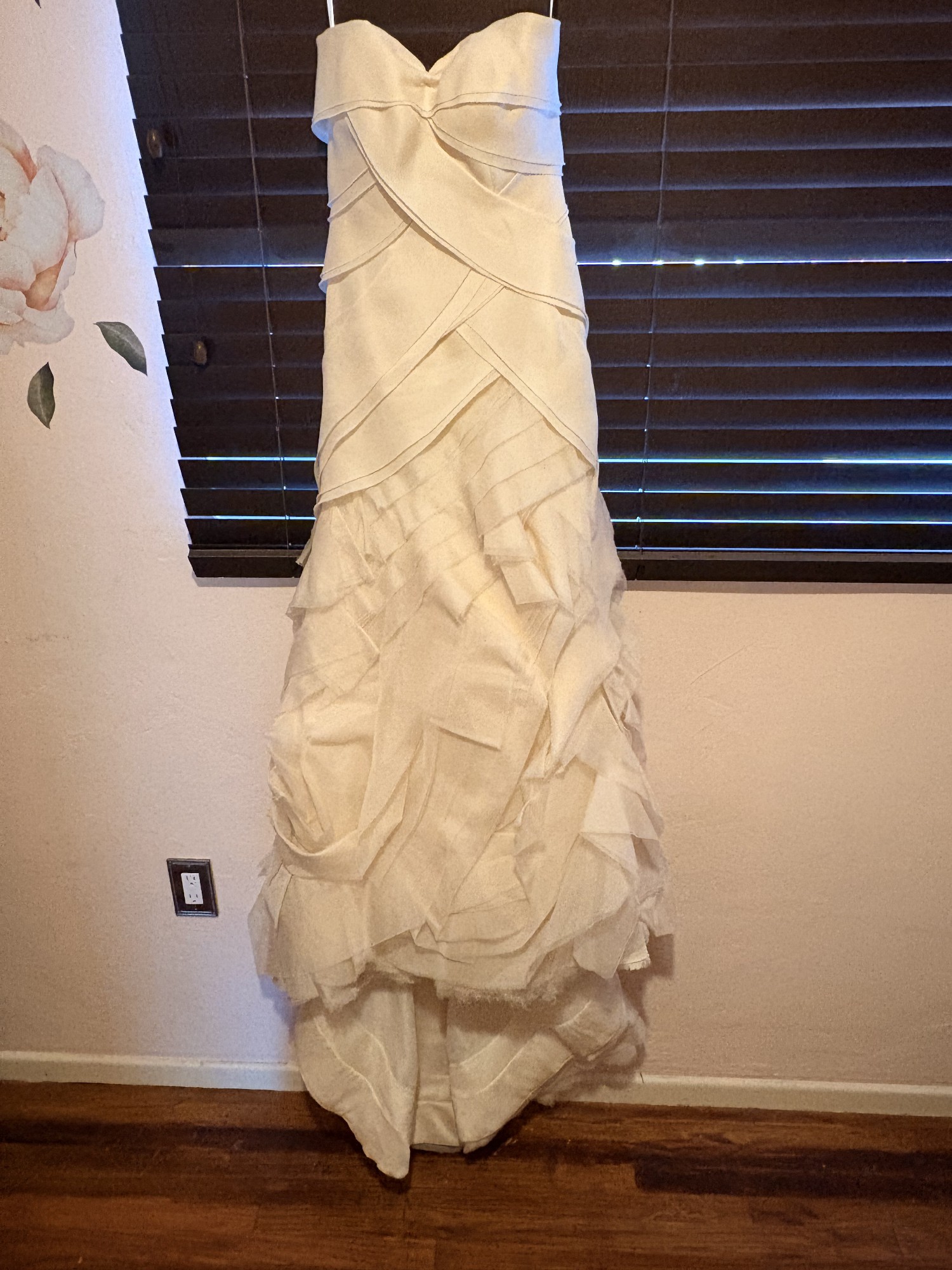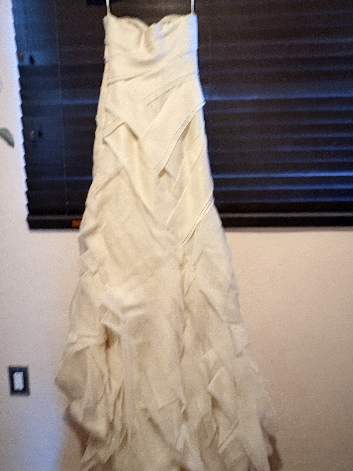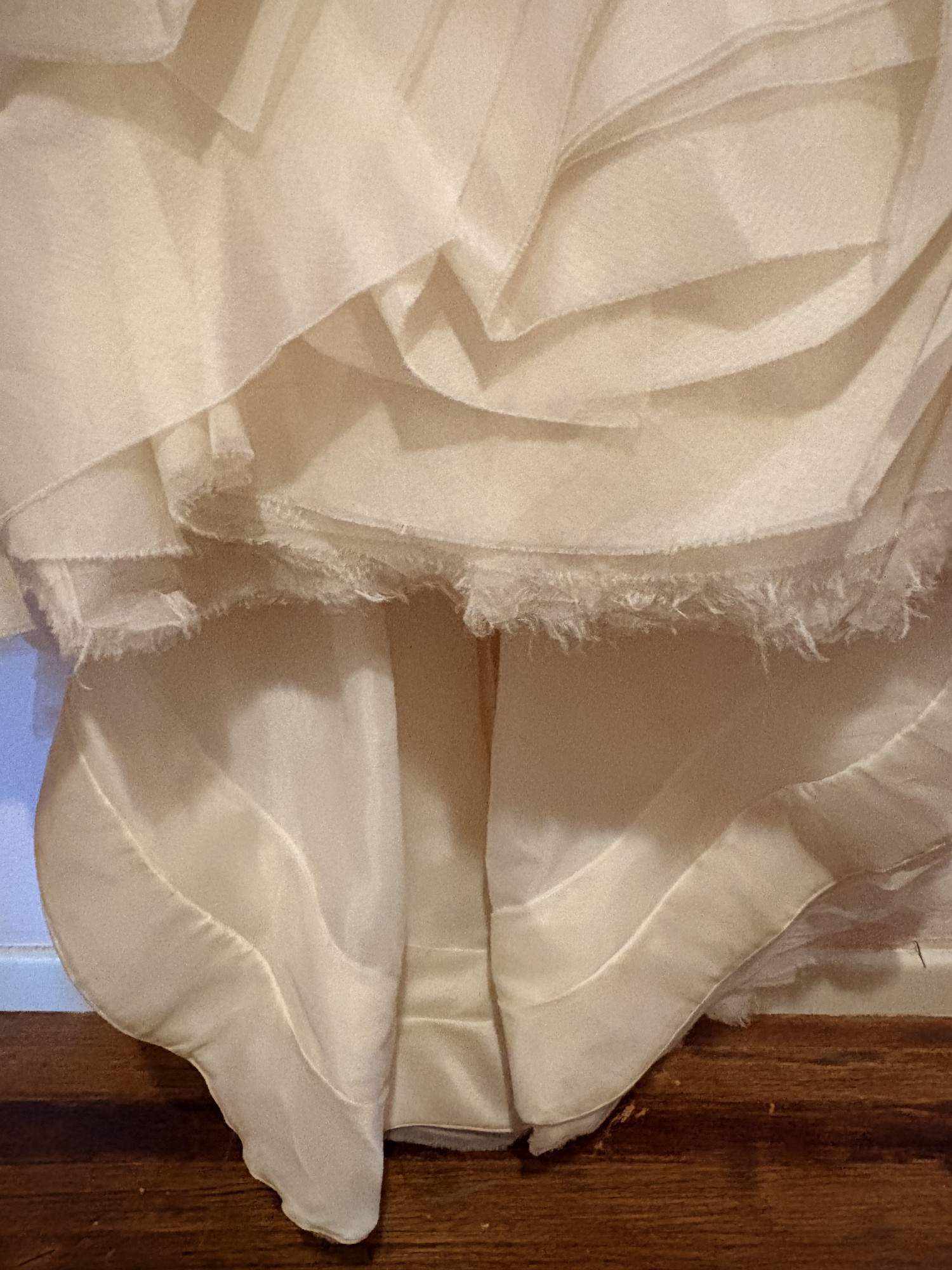This dress has been modified to a sweetheart neckline. The bottom of the dress is torn and can be fixed during alterations. Otherwise it is in excellent condition.