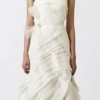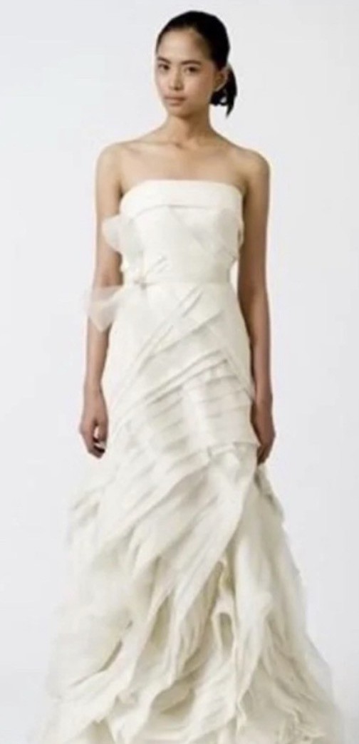 The Vera Wang Erica is a well-known, luxurious, and structured trumpet/mermaid-style wedding dress featuring a straight, strapless, or off-the-shoulder neckline. It is characterized by detailed, often diagonal, organza lattice work down the front and back, with a dramatic flared skirt starting around mid-thigh.
