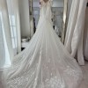 The train is 94” from the natural waist. The train is currently plain for a clean, modern look. The lace appliqué has not yet been attached, so you can completely customize the design to your vision.