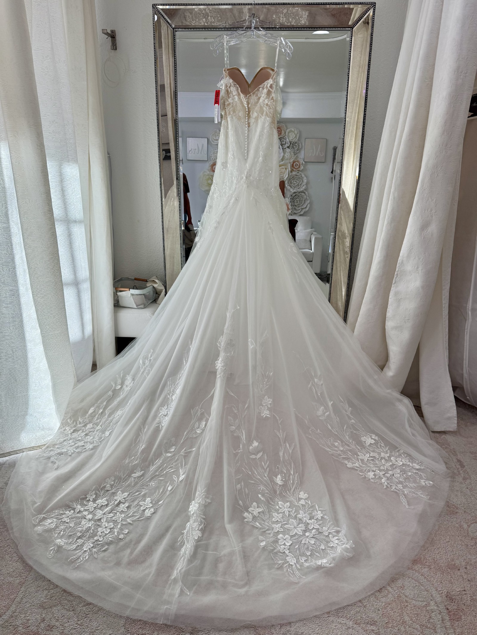 A layer of tulle has also been added to the train for additional opacity, that's why it looks fuller from the photos on the designer's website. But don't worry the gown is extremely lightweight and easy to move in.
