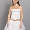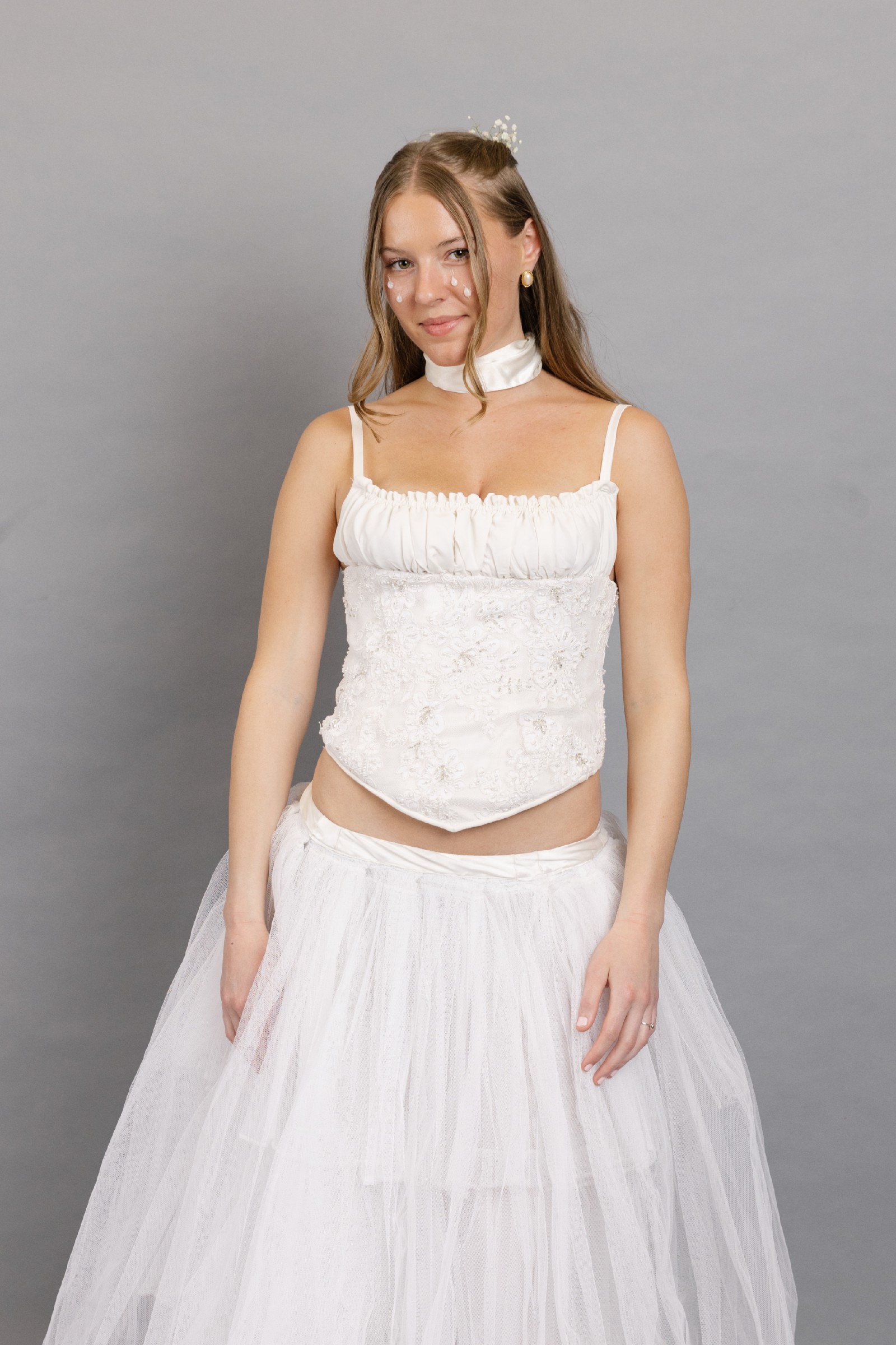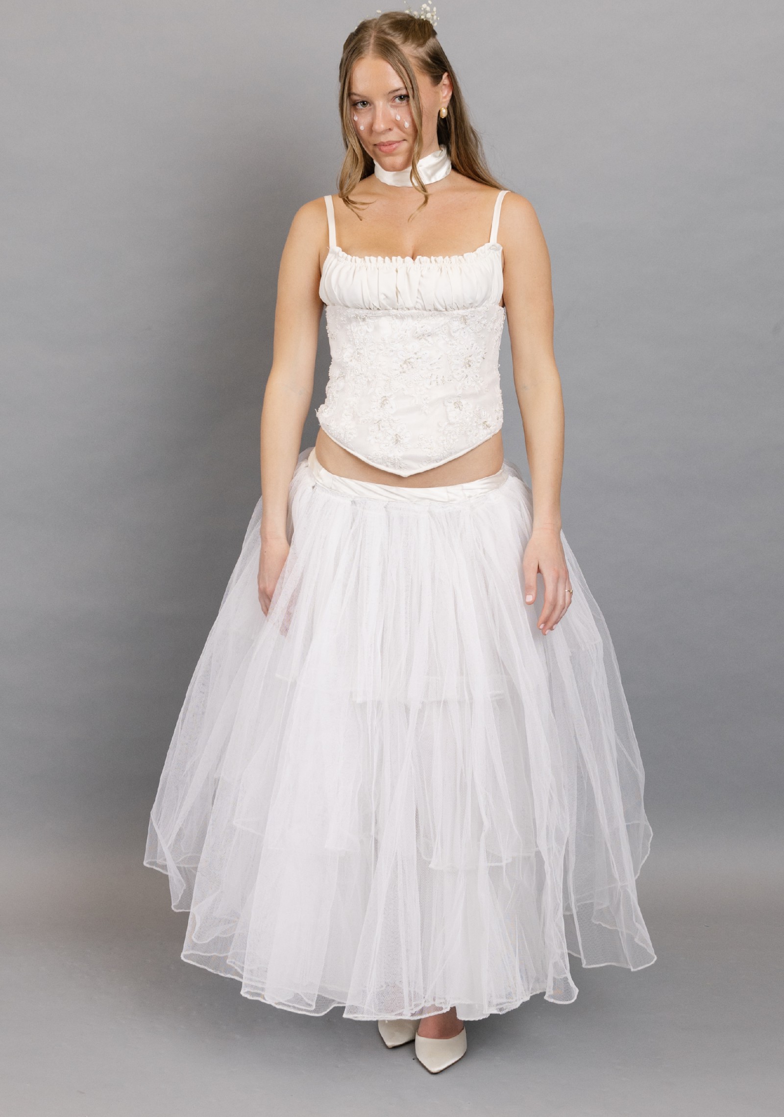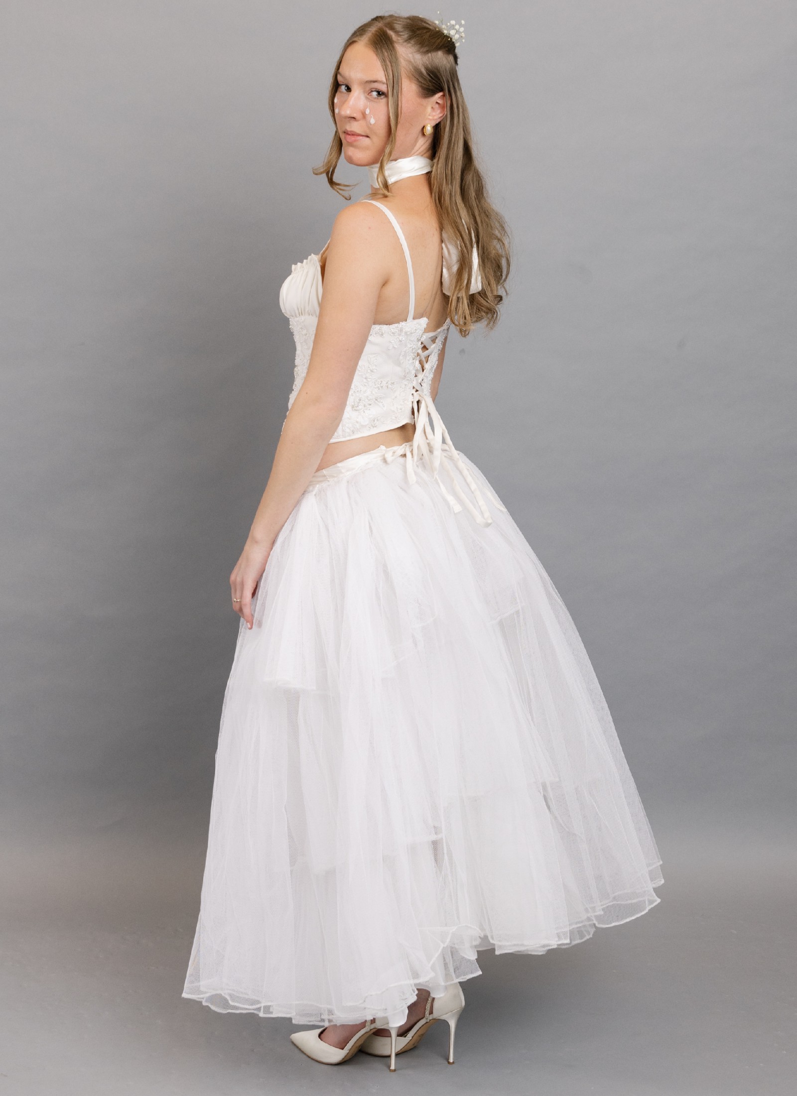 Enchanting tea length tulle skirt channeling a whimsical ballerina spirit with romantic basque corset and beaded lace. 2-piece look together. Skirt is adjustable waist, can be worn low waisted or at natural waist.
