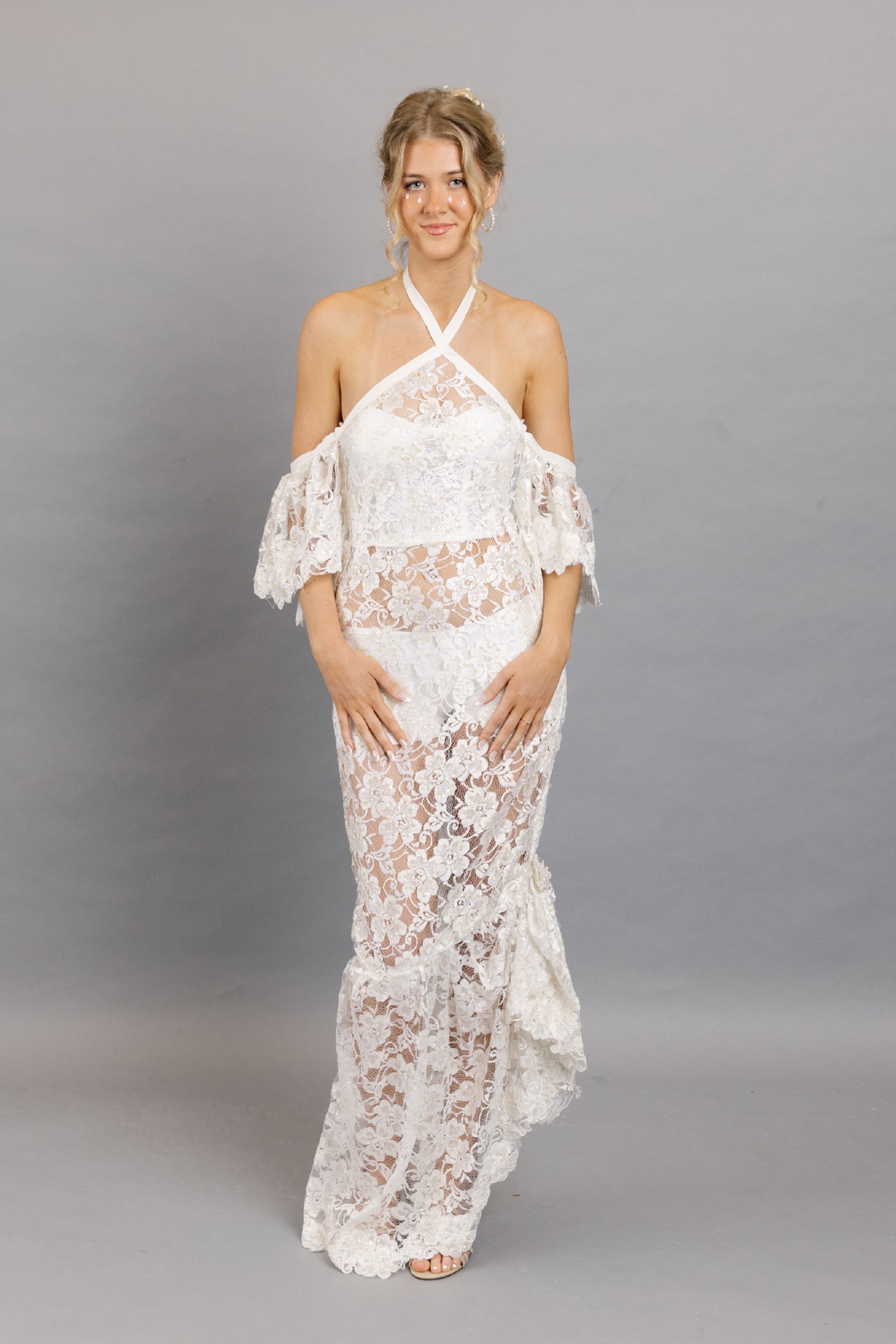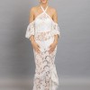 Alluring full lace gown with a halter neck and cowl back. Complete 3-piece look with stretch short and bustier corset.