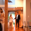 Beautiful, ethereal Billie gown in ivory by Anna Campbell with long train and slightly transparent, textured outer layer which looks incredible in photos with the light shining through the outer layer. Super flattering corset and A-line skirt, and also very comfortable and lightweight. Because the corset is short, you can still breath and relax (and eat!) while still looking slim thanks to the A-line skirt!