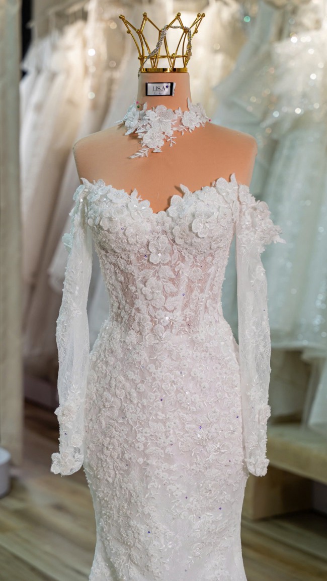 This stunning mermaid wedding dress was the centerpiece of my dream day, and now I hope it can do the same for you. With its elegant sweetheart neckline and long sleeves, it frames the shoulders beautifully while adding a hint of classic romance to the silhouette. The corset back provides an incredibly flattering fit, ensuring you feel confident and comfortable while you walk down the aisle.
