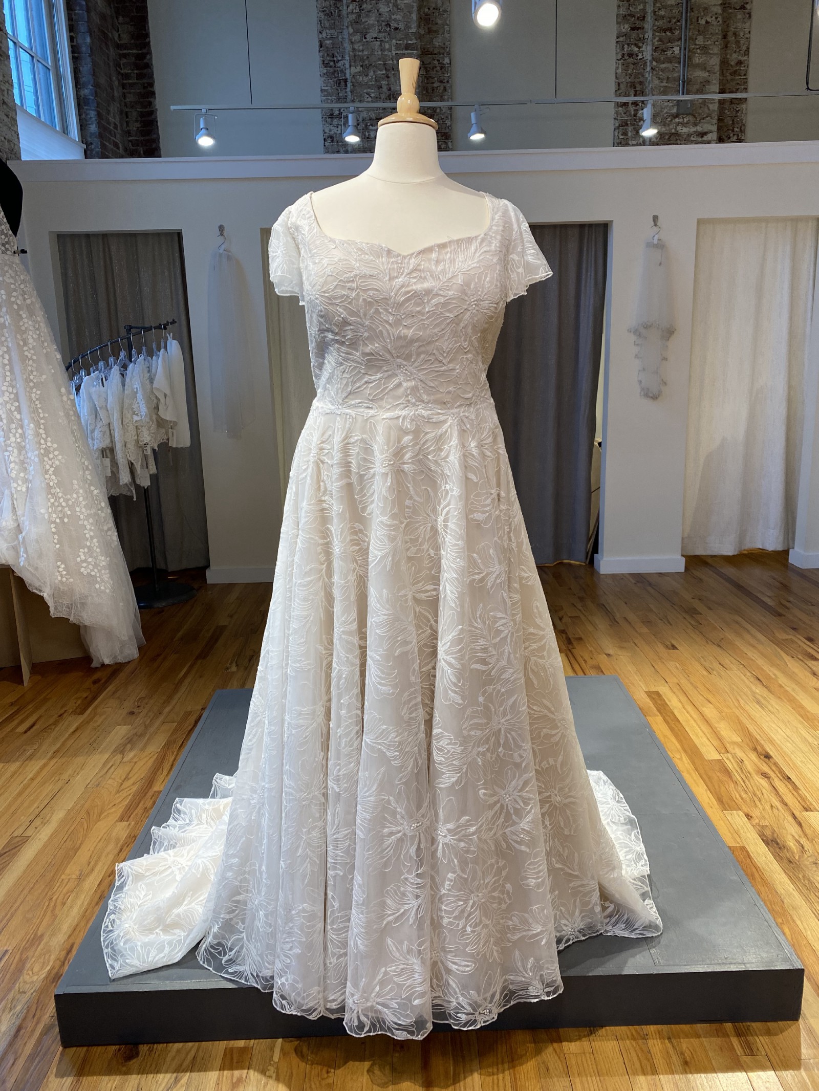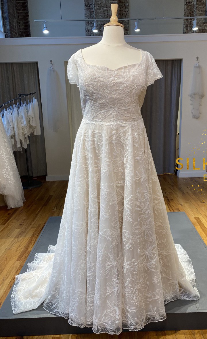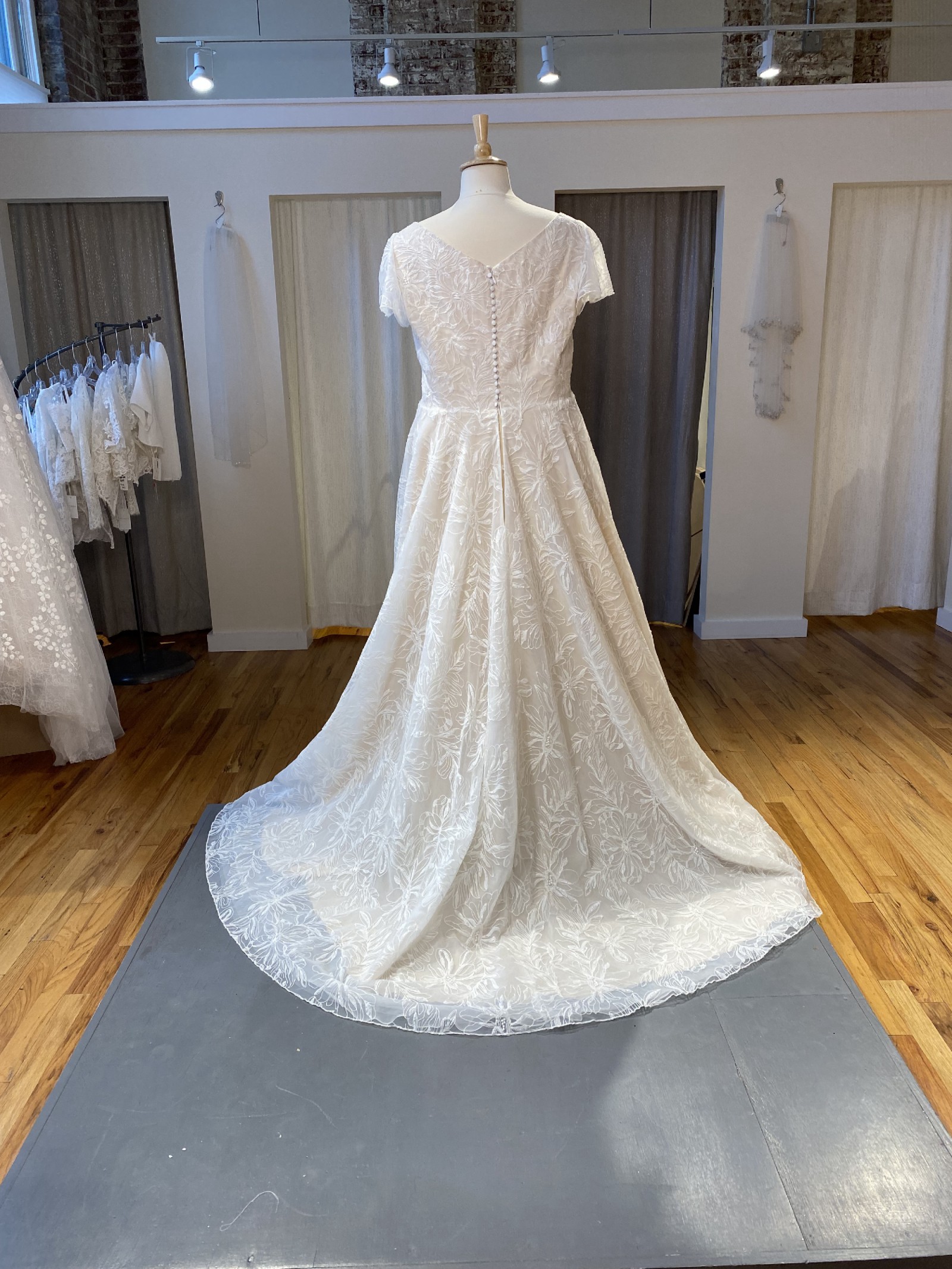Brand new only tried on 1 time. Comes with 1 yard of lace fabric that matches and 80 buttons. I also have a headpiece to go with the dress. Everything included in price.