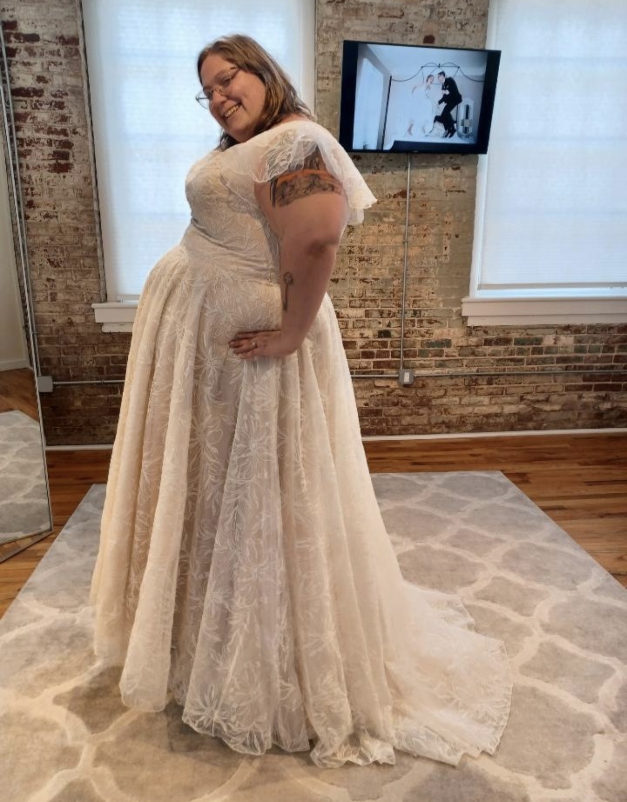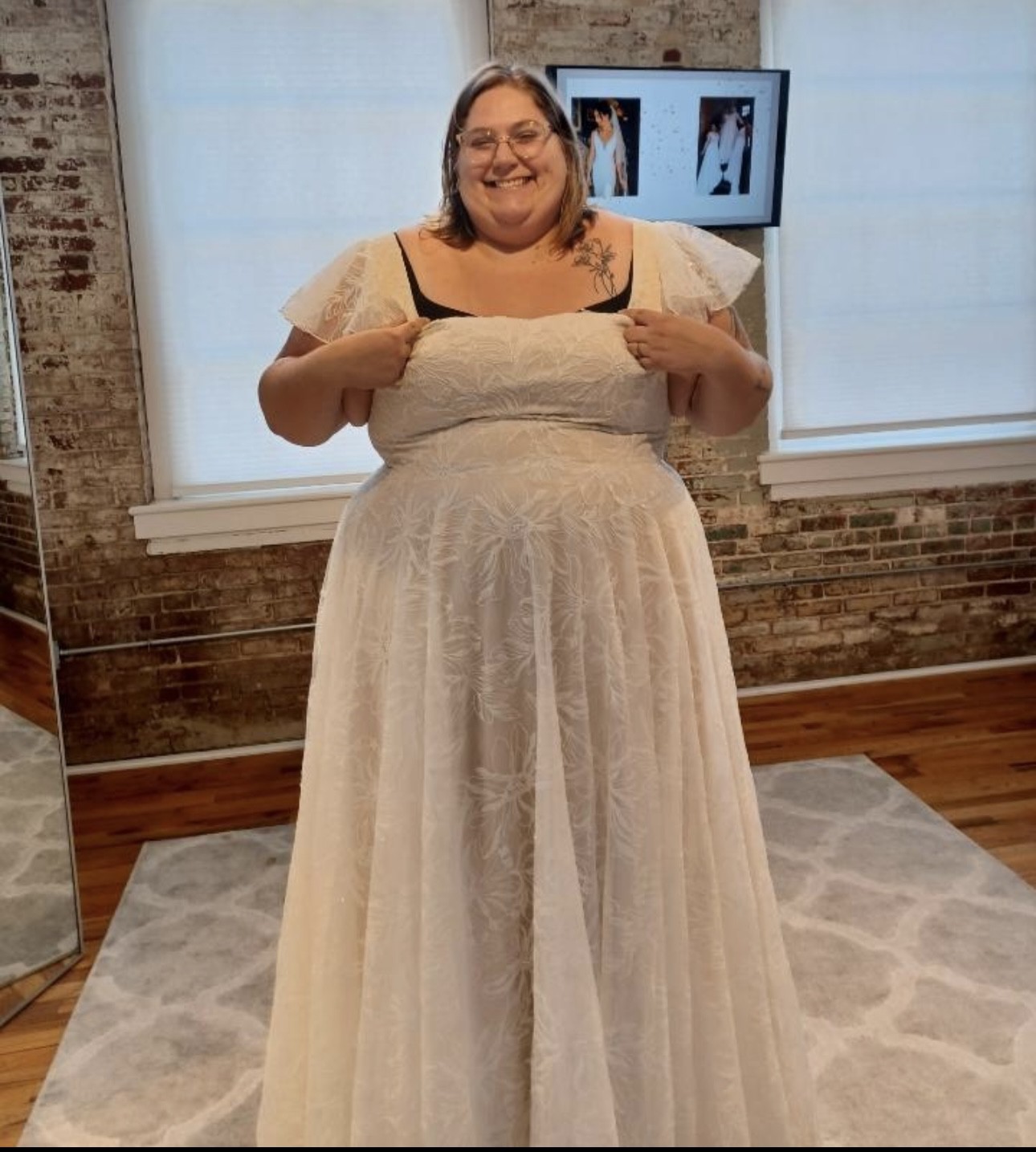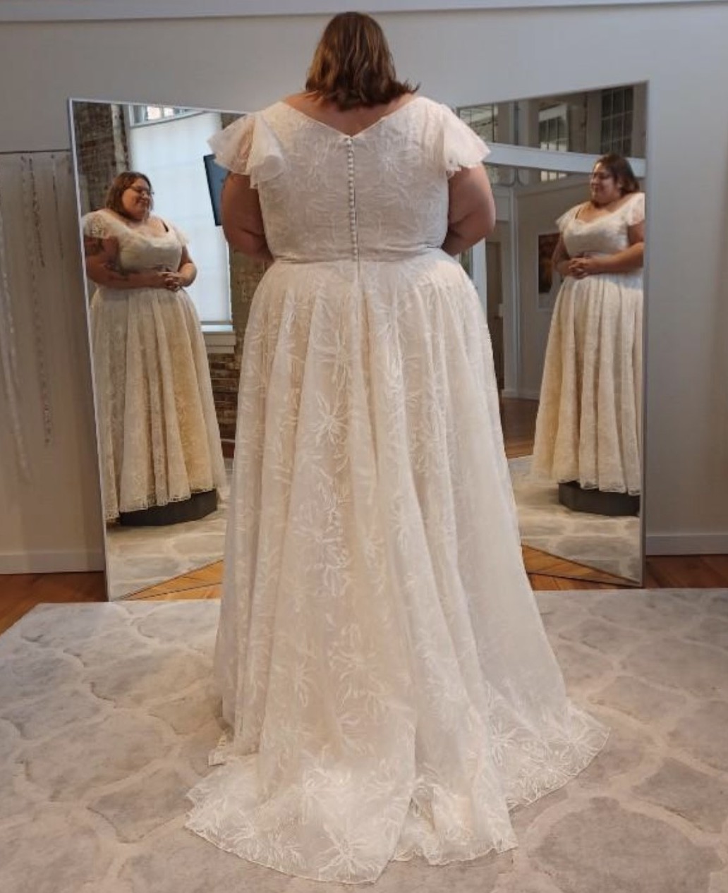 Brand new only tried on 1 time. Comes with 1 yard of lace fabric that matches and 80 buttons. I also have a headpiece to go with the dress. Everything included in price.